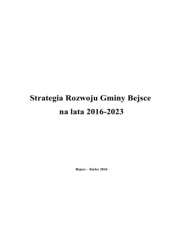 Strategia Rozwoju Gminy Bejsce na lata 2016-2023 Bejsce – Kielce 2016 Wstęp Zarządzanie gminą wiąże się z podejmowaniem wielu działań oraz decyzji ważnych dla lokalnej społeczności. Do konsekwentnego i efektywnego zarządzania gminą niezbędny jest wieloletni plan, który będzie wskazywał kierunki jej rozwoju. Głównym celem tworzenia dokumentu strategicznego, jakim jest Strategia Rozwoju Gminy Bejsce na lata 2016-2023, jest zdiagnozowanie priorytetowych kierunków rozwoju zmierzających do rozwoju społeczno-gospodarczego w tym okresie. Niniejsza strategia jest strategią średnioterminową obejmującą okres do 2023. Strategia Rozwoju Gminy Bejsce zawiera trzy podstawowe elementy tj. diagnozę sytuacji strategicznej gminy, część programująco-strategiczna i część wdrożeniową. Opracowanie strategii rozwoju gminy powstało w oparciu o analizę strategii z 2007 roku, konsultacji społecznych prowadzonych w formie ankiet kierowanych za pośrednictwem sołtysów do przedsiębiorców, przedstawicieli organizacji pozarządowych i społeczności lokalnej jak również bezpośredniego spotkania podczas Sesji Rady Gminy z władzami lokalnymi tj. Wójtem i Radnymi Gminy. Oznacza to, że w proces wyznaczania celów rozwoju społeczno-gospodarczego lokalnych społeczności włączone jest jak najszersze grono odbiorców późniejszych działań. Sprawia to, iż strategia pozwala na przedstawienie interesów lokalnej społeczności, a konsekwentnie realizowana daje mieszkańcom oraz podmiotom gospodarczym poczucie stabilizacji. Należy zauważyć, że współudział partnerów społecznogospodarczych stanowi istotny wkład w budowę społeczeństwa obywatelskiego a dokument w ten sposób zbudowany oddziałuje na szeroką grupę interesariuszy. Za sprawą dokumentu strategicznego gmina może efektywnie wykorzystać własne zasoby, w tym zasoby finansowe, rzeczowe czy społeczne, oraz określić sposoby przeciwdziałania pojawiającym się zagrożeniom. Niniejsze opracowanie strategii zawiera informacje dotyczące kierunków rozwoju Gminy Bejsce oraz działań związanych z ich realizacją do roku 2023. Horyzont czasowy, opracowania spójny jest z perspektywą finansową Unii Europejskiej na lata 2014-2020. Aby móc w pełni wykorzystać szanse, jakie dają środki unijne, należy podjąć odpowiednie działania wynikające z założonych priorytetowych kierunków rozwoju gminy powstałych przy uwzględnieniu najważniejszych dokumentów strategicznych i programowych wyższego rzędu. W przedmiotowym społecznych z dokumencie mieszkańcami opracowywaniu Strategii. przedstawiono Gminy Bejsce, których również uwagi wyniki konsultacji uwzględniono przy 1. DIAGNOZA SYTUACJI STRATEGICZNEJ GMINY BEJSCE 1.1. Położenie, powierzchnia, ludność Rys. 1. Lokalizacja gminy Bejsce na tle Polski i województwa świętokrzyskiego. Źródło: Opracowanie własne na podst. http://www.geoportal.gov.pl/ Gmina Bejsce usytuowana jest nad rzeką Nidzicą w powiecie kazimierskim w południowo-zachodniej części województwa świętokrzyskiego. Gmina znajduje się 80 km na południe od Kielc i 60 km na wschód od Krakowa. W niewielkiej odległości od gminy przebiega droga krajowa 79 a bezpośrednio przez teren gminy droga wojewódzka nr 768, połączona z siecią dróg powiatowych i gminnych. Gmina Bejsce sąsiaduje z: gminą Opatowiec (od północno – wschodniej strony), gminą Kazimierza Wielka (od północno – zachodniej strony), gminą Czarnocin (od północnej strony), gminą Koszyce (od południowej strony - województwo małopolskie). Teren gminy Bejsce położony jest w obrębie Płaskowyżu Proszowickiego. Gmina Bejsce składa się z 16 sołectw: Bejsce, Zbeltowice, Morawianki, Kijany, Grodowice, Brończyce, Czyżowice, Sędziszowie, Morawiany, Dobiesławice, Królewice, Prokocice, Kaczkowice, Uściszowice, Piotrkowice, Stojanowice. Terytorialne gmina zajmuje powierzchnię 5 748 ha (52 km2) i zamieszkiwana jest przez 4203 osób. Średnia gęstość zaludnienia wynosi 73 osób/km2 1. 1.2. Środowisko przyrodnicze Klimat Wg regionalizacji klimatycznej autorstwa A. Wosia (1999) gmina Bejsce mieści się w zasięgu północnej części Regionu Tarnowsko-Rzeszowskiego (R-XXYII). Charakterystyczne dla tego regionu jest częste pojawianie się dni bardzo ciepłych z opadem atmosferycznym (średnio 34 dni). Względnie dużą frekwencją odznaczają się dni z pogodą przymrozkową umiarkowanie chłodną (średnio 8 dni). Również dość często jest notowana pogoda przymrozkowa, bardzo chłodna i jednocześnie słoneczna bez opadu. Stosunkowo bardzo rzadko natomiast występują dni bardzo chłodne z opadem (średnio 17 dni). Również mniej tutaj dni chłodnych z dużym zachmurzeniem nieba (średnio 18 dni). Mezoklimat gminy wynika głównie z położenia w niecce wyżyny (obniżenie Wyżyny Małopolskiej, a także z bliskości Wisły przepływającej na południu w odległości ok. 1.4 km od granic gminy. Warunki topoklimatyczne są kształtowane również przez: niewielki udział terenów z płytkimi wodami gruntowymi, niskie zalesienie, wysoki udział otwartych terenów niezabudowanych i niewielką intensywność zabudowy, urozmaicenie rzeźby terenu. 1 GUS, stan na 3.12.2014 r. Gminę charakteryzują korzystne warunki termiczne wynikające z lokalizacji w zasięgu umiarkowanie ciepłego piętra klimatycznego: średnia temperatura powietrza w lipcu 18oC, a w styczniu -3oC, średnie opady roczne – 540 mm, maksimum opadów w ciągu roku przypada na miesiące letnie – 765 mm, a minimum w okresie zimowym – 410 mm, średnia ilość dni pogodnych – 62, średnia ilość dni pochmurnych – 122, średnia liczba dni z pokrywą śnieżną –80, średnia długość okresu wegetacyjnego – 210 – 220 dni, średnia długość trwania zimy – 92 dni, średnia długość trwania lata – 91 dni. Warunki wodne Większa część gminy znajduje się w zlewni Nidzicy, pozostały północny 