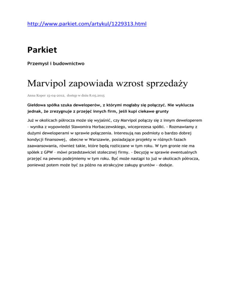 http://www.parkiet.com/artykul/1229313.html Parkiet Przemysł i budownictwo Marvipol zapowiada wzrost sprzedaży Anna Koper 15-04-2012, dostęp w dniu 8.05.2015 Giełdowa spółka szuka deweloperów, z którymi mogłaby się połączyć. Nie wyklucza jednak, że zrezygnuje z przejęć innych firm, jeśli kupi ciekawe grunty Już w okolicach półrocza może się wyjaśnić, czy Marvipol połączy się z innym deweloperem – wynika z wypowiedzi Sławomira Horbaczewskiego, wiceprezesa spółki. - Rozmawiamy z dużymi deweloperami w sprawie połączenia. Interesują nas podmioty o bardzo dobrej kondycji finansowej, obecne w Warszawie, posiadające projekty w różnych fazach zaawansowania, również takie, które będą rozliczane w tym roku. W tym gronie nie ma spółek z GPW – mówi przedstawiciel stołecznej firmy. - Decyzję w sprawie ewentualnych przejęć na pewno podejmiemy w tym roku. Być może nastąpi to już w okolicach półrocza, ponieważ potem może być za późno na atrakcyjne zakupy gruntów - dodaje.