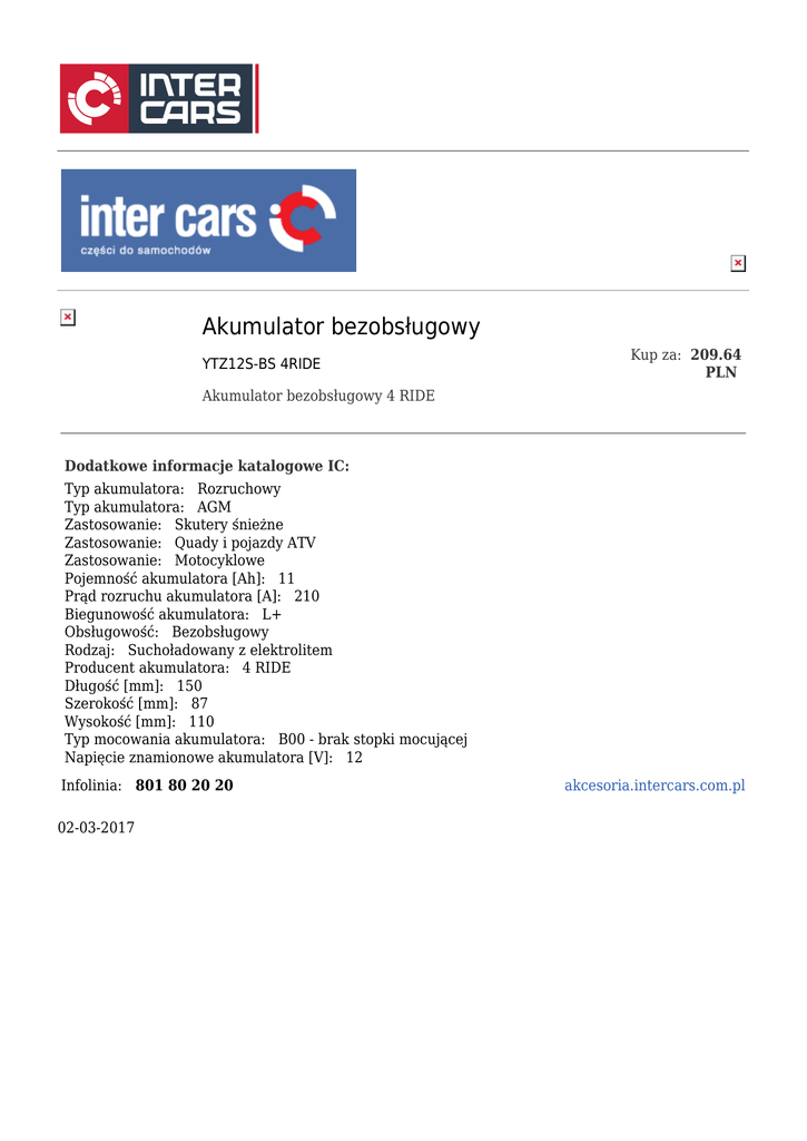 Akumulator bezobsługowy YTZ12S-BS 4RIDE Kup za: 209.64 PLN Akumulator bezobsługowy 4 RIDE Dodatkowe informacje katalogowe IC: Typ akumulatora: Rozruchowy Typ akumulatora: AGM Zastosowanie: Skutery śnieżne Zastosowanie: Quady i pojazdy ATV Zastosowanie: Motocyklowe Pojemność akumulatora [Ah]: 11 Prąd rozruchu akumulatora [A]: 210 Biegunowość akumulatora: L+ Obsługowość: Bezobsługowy Rodzaj: Suchoładowany z elektrolitem Producent akumulatora: 4 RIDE Długość [mm]: 150 Szerokość [mm]: 87 Wysokość [mm]: 110 Typ mocowania akumulatora: B00 - brak stopki mocującej Napięcie znamionowe akumulatora [V]: 12 Infolinia: 801 80 20 20 02-03-2017 akcesoria.intercars.com.pl