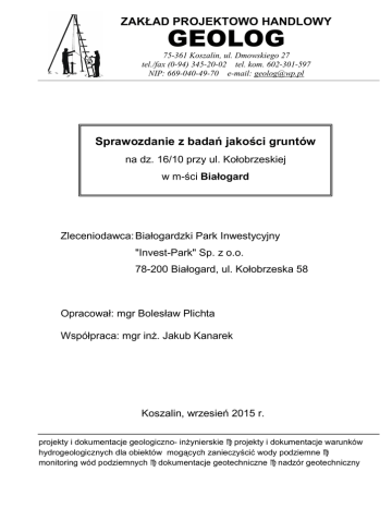 ZAKŁAD PROJEKTOWO HANDLOWY GEOLOG 75-361 Koszalin, ul. Dmowskiego 27 tel./fax (0-94) 345-20-02 tel. kom. 602-301-597 NIP: 669-040-49-70 e-mail: [email protected] Sprawozdanie z badań jakości gruntów na dz. 16/10 przy ul. Kołobrzeskiej w m-ści Białogard Zleceniodawca: Białogardzki Park Inwestycyjny "Invest-Park" Sp. z o.o. 78-200 Białogard, ul. Kołobrzeska 58 Opracował: mgr Bolesław Plichta Współpraca: mgr inż. Jakub Kanarek Koszalin, wrzesień 2015 r. projekty i dokumentacje geologiczno- inżynierskie c projekty i dokumentacje warunków hydrogeologicznych dla obiektów mogących zanieczyścić wody podziemne c monitoring wód podziemnych c dokumentacje geotechniczne c nadzór geotechniczny 1 I. WSTĘP Niniejsze sprawozdanie wykonano na zlecenie Białogardzkiego Parku Inwestycyjnego "Invest-Park" Sp. z o.o., z siedzibą 78-200 Białogard, ul. Kołobrzeska 58. Celem opracowania jest określenie jakości środowiska gruntowego na dz. 16/10 przy ul. Kołobrzeskiej w m-ści Białogard. Na działce planuje się posadowienie hali (projektowane zagospodarowanie przedstawiono na mapie dokumentacyjnej w skali 1:500 – załącznik nr 1). Ocenę jakości gruntów wykonano w oparciu o rozporządzenie Ministra Środowiska z dnia 9.09.2002 r. w sprawie standardów jakości gleby oraz standardów jakości ziemi (Dz. U. nr 165 z dnia 4.10.2002 r., poz. 1359). II. ZAKRES PRAC 2.1. Prace polowe W ramach prac polowych, na badanej działce, wykonano 7 płytkich małośrednicowych otworów badawczych do głębokości 2,0 m przy użyciu szapy wiertniczej φ70 mm. Lokalizacja i głębokość otworów zostały ustalone z Inwestorem. Prace polowe realizowano w dniu 9.09.2015 r. W trakcie wierceń prowadzono ciągłe badania makroskopowe przewiercanych gruntów i pobierano próbki gruntu do badań laboratoryjnych. Po nawierceniu wód gruntowych prowadzono dokładne badania stabilizacji zwierciadła wody w otworach, do czasu uzyskania trzech jednakowych pomiarów w odstępach 10 min. Prace i badania terenowe prowadzono zgodnie z wymogami PN-B-04452:2002: „Geotechnika. Badania polowe”, między innymi w zakresie makroskopowych badań gruntu, prowadzenia sondowań oraz pomiarów zwierciadła wody gruntowej w wyrobiskach badawczych. 2.2. Prace geodezyjne Otwory badawcze wyznaczono w terenie na podstawie mapy sytuacyjno–wysokościowej w skali 1:500, metodą domiarów prostokątnych 2 dowiązanych do punktów stałych w terenie. Przy wytyczaniu otworów wykorzystano również odbiornik GPS oraz współrzędne geograficzne w układzie WGS84 obliczone na podstawie współrzędnych geograficznych w układzie 2000. Po zakończeniu badań, zaniwelowano rzędne powierzchni terenu w miejscach wierceń w nawiązaniu do państwowego układu wysokościowego. Za punkt odniesienia przyjęto rzędną studzienki kanalizacyjnej o wysokości 26,25 m n.p.m. 2.3. Badania laboratoryjne Z każdego otworu pobrano po 1 próbce z głębokości w przelocie od 1,0 do 2,0 m. Próbki przesłano do Laboratorium Analiz Środowiskowych DM z siedzibą przy ul. Opolskiej 140 w m-ści Wrocław (kod: 52-014), gdzie wykonano oznaczenia stężenia substancji ropopochodnych: benzyn (węglowodory C6-12) i olei mineralnych (węglowodory C12-36), zawartości związków aromatycznych (BTEX) oraz metali ciężkich: cynku, ołowiu, miedzi, chromu, niklu i kadmu (Zn, Pb, Cu, Cr, Ni, Cd). 2.4. Prace kameralne W ramach prac kameralnych wykonano: − mapę dokumentacyjną w skali 1:500, na której zaznaczono planowane zagospodarowanie terenu oraz miejsca wykonywanych otworów badawczych i lokalizację reperu roboczego (załącznik nr 1), − karty dokumentacyjne otworów (załączniki nr 2.1 – 2.3), − objaśnienia symboli geologicznych na kartach otworów (załącznik nr 3) − część tekstową, którą opracowano w oparciu o wyniki wykonanych prac i badań, materiały archiwalne, dane z literatury oraz aktualne wytyczne i rozporządzenia. III. POŁOŻENIE I RZEŹBA TERENU Badana działka położona jest w Białogardzie przy ul. Kołobrzeskiej, po prawej stronie jadąc w kierunku Kołobrzegu. Działka jest niezagospodarowana 3 i obecnie stanowi nieużytek. Rejon badań sąsiaduje z wybudowanym niedawno Inkubatorem Technologicznym, położonym przy ul. Kołobrzeskiej 56. Teren jest stosunkowo płaski – rzędne terenu w miejscach wierceń wahają się w granicach od 26,2 do 26,7 m n.p.m. Wzdłuż południowej granicy działki przebiega rów melioracyjny. Badana działka leży poza obszarami chronionymi1. IV. BUDOWA GEOLOGICZNA I WARUNKI WODNE Budowa geologiczna została rozpoznana podczas badań prowadzonych w czerwcu 2011 r.2 i lutym 2013 r.3 Pod względem geomorfologicznym jest to fragment tarasu nadzalewowego rzeki Parsęty. Budowa geologiczna jest tu prosta. W podłożu, do zbadanej głębokości 5,0 m, stwierdzono występowanie utworów czwarto-rzędowych wieku holoceńskiego i plejstoceńskiego. Przypowierzchniową warstwę stanowi warstwa gleby z piaskami próchnicznymi o miąższości od 0,3 do 0,9 m. Miejscami, dolną warstwę gleby stanowi tzw. orsztyn (rudawiec). Na części terenu nawiercono także grunty pochodzenia antropogenicznego, powstałe w wyniku zasypania wyrobiska piasku, który był wydobywany w trakcie budowy pierwszego budynku Inkubatora Technologicznego. Plejstocen jest wykształcony w postaci niżej nawierconych piasków drobnych z lokalnymi przewarstwieniami pyłów piaszczystych. Są to utwory akumulacji wodnolodowcowej, które nie zostały przewiercone. Wodę gruntową, o swobodnym zwierciadle, nawiercono w obrębie piasków na głębokościach od 0,9 do 1,2 m, co odpowiada rzędnym od 25,5 do 25,3 m n.p.m. Rzędne obecnych zwierciadeł przedstawiono w części graficznej na mapie dokumentacyjnej (załącznik nr 1). 1 zgodnie z danymi zaczerpniętymi z portalu http://geoserwis.gdos.gov.pl Dokumentacja geotechnicznych warunków posadowienia dla projektu rozbudowy Inkubatora Technologicznego na dz. 16/1 i 16/3 p