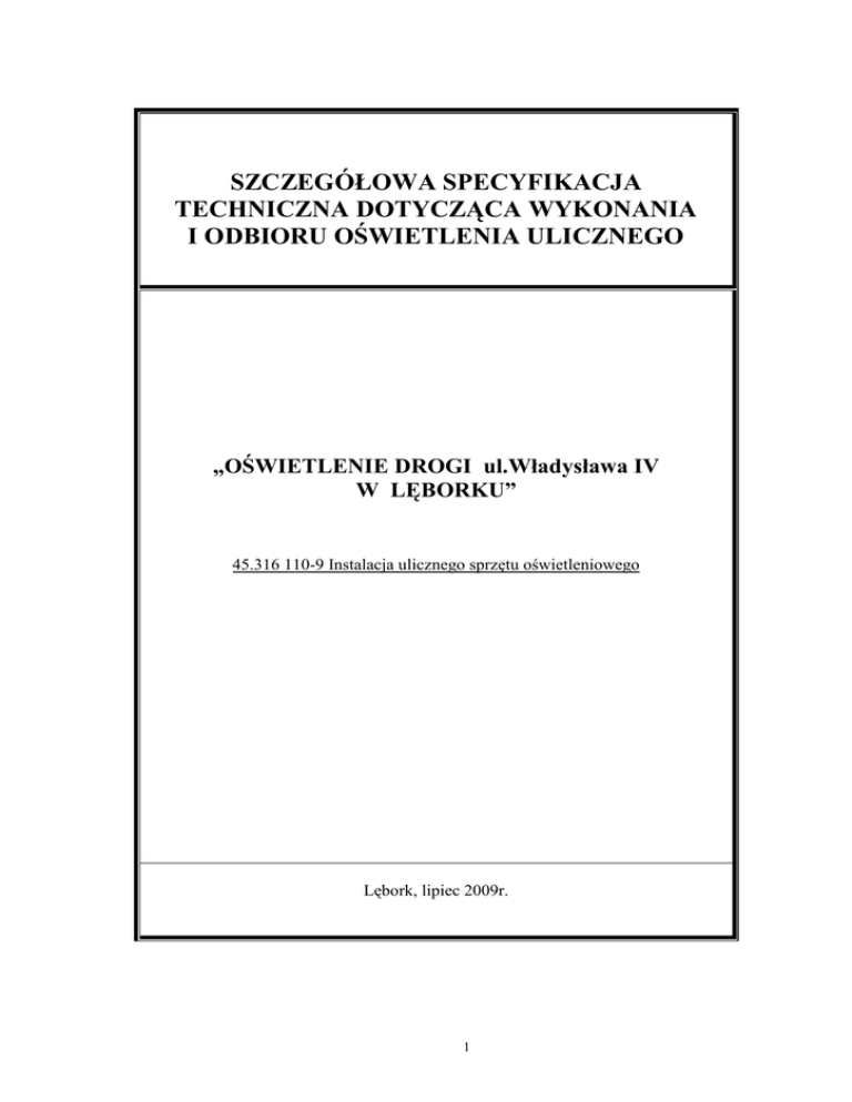 SZCZEGÓŁOWA SPECYFIKACJA TECHNICZNA DOTYCZĄCA WYKONANIA I ODBIORU OŚWIETLENIA ULICZNEGO „OŚWIETLENIE DROGI ul.Władysława IV W LĘBORKU” 45.316 110-9 Instalacja ulicznego sprzętu oświetleniowego Lębork, lipiec 2009r. 1 Oświetlenie drogi. Linia kablowa oświetleniowa 1. Wstęp 1.1. Przedmiot Szczegółowej Specyfikacji Technicznej Przedmiotem niniejszej SST są wymagania dotyczące wykonania i odbioru oświetlenia drogowego – drogi ul. Władysława IV dz 82,147/2,147/5 obr.11 w Lęborku. 1.2. Zakres stosowania SST Specyfikacja Techniczna jest stosowana jako dokument przetargowy i kontraktowy przy zleceniu i realizacji robót wymienionych w punkcie 1.1. 1.3. Zakres robót objętych SST Ustalenia zawarte w niniejszej SST dotyczą zasad prowadzenia robót przy budowie oświetlenia obejmujących wszystkie czynności umoŜliwiające i mające na celu wykonanie i podłączenie pod napięcie projektowanego odcinka oświetlenia drogi ul. Władysława IV w nawiązaniu do opracowania zawartego w projekcie budowlanym .Budowa obejmuje wykonanie następujących robót elektrycznych: 1. Ustawienie słupów blaszanych typu ORION prod. „VALMONT” Polska (Siedlce) (z wysięgnikami) o wysokości 9 m i oprawami typu OUSb „Elgo” ze źródłem światła sodowym o mocy 70 W Philips. 2. Wykonanie nowoprojektowanego odcinka linii kablowej oświetlenia kablem typu YAKY 4x25 mm2 + drut ocynkowany φ 6 od istniejącego słupa przy stacji T-234 oświetleniowej linii kablowej zasilanej ze stacji transformatorowej T-390 sterowanego z linii oświetlenia ulicznego ul. Kościuszki obwodu nr 900 .Przyłącze projektowanej linii z istniejącego słupa obok stacji T-234 na ul. Władysława IV 3. Zabezpieczenie proj. kabli przy zbliŜeniach i skrzyŜowaniach z drogą, innymi urządzeniami podziemnymi rurą ochronną DVK lub dwudzielną PS (istn. kable) firmy AROT φ 75. Dopuszcza się zastosowanie rur AROT φ 75 mm ciśnieniowych typu SRS pod jezdnią. 1.4. Określenia podstawowe 1.4.1. Słup oświetleniowy – konstrukcja wsporcza osadzona w gruncie za pomocą fundamentu, słuŜąca do zamocowania oprawy oświetleniowej na wysokości nie większej niŜ 9 m. 1.4.2. Wysięgnik – element rurowy łączący słup oświetleniowy z oprawą lub znakiem ( w tym rozwiązaniu nie ma zastosowania). 1.4.3. Oprawa oświetleniowa – urządzenie słuŜące do rozdziału, filtracji i przekształcania strumienia świetlnego wysyłanego przez źródło światła zawierające wszystkie niezbędne detale do przymocowania i połączenia z instalacją elektryczną. 1.4.4. Kabel – przewód wieloŜyłowy izolowany, przystosowany do przewodzenia prądu elektrycznego, mogący pracować pod ziemią. 1.4.5. Ustój – rodzaj fundamentu dla słupów oświetleniowych. 1.4.6. Fundament – konstrukcja Ŝelbetowa zagłębiona w ziemi, słuŜąca do utrzymania słupa oświetleniowego, pod znak lub szafy oświetleniowej w pozycji pracy. 1.4.7. Szafa oświetleniowa – urządzenie rozdzielczo – sterownicze bezpośrednio zasilające instalacje oświetleniowe. 2 1.4.8. Linia kablowa – kabel wieloŜyłowy lub wiązka kabli jednoŜyłowych w układzie wielofazowym, albo kilka kabli jedno – lub wieloŜyłowych połączonych równolegle, łącznie z osprzętem, ułoŜone na wspólnej trasie i łączące zaciski tych samych dwóch urządzeń jedno lub wielofazowych. 1.4.9. Trasa kablowa – pas terenu, w którym ułoŜone są jedna lub więcej linii kablowych. 1.4.10. Osprzęt linii kablowej – mufa kablowa – zbiór elementów przeznaczonych do łączenia lub zakańczania kabli oraz ochrony i połączenia dwóch odcinków linii kabli energetycznych. 1.4.11. Przykrycie – osłona ułoŜona nad kablem w celu ochrony przed mechanicznym uszkodzeniem od góry. 1.4.12. Przepust kablowy – konstrukcja o przekroju okrągłym przeznaczona do ochrony kabla przed uszkodzeniami mechanicznymi, chemicznymi i działaniem łuku elektrycznego. 1.4.13. Dodatkowa ochrona przeciwporaŜeniowa – ochrona części przewodzących, dostępnych w wypadku pojawienia się na nich napięcia w warunkach zakłóceniowych. 2. Materiały Ogólne wymagania dotyczące materiałów, ich pozyskiwania i składowania podano w niniejszej specyfikacji. Wszystkie zakupione przez wykonawcę materiały, dla których normy PN i BN przewidują posiadanie atestu lub zaświadczenia jakości powinny być zaopatrzone w taki dokument przez producenta. 2.1. Cement Do wykonania zagęszczenia gruntu pod słupy oświetleniowe zaleca się stosowanie cementu portlandzkiego klasy 32,5 bez dodatków, spełniającego wymagania PN- B- 19701. Cement powinien być dostarczony w opakowaniach spełniających wymagania BN-88/673108 i składowany w dobrze wentylowanych, suchych i zadaszonych pomieszczeniach. Cement moŜe być równieŜ dostarczony luzem i przechowywany w silosach. 2.2. Piasek Piasek do układania kabli w ziemi i zagęszczania gruntu przy ustojach pod słupy oświetleniowe powinien spełniać wymagania PN-B-11113. 2.3. Woda Woda powinna być „odmiany 1”, zgodnie z wymaganiami PN-B-32250. Barwa wody powinna odpowiadać barwie wody wodociągowej; woda nie powinna wydzielać zapachu gnilnego oraz nie powinna zawierać zawiesin np. grudek. 2.4. Folia Folię stosować do ochrony kabli przed uszkodzeniami mechanicznymi Zaleca się zastosowanie folii kalandrowej z uplastycznionego PCW koloru niebieskiego o grub. 0,5 mm, gat. I. Dla ochrony kabli o napięciu znamionowym do 1 kV naleŜy zastosować folię koloru niebieskiego. Szerokość folii taka, by przykrywała kable, nie większa niŜ 20 cm. Folia powinna spełniać wymagania BN-68/6353-03. 2.5. Kit uszczelniający Do uszczelniania połączenia słupa z wysięgnikiem i kapturkiem osłonowym moŜna stosować wszelkie rodzaje kitów spełniające wymagania BN-80/3112-28. 2.6. Fundamenty pod słupy stalowe 3 Pod słupy oświetleniowe stalowe blaszane zaleca się stosowanie fundamentów gruntowych prefabrykowanych typu F120/40. Og