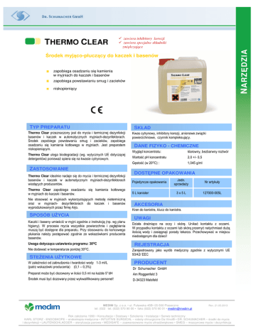 zawiera inhibitory korozji zawiera specjalne składniki zmiękczające N ARZĘDZIA THERMO CLEAR Środek myjąco-płuczący do kaczek i basenów zapobiega osadzaniu się kamienia w myjniach do kaczek i basenów zapobiega powstawianiu smug i zacieków niskopieniący TYP PREPARATU SKŁAD Thermo Clear przeznaczony jest do mycia i termicznej dezynfekcji basenów i kaczek w automatycznych myjniach-dezynfektorach. Środek zapobiega powstawaniu smug i zacieków, zapobiega osadzaniu się kamienia kotłowego w myjniach. Jest preparatem niskopieniącym. Thermo Clear ulega biodegradacji (wg. wytycznych UE dotyczącej detergentów) ponieważ opiera się na kwasie cytrynowym. ZASTOSOWANIE Thermo Clear idealnie nadaje się do mycia i termicznej dezynfekcji basenów i kaczek w automatycznym myjniach-dezynfektorach wiodących producentów. Thermo Clear zapobiega osadzaniu się kamienia kotłowego w myjniach do kaczek i basenów. Nie stosować w myjniach wykorzystujących metodę nietermiczną oraz w myjniach- dezynfektorach do kaczek i basenów wyprodukowanych przez firmę Arjo. SPOSÓB UŻYCIA Kaczki i baseny umieścić w myjni zgodnie z instrukcją (np. wg planu higieny). W procesie mycia wszystkie powierzchnie i zagłębienia muszą być dostępne dla preparatu. Przy stosowaniu do końcowego płukania należy postępować zgodnie ze wskazówkami producenta basenów. Uwaga dotycząca ustawienia programu: 30OC Nie dodawać w temperaturze poniżej 30OC. Kwas cytrynowy, inhibitory korozji, anionowe związki powierzchniowe, czynnik kompleksujący. DANE FIZYKO - CHEMICZNE Wygląd koncentratu: klarowny, bezbarwny roztwór Wartość pH koncentratu 2,0 +/- 0,5 Gęstość (w 20OC) : 1,045 g/ml DOSTĘPNE OPAKOWANIA Pojedyncze opakowania 5 L kanister Jedn. sprzedaży Nr artykuły 3x5L 127000-005L AKCESORIA Kran do kanistra, klucz do kanistra. UWAGI Działa drażniąco na oczy i skórę. Unikać kontaktu z oczami. W przypadku kontaktu z oczami lub skórą przemyć natychmiast dużą ilością wody i zasięgnąć porady lekarza. Przechowywać w miejscu niedostępnym dla dzieci! REJESTRACJA Zarejestrowany jako wyrób medyczny zgodnie z wytycznymi UE 93/42/ EEC STĘŻENIA UŻYTKOWE W zależności od zabrudzenia i twardości wody 1-3 ml/L (patrz wskazówki producenta) (0,1 – 0,3%) PRODUCENT Dr Schumacher GmbH Preparat może być dozowany w ilości 0,5 ml na każde 5°dH Am Roggenfeld 3 Środek musi być dozowany przez wykwalifikowany personel! D-34323 Malsfeld MEDIM Sp. z o.o. • ul. Puławska 45B• 05-500 Piaseczno tel. (022 tel. (022) 570 90 00 • faks (022) 570 90 01 • [email protected] Rev. 21.05.2013 Rok założenia 1990 • Konsultacje • Dostawy • Szkolenia • Instalacje • Serwis techniczny KARL STORZ - ENDOSKOPE – endoskopia medyczna • INTUITIVE SURGICAL – roboty chirurgiczne Da Vinci® • DR. SCHUMACHER – środki do mycia i dezynfekcji • LAUTENSCHLAEGER – sterylizacja parowa • MEDISAFE – zaawansowane mycie ultradźwiękowe • SMEG – maszynowe mycie i dezynfekcja