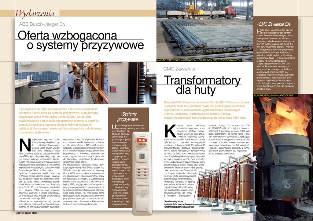 Wydarzenia »CMC Zawiercie SA« ABB Busch-Jaeger Oy H Oferta wzbogacona o systemy przyzywowe Magazyn wyrobów gotowych – załadunek prętów żebrowanych CMC Zawiercie Transformatory dla huty Z początkiem sierpnia ABB przejmuje całą odpowiedzialność handlową i serwisową za systemy przyzywowe, produkowane dotychczas przez firmę Ensto Busch-Jaeger. Grupa ABB powiększyła się o doskonale prosperującą fabrykę, a portfolio produktów niskiego napięcia dla budynków użyteczności publicznej oferowanych przez spółkę wzbogaci się o dodatkowe rozwiązania systemowe. Fot. na kolumnach: Arch. ABB; CMC Zawiercie SA; Ensto Pol; ABB Busch-Jaeger Oy N a początku tego roku udziałowcy fińskiej fabryki osprzętu elektroinstalacyjnego, a więc Ensto Busch-Jaeger (79 proc. udziałów) oraz ABB (21 proc.) doszli do porozumienia i firma ABB objęła cały pakiet akcji, stając się tym samym jedynym właścicielem fabryki. Była to naturalna konsekwencja wieloletniej współpracy, która polegała m.in. na ścisłym współdziałaniu tej fabryki z zakładem ABB Busch-Jaeger Elektro w Niemczech. Systemy przyzywowe marki Ensto są w Polsce bardzo dobrze znane i szacuje się, że spółce udało się opanować przeszło 30 proc. rynku. Dotychczas przedstawicielem producenta na nasz kraj była firma Ensto Pol ze Straszyna, natomiast od 1 sierpnia 2009 roku całą odpowiedzialność, zarówno w sferze marketingu, jak i sprzedaży oraz obsługi gwarancyjnej i serwisowej przejmuje ABB. – Systemy te wykorzystuje się przede wszystkim w budynkach użyteczności publicznej, na przykład w toaletach dla niepeł- 4 Dzisiaj Lipiec 2009 nosprawnych oraz w szpitalach, klinikach czy domach opieki społecznej – tłumaczy Krzysztof Żurek z ABB, szef biznesu Osprzętu Elektroinstalacyjnego i Systemów KNX, w ofercie którego znajdą się systemy przyzywowe. – Ponieważ jesteśmy dostawcą systemów automatyki i elektroniki dla budynków, rozwiązania te doskonale uzupełniają naszą ofertę. Po sfinalizowaniu transakcji fińska fabryka przyjęła nazwę ABB Busch-Jaeger Oy. Właśnie trwa jej wdrażanie w struktury Grupy ABB ze wszystkimi konsekwencjami jakościowymi i bezpieczeństwa pracy. Na szczęście, w związku z wcześniejszą, bardzo ścisłą współpracą z niemiecką fabryką ABB, wygląd elementów systemu przyzywowego został przystosowany do linii osprzętu elektroinstalacyjnego oferowanego przez Grupę. Tak więc dzisiaj oferta spółki jest w pełni zintegrowana, a systemy przyzywowe są nie tylko skuteczne, ale także estetyczne i oferowane w kilku wariantach wzorniczych i kolorystycznych. »Systemy przyzywowe« U możliwiają natychmiastowe wezwanie pomocy w szpitalach, klinikach czy domach pomocy społecznej. Sygnalizacja pojawia się równolegle w dwóch miejscach – u dyżurującego lekarza lub pielęgniarki, albo u dyspozytora systemu, a także nad drzwiami pomieszczenia, w którym znajduje się osoba potrzebująca pomocy. System jest analogowy, więc nie wymaga oprogramowania, co zwiększa jego niezawodność. Poza tym, mogą go montować instalatorzy bez specjalistycznego przygotowania. uta CMC Zawiercie jest trzecim co do wielkości producentem stali w Polsce i najmłodszym członkiem grupy Commercial Metals Company. Ma dwa piece elektryczne, których łączna wydajność sięga 1,3 mln ton, walcownię prętów i walcówki. Wszystkie produkty są wysyłane głównie do odbiorców krajowych, jednak – dzięki wejściu w struktury międzynarodowe – w coraz większym stopniu na rynki zagraniczne. Dzięki zastosowaniu w CMC Zawiercie SA najnowocześniejszych rozwiązań technologicznych i konstrukcyjnych możliwa stała się realizacja rygorystycznych wymagań projektantów i konstruktorów dotyczących parametrów technicznych i jakości wykonania prętów zbrojeniowych, konstrukcyjnych i do dalszego przetwórstwa. Elektrostalownia – piecokadź Huta stali CMC Zawiercie zamówiła w firmie ABB 14 transformatorów, niezbędnych do uruchomienia nowej linii produkcyjnej. Realizacja tego kontraktu umożliwi hucie wyprodukowanie dodatkowych 700 tys. ton prętów i kształtowników rocznie. Dostawy transformatorów mają być zrealizowane do końca lipca 2009 roku. K ontrakt został podpisany w kwietniu tego roku, a zakończenie dostaw przewidziano w nim na lipiec 2009. I właśnie możliwość wywiązania się ze zlecenia w tak krótkim czasie była jednym z powodów rozstrzygnięcia przetargu na korzyść ABB. Ponadto ABB zagwarantowała dostawę transformatorów w całym wymaganym zakresie mocy od 1000 do 7000 kVA. Dodatkowo spółka przedłożyła kompleksową i optymalną ofertę pod względem technicznym i handlowym. Nie bez znaczenia pozostawały także dotychczasowe dobre relacje obu przedsiębiorstw. Transformatory ABB pracują obecnie zarówno w Zawierciu, jak i w innych spółkach należących do grupy CMC. Ich niezawodność była najlepszą rekomendacją. Podpisany kontrakt, o łącznej wartości około 5 mln zł, przewiduje dostawę 14 transformatorów przekształtnikowych, czyli przystosowanych do pracy z układami przekształtni- kowymi, z czego 10 o mocach od 1000 do 3150 kVA trafiło do huty już w czerwcu, natomiast 4 pozostałe o mocy 7000 kVA będą dostarczone do końca lipca. Poza tym inżynierowie i serwisanci z ABB będą uczestniczyć w przeprowadzeniu rozruchu zimnego, w czasie którego zostanie potwierdzony prawidłowy montaż urządzeń. Rozruch i zakończenie kontraktu z CMC Zawiercie przewidziane są najpóźniej na 30 listopada 2009 roku. Transformatory suche żywiczne dużej mocy wykonane w technologii próżniowej Cast Coil. Lipiec 2009 Dzisiaj 5