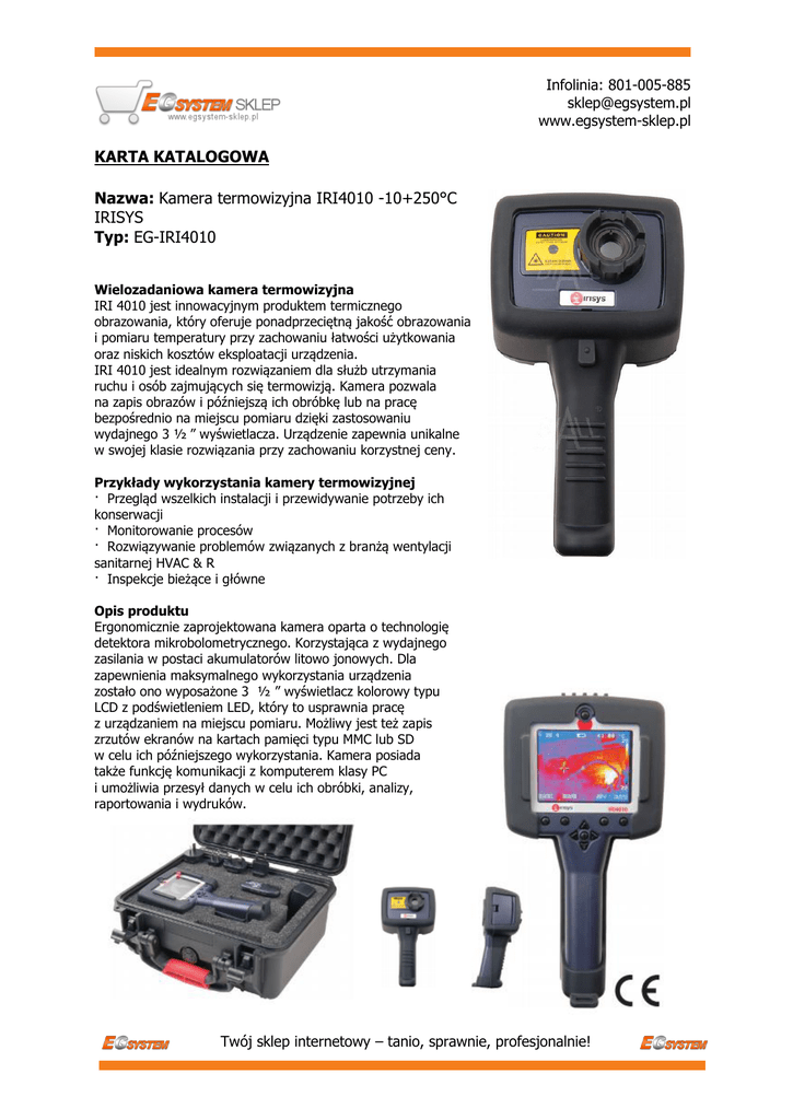 Infolinia: 801-005-885 [email protected] www.egsystem-sklep.pl KARTA KATALOGOWA Nazwa: Kamera termowizyjna IRI4010 -10+250°C IRISYS Typ: EG-IRI4010 Wielozadaniowa kamera termowizyjna IRI 4010 jest innowacyjnym produktem termicznego obrazowania, który oferuje ponadprzeciętną jakość obrazowania i pomiaru temperatury przy zachowaniu łatwości użytkowania oraz niskich kosztów eksploatacji urządzenia. IRI 4010 jest idealnym rozwiązaniem dla służb utrzymania ruchu i osób zajmujących się termowizją. Kamera pozwala na zapis obrazów i późniejszą ich obróbkę lub na pracę bezpośrednio na miejscu pomiaru dzięki zastosowaniu wydajnego 3 ½ ” wyświetlacza. Urządzenie zapewnia unikalne w swojej klasie rozwiązania przy zachowaniu korzystnej ceny. Przykłady wykorzystania kamery termowizyjnej · Przegląd wszelkich instalacji i przewidywanie potrzeby ich konserwacji · Monitorowanie procesów · Rozwiązywanie problemów związanych z branżą wentylacji sanitarnej HVAC & R · Inspekcje bieżące i główne Opis produktu Ergonomicznie zaprojektowana kamera oparta o technologię detektora mikrobolometrycznego. Korzystająca z wydajnego zasilania w postaci akumulatorów litowo jonowych. Dla zapewnienia maksymalnego wykorzystania urządzenia zostało ono wyposażone 3 ½ ” wyświetlacz kolorowy typu LCD z podświetleniem LED, który to usprawnia pracę z urządzaniem na miejscu pomiaru. Możliwy jest też zapis zrzutów ekranów na kartach pamięci typu MMC lub SD w celu ich późniejszego wykorzystania. Kamera posiada także funkcję komunikacji z komputerem klasy PC i umożliwia przesył danych w celu ich obróbki, analizy, raportowania i wydruków. Twój sklep internetowy – tanio, sprawnie, profesjonalnie! Infolinia: 801-005-885 [email protected] www.egsystem-sklep.pl Eksploatacja Kamera jest przeznaczona do ciągłego, samodzielnego użytkowania. Jest idealnym narzędziem w rękach służb utrzymani ruchu i wprowadza je w XXI wiek. Ciągłość użytkowania została zapewniona dzięki zastosowaniu wydajnych, łatwo wymiennych akumulatorów litowo jonowych. Urządzenie może pracować bez przerw i nie wpływa na przestoje w pracy ekip utrzymania ruchu wywoływanych potrzebą wykonywania uciążliwych i czasochłonnych procesów konserwacji urządzeń z których korzystają. IRI 4010 pozwala na ciągłą pracę bezprzewodową i przewodową jak i na zmianę zestawu akumulatorów i kontynuowanie pomiarów bezprzewodowych. Wykorzystana technologia umożliwia odczyt temperatury z dowolnego punktu obrazu. Kamera wspomaga też pracę poprzez wyposażenie we wskaźnik laserowy aktywowany spustem w rękojeści kamery. Twój sklep internetowy – tanio, sprawnie, profesjonalnie!
