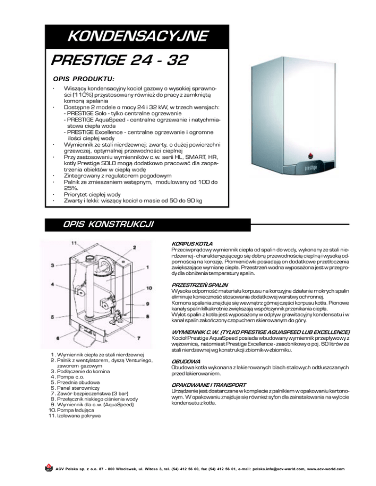 KONDENSACYJNE PRESTIGE 24 - 32 OPIS PRODUKTU: · · · · · · · · Wisz¹cy kondensacyjny kocio³ gazowy o wysokiej sprawnoci (110%) przystosowany równie¿ do pracy z zamkniêt¹ komor¹ spalania Dostêpne 2 modele o mocy 24 i 32 kW, w trzech wersjach: - PRESTIGE Solo - tylko centralne ogrzewanie - PRESTIGE AquaSpeed - centralne ogrzewanie i natychmiastowa ciep³a woda - PRESTIGE Excellence - centralne ogrzewanie i ogromne iloci ciep³ej wody Wymiennik ze stali nierdzewnej: zwarty, o du¿ej powierzchni grzewczej, optymalnej przewodnoci cieplnej Przy zastosowaniu wymienników c.w. serii HL, SMART, HR, kot³y Prestige SOLO mog¹ dodatkowo pracowaæ dla zaopatrzenia obiektów w ciep³¹ wodê Zintegrowany z regulatorem pogodowym Palnik ze zmieszaniem wstêpnym, modulowany od 100 do 25%. Priorytet ciep³ej wody Zwarty i lekki: wisz¹cy kocio³ o masie od 50 do 90 kg OPIS KONSTRUKCJI KORPUS KOT£A Przeciwpr¹dowy wymiennik ciep³a od spalin do wody, wykonany ze stali nierdzewnej - charakteryzuj¹cego siê dobr¹ przewodnoci¹ ciepln¹ i wysok¹ odpornoci¹ na korozjê. P³omieniówki posiadaj¹ on dodatkowe przet³oczenia zwiêkszaj¹ce wymianê ciep³a. Przestrzeñ wodna wyposa¿ona jest w przegrody dla obni¿enia temperatury spalin. PRZESTRZEÑ SPALIN Wysoka odpornoæ materia³u korpusu na korozyjne dzia³anie mokrych spalin eliminuje koniecznoæ stosowania dodatkowej warstwy ochronnej. Komora spalania znajduje siê wewn¹trz górnej czêci korpusu kot³a. Pionowe kana³y spalin kilkakrotnie zwiêkszaj¹ wspó³czynnik przenikania ciep³a. Wylot spalin z kot³a jest wyposa¿ony w odp³yw grawitacyjny kondensatu i w kana³ spalin zakoñczony czopuchem skierowanym do góry. 1. Wymiennik ciep³a ze stali nierdzewnej 2. Palnik z wentylatorem, dysz¹ Venturiego, zaworem gazowym 3. Pod³¹czenie do komina 4. Pompa c.o. 5. Przednia obudowa 6. Panel sterowniczy 7. Zawór bezpieczeñstwa (3 bar) 8. Prze³¹cznik niskiego cinienia wody 9. Wymiennik dla c.w. (AquaSpeed) 10. Pompa ³aduj¹ca 11. Izolowana pokrywa WYMIENNIK C.W. (TYLKO PRESTIGE AQUASPEED LUB EXCELLENCE) Kocio³ Prestige AquaSpeed posiada wbudowany wymiennik przep³ywowy z wê¿ownic¹, natomiast Prestige Excellence - zasobnikowy o poj. 60 litrów ze stali nierdzewnej wg konstrukcji zbiornik-w-zbiorniku. OBUDOWA Obudowa kot³a wykonana z lakierowanych blach stalowych odt³uszczanych przed lakierowaniem. OPAKOWANIE I TRANSPORT Urz¹dzenie jest dostarczane w komplecie z palnikiem w opakowaniu kartonowym. W opakowaniu znajduje siê równie¿ syfon dla zainstalowania na wylocie kondensatu z kot³a. ACV Polska sp. z o.o. 87 - 800 W³oc³awek, ul. Witosa 3, tel. (54) 412 56 00, fax (54) 412 56 01, e-mail: [email protected], www.acv-world.com PRESTIGE SOLO Tylko centralne ogrzewanie W po³¹czeniu z wymiennikiem c.w. typu HL, Smart lub HR mo¿e tak¿e zaopatrywaæ obiekty w ciep³¹ wodê Fabrycznie dostarczany bez pompy ³aduj¹cej dla c.w. (zestaw po³¹czenia dla c.w. z pomp¹ ³aduj¹c¹ - kod nr 10800079) PRESTIGE AQUASPEED Centralne ogrzewanie Ciep³a woda dostêpna natychmiast, bez marnotrawstwa Wbudowany wymiennik na ciep³¹ wodê o poj. 6 L Mo¿liwoæ instalacji miêdzy szafkami kuchennymi (600 x 600mm) wlot wody c.o. wylot wody c.o. wlot zimnej wody wylot c.w. PRESTIGE EXCELLENCE Centralne ogrzewanie Produkcja ciep³ej wody wg systemu zbiornik - w - zbiorniku Stal nierdzewna - wysoka odpornoæ na korozjê Brak odk³adania siê kamienia kot³owego Brak legionelli i innych bakterii Sta³a sprawnoæ przez ca³y okres u¿ytkowania Najlepszy wisz¹cy komfort ! (25.8 l/min przy Dt = 30°C!) ACV Polska sp. z o.o. 87 - 800 W³oc³awek, ul. Witosa 3, tel. (54) 412 56 00, fax (54) 412 56 01, e-mail: [email protected], www.acv-world.com ZASADA PRACY Zastosowany materia³ korpusu o wysokiej odpornoci na korozjê mokrych spalin i wysokiej wytrzyma³oci termicznej oraz jego geometria, pozwalaj¹ na maksymalne wykorzystanie ciep³a zawartego w spalinach - przy niewielkich gabarytach urz¹dzenia. Korpus z modulowanym palnikiem gazowym o rozwiniêtej powierzchni spalania tworz¹ wysokosprawn¹ konstrukcjê dla przetwarzania energii chemicznej paliwa w ciep³o, tak¿e przy zmiennym zapotrzebowaniu ciep³a instalacji centralnego ogrzewania lub przygotowania ciep³ej wody. Gdy wbudowany sterownik multifunkcyjny stwierdzi deficyt ciep³a w uk³adzie, zostaje uruchomiona pompa obiegowa i palnik. Zmiany parametrów s¹ wykrywane przez czujniki pod³¹czone do sterownika multifunkcyjnego. PODGRZEWANIE WODY DO CELÓW SANITARNYCH Przygotowanie ciep³ej wody w kotle Prestige SOLO wymaga zastosowania dodatkowego urz¹dzenia w postaci wymiennika ciep³a: stosowny algorytm regulacji automatycznej z priorytetem c.w. zawarto w programie sterownika multifunkcyjnego. Wtedy gdy wymiennik c.w. posiada termoregulator nastawny pod³¹czony do uk³adu regulacyjnego kot³a, jego stan jest determinowany histerez¹ tego termoregulatora. Deficyt ciep³a utrzymuje siê tak d³ugo jak d³ugo temperatura mierzona nie osi¹gnie wartosci zadanej na termoregulatorze. Je¿eli przekroczy wartoæ zadan¹, kocio³ wy³¹cza siê. Je¿eli temperatura w wymienniku c.w. jest kontrolowana przez czujnik NTC pod³¹czony do uk³adu regulacyjnego kot³a (tak¿e AquaSpeed i Excellence), jego praca bêdzie regulowana wybran¹ wielkoci¹ zadan¹ na sterowniku multifunkcyjnym; z zakresu od 10 do 600C. PRACA DLA CENTRALNEGO OGRZEWANIA Wtedy gdy zainstalowano termostat pokojowy i rejestruje on deficyt ciep³a w uk³adzie (w czasie braku zapotrzebowania ciep³a dla podgrzewania c. w.) nastêpuje uaktywnienie napêdu zaworu trójdro¿nego. W czasie zmiany po³o¿enia wrzeciona zaworu trójdro¿nego pompa nie za³¹cza siê. Po za³¹czeniu siê pompy sterownik multifunkcyjny za³¹cza palnik moduluj¹c jego moc a¿ wartoæ mierzona czujnikiem temperatury (wody grzewczej z kot³a) osi¹gnie wartoæ zadan¹ (nastawion¹).Standardem jest nastawa 750C. W przypadku pod³¹czenia czujnika temperatury z