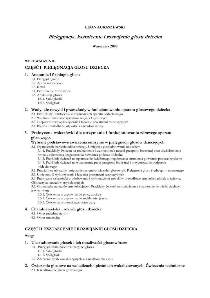 LEON ŁUKASZEWSKI Pielęgnacja, kształcenie i rozwijanie głosu dziecka Warszawa 2009 WPROWADZENIE CZĘŚĆ I PIELĘGNACJA GŁOSU DZIECKA 1. Anatomia i fizjologia głosu 1.1. Przegląd ogólny 1.2. Aparat oddechowy 1.3. Krtań 1.4. Przestrzenie rezonacyjne 1.5. Artykulacja głosek 1.5.1. Samogłoski 1.5.2. Spółgłoski 2. Wady, złe nawyki i przeszkody w funkcjonowaniu aparatu głosowego dziecka 2.1. Przeszkody i zakłócenia w czynnościach aparatu oddechowego 2.2. Wadliwa działalność systemów wiązadeł głosowych 2.3. Nieprawidłowe wykorzystanie i łączenie przestrzeni rezonacyjnych 2.4. Błędna i zaniedbana artykulacja narządów mowy 3. Praktyczne wskazówki dla utrzymania i funkcjonowania zdrowego aparatu głosowego. Wybrane podstawowe ćwiczenia emisyjne w pielęgnacji głosów dziecięcych 3.1. Opanowanie napięcia oddechowego. Umiejętne gospodarowanie oddechem 3.1.1. Przykłady ćwiczeń na rozluźnienie i wzmocnienie mięśni przepony brzusznej oraz uświadomienie procesu spiętrzenia i zagęszczenia powietrza podczas oddechu 3.1.2. Przykłady ćwiczeń na opanowanie świadomego regulowania strumienia powietrza podczas wydechu 3.1.3. Przykłady ćwiczeń na wstrzymanie pracy przepony brzusznej i przygotowanie podparcia oddechowego 3.2. Prawidłowe używanie i mieszanie systemów wiązadeł głosowych. Pielęgnacja głosu średniego – mieszanego 3.3. Umiejętność wykorzystania i łączenia przestrzeni rezonacyjnych 3.4. Praktyczne wskazówki w zdobywaniu i wykształceniu nawyków prawidłowej artykulacji głosek w śpiewie. Gimnastyka narządów artykulacyjnych 3.5. Gimnastyka narządów artykulacyjnych. Przykłady ćwiczeń na rozluźnienie i wzmocnienie mięśni żuchwy, języka i warg 3.5.1. Ćwiczenia w usprawnianiu pracy żuchwy 3.5.2. Ćwiczenia w usprawnianiu ruchliwości języka 3.5.3. Ćwiczenia usprawniające pracę warg 4. Charakterystyka i rozwój głosu dziecka 4.1. Okres przedmutacyjny 4.2. Okres mutacyjny CZĘŚĆ II KSZTAŁCENIE I ROZWIJANIE GŁOSU DZIECKA Wstęp 1. Ukształtowanie głosek i ich możliwości głosotwórcze 1.1. Przegląd działalności rezonacyjnej głosek 1.1.1. Samogłoski 1.1.2. Spółgłoski 1.2. Znaczenie sylab wokalizacyjnych w kształtowaniu głosu 2. Ćwiczenia głosowe na wokalizach i pieśniach wokalizowanych. Ćwiczenia techniczne 2.1. Kształtowanie głosu głowowego 2.1.1. Pieśni wokalizowane 2.1.2. Sylaby wokalistyczne 2.1.3. Zastosowanie niektórych sylab i wyrazów ćwiczebnych w pieśniach 2.1.4. Ćwiczenia techniczne 2.2. Kształtowanie głosu średniego 2.2.1. Pieśni wokalizowane 2.2.2. Wokalizy naturalne 2.2.3. Zastosowanie niektórych sylab i wokaliz naturalnych w pieśniach 2.2.4. Ćwiczenia techniczne 2.3. Wzmocnienie i rozszerzenie głosu średniego za pomocą samogłoski a 2.3.1. Pieśni wokalizowane 2.3.2. Wokalizy ćwiczebne 2.3.3. Zastosowanie niektórych ćwiczeń w pieśniach 2.3.4. Ćwiczenia techniczne 2.4. Wyrównanie dźwięku głowowego – tylnego i przedniego – maskowego 2.4.1. Pieśni wokalizowane na wyrównanie dźwięku głowowego tylnego i przedniego za pomocą samogłosek u – o – y, i – e – a 2.4.2. Łączenie i wyrównanie brzmienia samogłosek w wołaniach i okrzykach 2.4.3. Łączenie i wyrównanie samogłosek w pieśniach 2.4.4. Ćwiczenia techniczne. Wyrównanie brzmienia samogłosek 2.5. Wyrównanie rejestrów 2.5.1. Sprowadzenie głosu głowowego do rejestru piersiowego 2.5.2. Wyrównanie i powiązanie rejestrów od dolnego odcinka skali głosowej 2.5.3. Ćwiczenia techniczne 2.5.4. Wyrównanie i powiązanie rejestrów od dolnego odcinka skali głosowej. Śpiewanie gam zwykłych i rytmizowanych na różnych sylabach 2.6. Budzenie i wzmocnienie rezonansu głowowego za pomocą spółgłosek dźwięcznych: m, n, ń, l, r 2.6.1. Przykłady pieśni wokalizowanych 2.6.2. Przykłady opracowanych zabaw muzycznych 2.6.2.1. Gra dzwonów 2.6.2.2. Instrumenty muzyczne 2.6.3. Zastosowanie ćwiczeń głosowych w pieśniach. Wykształcenie rezonansu głowowego 2.6.4. Ćwiczenia techniczne 2.7. Ćwiczenia oddechowe za pomocą spółgłosek szczelinowych: f, s, ś, sz, w, z i wybuchowych: b, p, d, t, g, k, c, cz 2.7.1. Zastosowanie ćwiczeń oddechowych w pieśniach 2.7.1.1. Ćwiczenie na rozluźnienie i wzmocnienie przepony brzusznej za pomocą spółgłoski cz i sylaby fu 2.7.1.2. Ćwiczenie na opanowanie świadomego regulowania strumienia powietrza za pomocą spółgłosek szczelinowych 2.7.1.3. Ćwiczenie na wstrzymanie pracy diafragmy i przygotowanie podparcia oddechowego 2.7.2. Ćwiczenia techniczne 2.8. Atakowanie, artykulacja głosu i frazowanie 2.8.1. Atakowanie głosowe 2.8.2. Artykulacja 2.8.3. Frazowanie 2.8.4. Ćwiczenia techniczne. Przykłady pieśni wokalizowanych 2.9. Gimnastyka narządów artykulacyjnych za pomocą spółgłosek wybuchowych: d, t, b, p, g, k i wibrujących: r, l, ł 2.9.1. Przykłady ćwiczeń na gimnastykę narządów artykulacyjnych za pomocą spółgłosek ujętych w sylaby 2.9.2. Przykłady pieśni wokalizowanych 2.9.3. Zastosowanie niektórych sylab ćwiczebnych w pieśniach 2.9.4. Ćwiczenia techniczne 2.10. Rozszerzenie skali głosowej 2.11. Wykształcenie biegłości technicznej głosu 2.12. Opanowanie siły głosowej – filowanie 3. Rola instrumentu w kształceniu głosu dziecka 4. Uwagi końcowe Bibliografia Spis rysunków i tabel