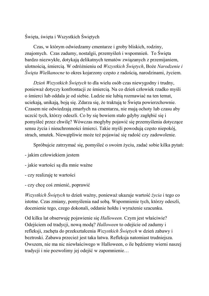 Święta, święta i Wszystkich Świętych Czas, w którym odwiedzamy cmentarze i groby bliskich, rodziny, znajomych. Czas zadumy, nostalgii, przemyśleń i wspomnień. To Święta bardzo niezwykłe, dotykają delikatnych tematów związanych z przemijaniem, ulotnością, śmiercią. W odróżnieniu od Wszystkich Świętych, Boże Narodzenie i Święta Wielkanocne to okres kojarzony często z radością, narodzinami, życiem. Dzień Wszystkich Świętych to dla wielu osób czas niewygodny i trudny, ponieważ dotyczy konfrontacji ze śmiercią. Na co dzień człowiek rzadko myśli o śmierci lub oddala je od siebie. Ludzie nie lubią rozmawiać na ten temat, uciekają, unikają, boją się. Zdarza się, że traktują te Święta powierzchownie. Czasem nie odwiedzają zmarłych na cmentarzu, nie mają ochoty lub czasu aby uczcić tych, którzy odeszli. Co by się bowiem stało gdyby zagłębić się i pomyśleć przez chwilę? Wówczas mogłyby pojawić się przemyślenia dotyczące sensu życia i nieuchronności śmierci. Takie myśli powodują często niepokój, strach, smutek. Niewątpliwie może też pojawiać się radość czy zadowolenie. Spróbujcie zatrzymać się, pomyśleć o swoim życiu, zadać sobie kilka pytań: - jakim człowiekiem jestem - jakie wartości są dla mnie ważne - czy realizuję te wartości - czy chcę coś zmienić, poprawić Wszystkich Świętych to dzień ważny, ponieważ ukazuje wartość życia i tego co istotne. Czas zmiany, pomyślenia nad sobą. Wspomnienie tych, którzy odeszli, docenienie tego, czego dokonali, oddanie hołdu i wyrażenie szacunku. Od kilku lat obserwuję pojawienie się Halloween. Czym jest właściwie? Odejściem od tradycji, nową modą? Halloween to odejście od zadumy i refleksji, zachęta do przekształcenia Wszystkich Świętych w dzień zabawy i beztroski. Zabawa przecież jest taka łatwa. Refleksja natomiast trudniejsza. Owszem, nie ma nic niewłaściwego w Halloween, o ile będziemy wierni naszej tradycji i nie pozwolimy jej odejść w zapomnienie…