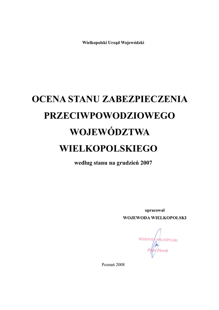 Ocena stanu zabezpieczenia przeciwpowodziowego województwa wielkopolskiego Ocena stanu zabezpieczenia przeciwpowodziowego województwa wielkopolskiego Wielkopolski Urząd Wojewódzki OCENA STANU ZABEZPIECZENIA PRZECIWPOWODZIOWEGO WOJEWÓDZTWA WIELKOPOLSKIEGO według stanu na grudzień 2007 opracował WOJEWODA WIELKOPOLSKI Poznań 2008 1/26 Ocena stanu zabezpieczenia przeciwpowodziowego województwa wielkopolskiego Ocena stanu zabezpieczenia przeciwpowodziowego województwa wielkopolskiego Spis treści CZĘŚĆ I Wstęp .........................................................................................................................................4 CZĘŚĆ II Ocena .........................................................................................................................................6 1. Studium ochrony przeciwpowodziowej w regionie wodnym ...........................................6 2. Projekt planu ochrony przeciwpowodziowej regionu wodnego........................................7 3. Ochrona ludzi i mienia przed powodzią w aspekcie zachowania i tworzenia wszelkich systemów retencji wód, budowę i rozbudowę zbiorników retencyjnych, suchych zbiorników przeciwpowodziowych oraz polderów przeciwpowodziowych; ..................8 4. Ochrona ludzi i mienia przed powodzią w aspekcie racjonalnego retencjonowania wód oraz użytkowanie budowli przeciwpowodziowych oraz sterowania przepływami wód ..9 5. Ochrona ludzi i mienia przed powodzią w aspekcie funkcjonowania systemu ostrzegania przed niebezpiecznymi zjawiskami zachodzącymi w atmosferze oraz hydrosferze (osłona meteorologiczna i osłona hydrologiczna)...........................................................11 6. Ochrona ludzi i mienia przed powodzią w aspekcie kształtowania przestrzennego dolin rzecznych lub terenów zalewowych, budowanie oraz utrzymywanie wałów przeciwpowodziowych, a także kanałów ulgi.................................................................13 7. Ocena przygotowania planu operacyjnego ochrony przed powodzią..............................15 7.1 Możliwości realizacji ewakuacji w sytuacji zagrożenia powodziowego..................15 7.2 Ocena przewidywanej sytuacji prawnej, związanej z zagrożeniem powodziowym. 15 7.3 Ocena skuteczności działania systemu ostrzegania, alarmowania i informowania mieszkańców obszarów dotkniętych powodzią...............................................................16 7.4 Ocena prawnego aspektu ogłaszania i odwoływania stanu pogotowia i alarmu przeciwpowodziowego....................................................................................................17 7.5 Stan rezerw magazynowych sprzętu przeciwpowodziowego....................................18 7.6 Ocena możliwości wsparcia działań prowadzonych przez podmioty KSRG podczas powodzi...........................................................................................................................20 7.7 Ocena skuteczności działania systemu obiegu informacji między służbami i podmiotami biorącymi udział w działaniach...................................................................20 8. Problem ubezpieczeń nieruchomości i upraw na terenach zagrożonych powodzią ........21 2/26 Ocena stanu zabezpieczenia przeciwpowodziowego województwa wielkopolskiego Ocena stanu zabezpieczenia przeciwpowodziowego województwa wielkopolskiego Część III Wnioski ...................................................................................................................................22 Wykaz skrótów ...................................................................................................................................................25 3/26 Ocena stanu zabezpieczenia przeciwpowodziowego województwa wielkopolskiego Ocena stanu zabezpieczenia przeciwpowodziowego województwa wielkopolskiego CZĘŚĆ I Wstęp Podstawą prawną opracowania „Oceny stanu zabezpieczenia przeciwpowodziowego województwa wielkopolskiego” jest ustawa z dnia 5 czerwca 1998 r. (Dz. U. z 2001 r. Nr 80. poz. 872 art.15 pkt 4a) o administracji rządowej w województwie. Dokument ten stanowi, że Wojewoda jako przedstawiciel Rady Ministrów odpowiada za wykonanie polityki rządu na obszarze województwa, a w szczególności: dokonuje oceny stanu zabezpieczenia przeciwpowodziowego województwa, opracowuje plan operacyjny ochrony przed powodzią oraz ogłasza i odwołuje pogotowie i alarm przeciwpowodziowy. Biorąc pod uwagę uwarunkowania regionalne zjawisko powodzi w Zlewni Warty występuje nieregularnie, zarówno w okresach jesienno-zimowych jak i zimowych, a charakter wezbrań jest bardzo zróżnicowany jeżeli chodzi o wielkość przepływów. Wezbrania powodziowe w Wielkopolsce występują również na rzekach Prosna, Noteć, Orla. Największe odnotowane powodzie w rejonie środkowej Warty wystąpiły w latach 1927, 1951, 1979, 1982, a zatopieniu w dwóch ostatnich wymienionych powodziach uległo około 5000 budynków i ewakuacji zostało poddanych około 3000 ludzi, a zagrożenie dotyczyło także przemysłu energetycznego w rejonie Konina. W konsekwencji tych historycznych powodzi spowodowało w latach 80-tych podjęcie działań polegających na wzmocnieniu i uszczelnieniu obwałowań, a także wykonaniu do nich wielu kilometrów dróg dojazdowych. Jednak największy postęp w poprawie ochrony przeciwpowodziowej nastąpił na skutek wykonania i włączenia do użytkowania zbiornika "Jeziorsko". Należy jednak mieć na uwadze, iz oddziaływanie przeciwpowodziowe zbiornika na odcinek Warty od Konina w kierunku Poznania jest znikome, gdyż rolę tą w większym stopniu spełnia naturalna retencja doliny konińsko-pyzderskiej. Niniejszy dokument jest wypełnieniem zadań Wojewody w zakresie dokonania oceny stanu zabezpieczenia przeciwpowodziowego województwa wielkopolskiego według stanu na na rok 2007, natomiast pozostałe zadania ujęte zostały w planie operacyjnym