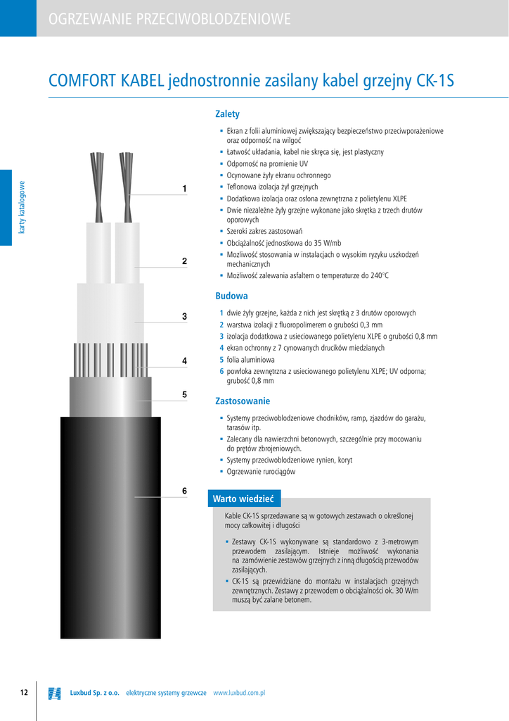 OGRZEWANIE PRZECIWOBLODZENIOWE COMFORT KABEL jednostronnie zasilany kabel grzejny CK-1S Zalety Ekran z folii aluminiowej zwiększający bezpieczeństwo przeciwporażeniowe oraz odporność na wilgoć Łatwość układania, kabel nie skręca się, jest plastyczny Odporność na promienie UV karty katalogowe Ocynowane żyły ekranu ochronnego Teflonowa izolacja żył grzejnych Dodatkowa izolacja oraz osłona zewnętrzna z polietylenu XLPE Dwie niezależne żyły grzejne wykonane jako skrętka z trzech drutów oporowych Szeroki zakres zastosowań Obciążalność jednostkowa do 35 W/mb Mozliwość stosowania w instalacjach o wysokim ryzyku uszkodzeń mechanicznych Możliwość zalewania asfaltem o temperaturze do 240°C Budowa 1 dwie żyły grzejne, każda z nich jest skrętką z 3 drutów oporowych 2 warstwa izolacji z fluoropolimerem o grubości 0,3 mm 3 izolacja dodatkowa z usieciowanego polietylenu XLPE o grubości 0,8 mm 4 ekran ochronny z 7 cynowanych drucików miedzianych 5 folia aluminiowa 6 powłoka zewnętrzna z usieciowanego polietylenu XLPE; UV odporna; grubość 0,8 mm Zastosowanie Systemy przeciwoblodzeniowe chodników, ramp, zjazdów do garażu, tarasów itp. Zalecany dla nawierzchni betonowych, szczególnie przy mocowaniu do prętów zbrojeniowych. Systemy przeciwoblodzeniowe rynien, koryt Ogrzewanie rurociągów Warto wiedzieć Kable CK-1S sprzedawane są w gotowych zestawach o określonej mocy całkowitej i długości Zestawy CK-1S wykonywane są standardowo z 3-metrowym przewodem zasilającym. Istnieje możliwość wykonania na zamówienie zestawów grzejnych z inną długością przewodów zasilających. CK-1S są przewidziane do montażu w instalacjach grzejnych zewnętrznych. Zestawy z przewodem o obciążalności ok. 30 W/m muszą być zalane betonem. 12 Luxbud Sp. z o.o. elektryczne systemy grzewcze www.luxbud.com.pl OGRZEWANIE PRZECIWOBLODZENIOWE Dane techniczne Podjazdy betonowe Podjazdy inne Rynny Rurociągi 20,0 W/m 30,0 W/m 35,0 W/m* 35,0 W/m* 15,0 W/m Napięcie znamionowe 230V AC / 400V AC Wytrzymałość temperaturowa od –30°C do +90°C Stopień ochrony karty katalogowe Max. jednostkowa moc grzejna Ogrzewanie podłogowe IP67 Min. promień gięcia 5 cm Min. temp. montażu –5°C Średnica zewnętrzna od 6,2 mm do 8,9 mm Rezystancja jednostkowa od 0,04 Ω/m do 18,0 Ω/m Własności samogasnące TAK Klasyfikacja mechaniczna M2 zgodnie z normą IEC 60800:2009 Zalewanie asfaltem max +240°C przez 30 min. * wymagany termostat wyłączający kabel przy temperaturze otoczenia powyżej +5°C Standardowe zestawy grzejne COMFORT KABEL 30 W/m Symbol COMFORT KABEL 25 W/m Długość [m] Moc zestawu [W] Symbol Długość [m] Moc zestawu [W] 11 270 CK-1S-30-300 10 300 CK-1S-25-270 CK-1S-30-500 16,5 500 CK-1S-25-450 18 450 CK-1S-30-760 26 760 CK-1S-25-700 28 700 CK-1S-30-880 30 880 CK-1S-25-800 33 800 CK-1S-30-1150 38 1150 CK-1S-25-1050 42 1050 54 1350 58 1500 CK-1S-30-1500 49 1500 CK-1S-25-1350 CK-1S-30-1600 54 1600 CK-1S-25 CK-1S-25-1500 CK-1S-30-2100 68 2100 CK-1S-25-1900 75 1900 CK-1S-30-2500 84 2500 CK-1S-25-2300 92 2300 CK-1S-30-2900 95 2900 CK-1S-25-2700 104 2700 CK-1S-30-4400 150 4400 CK-1S-25-4000 165 4000 CK-1S-30-5900 195 5900 CK-1S-25-5400 213 5400 www.luxbud.com.pl elektryczne systemy grzewcze Luxbud Sp. z o.o. 13