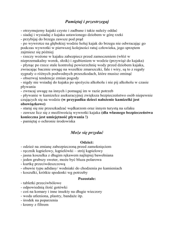 Pamiętaj i przestrzegaj - otrzymujemy kajaki czyste i zadbane i takie należy oddać - siadaj i wysiadaj z kajaka ustawionego dziobem w górę rzeki - przybijaj do brzegu zawsze pod prąd - po wywrotce na głębokiej wodzie holuj kajak do brzegu nie odwracając go podczas wywrotki w pierwszej kolejności ratuj człowieka, jego sprzętem zajmiesz się później - rzeczy wożone w kajaku zabezpiecz przed zamoczeniem (włóż w nieprzemakalny worek, słoik) i zgubieniem w wodzie (przywiąż do kajaka) - płynąc po rzece stale kontroluj powierzchnię wody przed dziobem kajaka, zwracając bacznie uwagę na wszelkie zmarszczki, fale i wiry, są to z reguły sygnały o różnych podwodnych przeszkodach, które musisz ominąć - obserwuj tendencje zmian pogody - nigdy nie wsiadaj do kajaka po spożyciu alkoholu i nie pij alkoholu w czasie pływania - zwracaj uwagę na innych i pomagaj im w razie potrzeb - pływanie w kamizelce asekuracyjnej zwiększa bezpieczeństwo osób niepewnie czujących się na wodzie (w przypadku dzieci nałożenie kamizelki jest obowiązkowe) - staraj się nie przeszkadzać wędkarzom oraz innym turystą na szlaku - zawsze licz się z możliwością wywrotki kajaka (dla własnego bezpieczeństwa konieczna jest umiejętność pływania !) - pamiętaj o ochronie środowiska Może się przydać Odzież: - odzież na zmianę zabezpieczoną przed zamoknięciem - ręcznik kąpielowy, kąpielówki – strój kąpielowy - jasna koszulka z długim rękawem najlepiej bawełniana - jeden grubszy sweter, może być bluza polarowa - kurtkę przeciwdeszczową - obuwie typu adidasy/ wodniaki do chodzenia po kamieniach - koszulki, krótkie spodenki wg potrzeby Pozostałe: - tabletki przeciwbólowe - odpowiednią ilość gotówki - coś na komary i inne insekty na długie wieczory - woda utleniona, plastry, bandaże itp. - środek na poparzenia - kremy z filtrem - czapka z daszkiem, okulary przeciwsłoneczne - pokrowiec wodoodporny na komórkę czy aparat foto - rękawiczki (np. rowerowe) wedle upodobania, dla większego komfortu wiosłowania - woda do picia