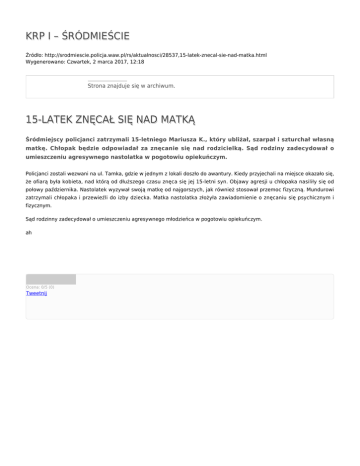 KRP I – ŚRÓDMIEŚCIE Źródło: http://srodmiescie.policja.waw.pl/rs/aktualnosci/28537,15-latek-znecal-sie-nad-matka.html Wygenerowano: Czwartek, 2 marca 2017, 12:18 Strona znajduje się w archiwum. 15-LATEK ZNĘCAŁ SIĘ NAD MATKĄ Śródmiejscy policjanci zatrzymali 15-letniego Mariusza K., który ubliżał, szarpał i szturchał własną matkę. Chłopak będzie odpowiadał za znęcanie się nad rodzicielką. Sąd rodziny zadecydował o umieszczeniu agresywnego nastolatka w pogotowiu opiekuńczym. Policjanci zostali wezwani na ul. Tamka, gdzie w jednym z lokali doszło do awantury. Kiedy przyjechali na miejsce okazało się, że ofiarą była kobieta, nad którą od dłuższego czasu znęca się jej 15-letni syn. Objawy agresji u chłopaka nasiliły się od połowy października. Nastolatek wyzywał swoją matkę od najgorszych, jak również stosował przemoc fizyczną. Mundurowi zatrzymali chłopaka i przewieźli do izby dziecka. Matka nastolatka złożyła zawiadomienie o znęcaniu się psychicznym i fizycznym. Sąd rodzinny zadecydował o umieszczeniu agresywnego młodzieńca w pogotowiu opiekuńczym. ah Ocena: 0/5 (0) Tweetnij