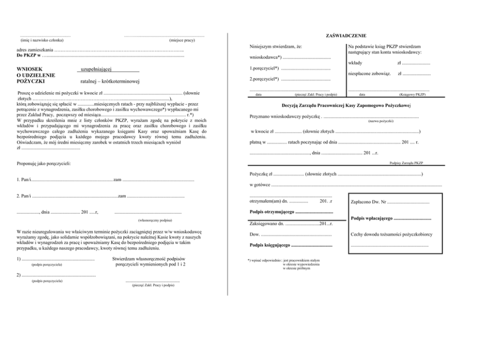 ................................................. (imię i nazwisko członka) adres zamieszkania ……………………………………………………………………….. Do PKZP w …..................................................................................................................... WNIOSEK O UDZIELENIE POŻYCZKI ZAŚWIADCZENIE ……….................................................................. (miejsce pracy) Niniejszym stwierdzam, że: wnioskodawca*) ......................................... uzupełniającej 1.poręczyciel*) .......................................... ratalnej – krótkoterminowej 2.poręczyciel*) .......................................... Proszę o udzielenie mi pożyczki w kwocie zł ................................................................... (słownie złotych …………………………………………………..........................................), którą zobowiązuję się spłacić w ..............miesięcznych ratach - przy najbliższej wypłacie - przez potrącenie z wynagrodzenia, zasiłku chorobowego i zasiłku wychowawczego*) wypłacanego mi przez Zakład Pracy, począwszy od miesiąca....................................................................... r.*) W przypadku skreślenia mnie z listy członków PKZP, wyrażam zgodę na pokrycie z moich wkładów i przypadającego mi wynagrodzenia za pracę oraz zasiłku chorobowego i zasiłku wychowawczego całego zadłużenia wykazanego księgami Kasy oraz upoważniam Kasę do bezpośredniego podjęcia u każdego mojego pracodawcy kwoty równej temu zadłużeniu. Oświadczam, że mój średni miesięczny zarobek w ostatnich trzech miesiącach wyniósł zł .................................................. .................................................................... data (pieczęć Zakł. Pracy i podpis) Na podstawie ksiąg PKZP stwierdzam następujący stan konta wnioskodawcy: wkłady zł ........................ niespłacone zobowiąz. zł ........................ ..................................................................... data (Księgowy PKZP) Decyzją Zarządu Pracowniczej Kasy Zapomogowo Pożyczkowej Przyznano wnioskodawczy pożyczkę . ................................................................................. (nazwa pożyczki) w kwocie zł ....................... (słownie złotych .......................................................................) płatną w ................. ratach poczynając od dnia ..................................................... 201 .... r. ..................................................., dnia ................................... 201 ...r. Proponuję jako poręczycieli: Podpisy Zarządu PKZP Pożyczkę zł .......................... (słownie złotych .......................................................................) 1. Pan/i .................................................................... zam ............................................................. w gotówce ................................................................................................................................................. 2. Pan/i .........................................................................zam ................................................. ..................., dnia ......................... 201 .....r, ......................................................... (własnoręczny podpisa) W razie nieuregulowania we właściwym terminie pożyczki zaciągniętej przez w/w wnioskodawcę wyrażamy zgodę, jako solidarnie współzobowiązani, na pokrycie należnej Kasie kwoty z naszych wkładów i wynagrodzeń za pracę i upoważniamy Kasę do bezpośredniego podjęcia w takim przypadku, u każdego naszego pracodawcy, kwoty równej temu zadłużeniu. 1) .............................................................. (podpis poręczyciela) Stwierdzam własnoręczność podpisów poręczycieli wymienionych pod 1 i 2 2) ............................................................... (podpis poręczyciela) .............................................. (pieczęć Zakł. Pracy i podpis) ...................................................................... otrzymałem(am) dn. ................ 201. .r Podpis otrzymującego ................................ Zaksięgowano dn. .............................201...r. Zapłacono Dw. Nr .................................... Podpis wpłacającego ................................ Dow. ............................................................ Cechy dowodu tożsamości pożyczkobiorcy Podpis księgującego ................................... .................................................................. *) wpisać odpowiednio:: jest pracownikiem stałym w okresie wypowiedzenia w okresie próbnym