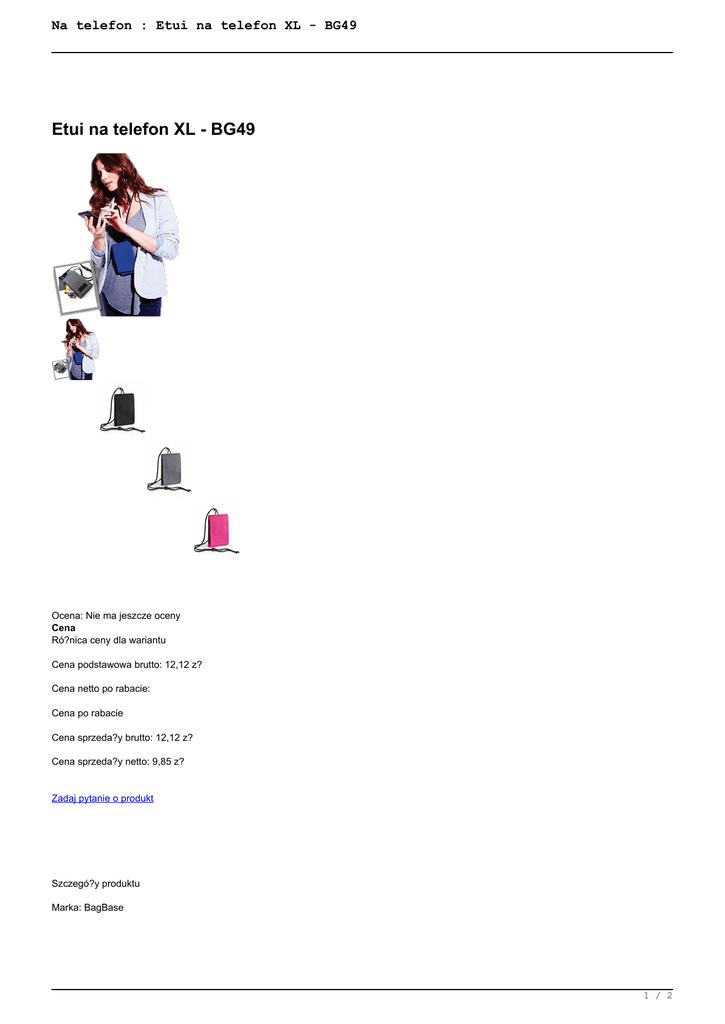 Na telefon : Etui na telefon XL - BG49 Etui na telefon XL - BG49 Ocena: Nie ma jeszcze oceny Cena Ró?nica ceny dla wariantu Cena podstawowa brutto: 12,12 z? Cena netto po rabacie: Cena po rabacie Cena sprzeda?y brutto: 12,12 z? Cena sprzeda?y netto: 9,85 z? Zadaj pytanie o produkt Szczegó?y produktu Marka: BagBase 1 / 2 Na telefon : Etui na telefon XL - BG49 Opis: Nadaje si? na smartphona Zapi?cie Rip-Strip™ Pasek zamocowany do zapiecia typu karabinek Dodatkowa, boczna kieszonka zapinanan na zamek b?yskawiczny 600D poliester Materia?:100% poliester Rozmiar:10 x 16 x 2 cm 2 / 2 Powered by TCPDF (www.tcpdf.org)