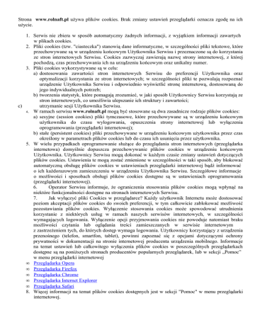 Strona www.rolnaft.pl używa plików cookies. Brak zmiany ustawień przeglądarki oznacza zgodę na ich użycie. 1. Serwis nie zbiera w sposób automatyczny żadnych informacji, z wyjątkiem informacji zawartych w plikach cookies. 2. Pliki cookies (tzw. "ciasteczka") stanowią dane informatyczne, w szczególności pliki tekstowe, które przechowywane są w urządzeniu końcowym Użytkownika Serwisu i przeznaczone są do korzystania ze stron internetowych Serwisu. Cookies zazwyczaj zawierają nazwę strony internetowej, z której pochodzą, czas przechowywania ich na urządzeniu końcowym oraz unikalny numer. 3. Pliki cookies wykorzystywane są w celu: a) dostosowania zawartości stron internetowych Serwisu do preferencji Użytkownika oraz optymalizacji korzystania ze stron internetowych; w szczególności pliki te pozwalają rozpoznać urządzenie Użytkownika Serwisu i odpowiednio wyświetlić stronę internetową, dostosowaną do jego indywidualnych potrzeb; b) tworzenia statystyk, które pomagają zrozumieć, w jaki sposób Użytkownicy Serwisu korzystają ze stron internetowych, co umożliwia ulepszanie ich struktury i zawartości; c) utrzymanie sesji Użytkownika Serwisu. 4. W ramach serwisu www.rolnaft.pl mogą być stosowane są dwa zasadnicze rodzaje plików cookies: a) sesyjne (session cookies) pliki tymczasowe, które przechowywane są w urządzeniu końcowym użytkownika do czasu wylogowania, opuszczenia strony internetowej lub wyłączenia oprogramowania (przeglądarki internetowej); b) stałe (persistent cookies) pliki przechowywane w urządzeniu końcowym użytkownika przez czas określony w parametrach plików cookies lub do czasu ich usunięcia przez użytkownika. 5. W wielu przypadkach oprogramowanie służące do przeglądania stron internetowych (przeglądarka internetowa) domyślnie dopuszcza przechowywanie plików cookies w urządzeniu końcowym Użytkownika. Użytkownicy Serwisu mogą dokonać w każdym czasie zmiany ustawień dotyczących plików cookies. Ustawienia te mogą zostać zmienione w szczególności w taki sposób, aby blokować automatyczną obsługę plików cookies w ustawieniach przeglądarki internetowej bądź informować o ich każdorazowym zamieszczeniu w urządzeniu Użytkownika Serwisu. Szczegółowe informacje o możliwości i sposobach obsługi plików cookies dostępne są w ustawieniach oprogramowania (przeglądarki internetowej). 6. Operator Serwisu informuje, że ograniczenia stosowania plików cookies mogą wpłynąć na niektóre funkcjonalności dostępne na stronach internetowych Serwisu. 7. Jak wyłączyć pliki Cookies w przeglądarce? Każdy użytkownik Internetu może dostosować poziom akceptacji plików cookies do swoich preferencji, w tym całkowicie zablokować możliwość pozostawiania plików cookies. Wyłączenie stosowania cookies może spowodować utrudnienia korzystanie z niektórych usług w ramach naszych serwisów internetowych, w szczególności wymagających logowania. Wyłączenie opcji przyjmowania cookies nie powoduje natomiast braku możliwości czytania lub oglądania treści zamieszczanych w serwisie internetowym z zastrzeżeniem tych, do których dostęp wymaga logowania. Użytkownicy korzystający z urządzenia przenośnego (telefon, smartfon, tablet), powinni zapoznać się z opcjami dotyczącymi ochrony prywatności w dokumentacji na stronie internetowej producenta urządzenia mobilnego. Informacje na temat ustawień lub całkowitego wyłączenia plików cookies w poszczególnych przeglądarkach dostępne są na poniższych stronach producentów popularnych przeglądarek, lub w sekcji „Pomoc” w menu przeglądarki internetowej • Przeglądarka Opera • Przeglądarka Firefox • Przeglądarka Chrome • Przeglądarka Internet Explorer • Przeglądarka Safari 8. Więcej informacji na temat plików cookies dostępnych jest w sekcji "Pomoc" w menu przeglądarki internetowej.