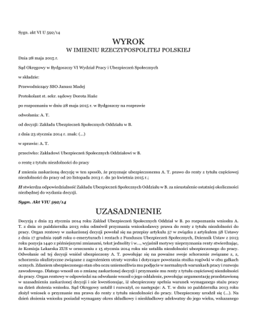 Sygn. akt VI U 592/14 WYROK W IMIENIU RZECZYPOSPOLITEJ POLSKIEJ Dnia 28 maja 2015 r. Sąd Okręgowy w Bydgoszczy VI Wydział Pracy i Ubezpieczeń Społecznych w składzie: Przewodniczący SSO Janusz Madej Protokolant st. sekr. sądowy Dorota Hańc po rozpoznaniu w dniu 28 maja 2015 r. w Bydgoszczy na rozprawie odwołania: A. T. od decyzji: Zakładu Ubezpieczeń Społecznych Oddziału w B. z dnia 23 stycznia 2014 r. znak: (...) w sprawie: A. T. przeciwko: Zakładowi Ubezpieczeń Społecznych Oddziałowi w B. o rentę z tytułu niezdolności do pracy I zmienia zaskarżoną decyzję w ten sposób, że przyznaje ubezpieczonemu A. T. prawo do renty z tytułu częściowej niezdolności do pracy od 20 listopada 2013 r. do 30 kwietnia 2015 r.; II stwierdza odpowiedzialność Zakładu Ubezpieczeń Społecznych Oddziału w B. za nieustalenie ostatniej okoliczności niezbędnej do wydania decyzji. Sygn. Akt VIU 592/14 UZASADNIENIE Decyzją z dnia 23 stycznia 2014 roku Zakład Ubezpieczeń Społecznych Oddział w B. po rozpoznaniu wniosku A. T. z dnia 10 października 2013 roku odmówił przyznania wnioskodawcy prawa do renty z tytułu niezdolności do pracy. Organ rentowy w zaskarżonej decyzji powołał się na przepisy artykułu 57 w związku z artykułem 58 Ustawy z dnia 17 grudnia 1998 roku o emeryturach i rentach z Funduszu Ubezpieczeń Społecznych, Dziennik Ustaw z 2013 roku pozycja 1440 z późniejszymi zmianami, tekst jednolity i w..., wyjaśnił motywy nieprzyznania renty stwierdzając, że Komisja Lekarska ZUS w orzeczeniu z 15 stycznia 2014 roku nie ustaliła niezdolności ubezpieczonego do pracy. Odwołanie od tej decyzji wniósł ubezpieczony A. T. powołując się na poważne swoje schorzenie związane z, z, schorzenia okulistyczne związane z zagrożeniem utraty wzroku i dotyczące powstania stożka rogówki w obu gałkach ocznych. Zdaniem ubezpieczonego stan obu oczu uniemożliwia mu podjęcie w normalnych warunkach pracy i rozwoju zawodowego. Dlatego wnosił on o zmianę zaskarżonej decyzji i przyznanie mu renty z tytułu częściowej niezdolności do pracy. Organ rentowy w odpowiedzi na odwołanie wnosił o jego oddalenie, powołując argumentację przedstawioną w uzasadnieniu zaskarżonej decyzji i nie kwestionując, iż ubezpieczony spełnia warunek wymaganego stażu pracy na dzień złożenia wniosku. Sąd Okręgowy ustalił i rozważył, co następuje: A. T. w dniu 10 października 2013 roku złożył wniosek o przyznanie mu prawa do renty z tytułu niezdolności do pracy. Ubezpieczony urodził się (...). Na dzień złożenia wniosku posiadał wymagany okres składkowy i nieskładkowy adekwatny do jego wieku, wskazanego w artykule 58 Ustawy emerytalno-rentowej, 4 lata, 8 miesięcy i 7 dni. W celu zweryfikowania stanowiska organu rentowego, Sąd Okręgowy dopuścił dowód z opinii biegłych sądowych z, bieg..., specjalisty chorób oczu oraz specjalisty medycyny pracy. W opiniach z dnia 7 października 2014 roku biegła sądowa, specjalista chorób oczu, rozpoznała u ubezpieczonego: stożek rogówki obu oczu leczony nieoperacyjnie, w oku prawym stan po przeszczepie rogówki oka lewego. Biegła sądowa wskazała, że stożek rogówki jest schorzeniem występującym u osób najczęściej między dwudziestym a trzydziestym rokiem życia, pozornie przy badaniu podstawowym okulistycznym nie stwierdza się zmian, natomiast daje on poważne zaburzenia widzenia spowodowane nierównomierną zmianą krzywizny rogówki. Konieczne jest stosowanie, biegła wskazała, że stosowanie korekcji okularowej tylko w początkowej fazie poprawia widzenie. Uznała ubezpieczonego, biegła sądowa, za częściowo niezdolnego do pracy od 20 listopada 2013 roku, czyli od daty kwalifikacji przyspieszenia wykonania przeszczepu rogówki, na okres 12 miesięcy, od czasu przeprowadzenia zabiegu operacyjnego, czyli do grudnia 2014 roku. Przyczyną stwierdzonej częściowej niezdolności do pracy jest stożek rogówki, obecnie w trakcie leczenia. Biegła uzasadniła swoje stanowisko wskazując, że w tym przypadku należy kierować się nie tylko takimi parametrami, jak ostrość wzroku i pole widzenia, konieczne są obecnie częste kontrole okulistyczne, pacjent ma jeszcze szwy rogówkowe, ostrość wzroku nie jest stabilna. Ocena lekarza orzecznika, zdaniem biegłej, przeprowadzona była jeszcze przed zabiegiem operacyjnym, wtedy, gdy ubezpieczony czekał na przeszczep rogówki. Natomiast Komisja ZUS dokonała oceny na podstawie badania okulistycznego z kontroli pooperacyjnej, przeprowadzonej jeden miesiąc po operacji, biorąc pod uwagę tylko ostrość wzroku. Gojenie rany po przeszczepie to okres około 6 miesięcy, do czasu usunięcia szwów widzenie jest nieprawidłowe. Z kolei w opinii z dnia 14 stycznia 2014 roku biegła sądowa, specjalista medycyny pracy, rozpoznając te same schorzenia ubezpieczonego, które stwierdziła specjalistka okulistyki, podała, że badany aktualnie jest częściowo, okresowo niezdolny do pracy na okres do końca marca 2015 roku. Dopiero 11 marca 2015 roku będą zdjęte szwy z oka lewego i konieczna będzie ponowna ocena okulistyczna. Nie..., zgodziła się z biegłą okulistką, że niezdolność do pracy datuje się od 20 listopada 2013 roku, to jest od daty kwalifikacji do przeszczepu rogówki. Przyczyną niezdolności jest stożek rogówki w trakcie lece..., leczenia. Pacjent nadal ma szwy, więc ostrość widzenia jest niestabilna. Biegła specjalista medycyny pracy nie podzieliła opinii Komisji Lekarskiej ZUS i zgodziła się z opinią biegłej okulis..., z dziedziny okulistyki z zastrzeżeniem, że niezdolność należy orzec co najmniej do czasu zdjęcia szwów z oka lewego. Biegła sporządziła opinię w październiku, kiedy jeszcze nie wyznaczono daty zdjęcia szwów. W opinii uzupełniającej, specjalista chorób oczu wskazała, iż specjalista medycyny pracy podała przypuszczalny termin niezdolności do końca marca 2015 roku. Okres trzech tygodni jest