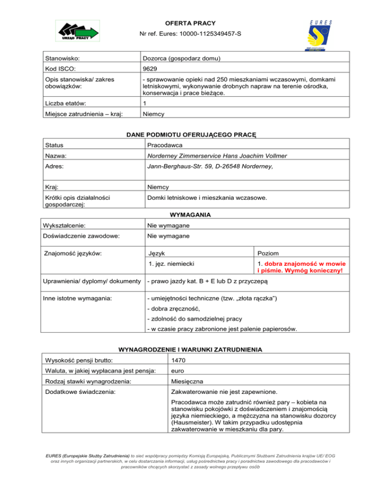 OFERTA PRACY Nr ref. Eures: 10000-1125349457-S Stanowisko: Dozorca (gospodarz domu) Kod ISCO: 9629 Opis stanowiska/ zakres obowiązków: - sprawowanie opieki nad 250 mieszkaniami wczasowymi, domkami letniskowymi, wykonywanie drobnych napraw na terenie ośrodka, konserwacja i prace bieżące. Liczba etatów: 1 Miejsce zatrudnienia – kraj: Niemcy DANE PODMIOTU OFERUJĄCEGO PRACĘ Status Pracodawca Nazwa: Norderney Zimmerservice Hans Joachim Vollmer Adres: Jann-Berghaus-Str. 59, D-26548 Norderney, Kraj: Niemcy Krótki opis działalności gospodarczej: Domki letniskowe i mieszkania wczasowe. WYMAGANIA Wykształcenie: Nie wymagane Doświadczenie zawodowe: Nie wymagane Znajomość języków: Język Poziom 1. jęz. niemiecki 1. dobra znajomość w mowie i piśmie. Wymóg konieczny! Uprawnienia/ dyplomy/ dokumenty - prawo jazdy kat. B + E lub D z przyczepą Inne istotne wymagania: - umiejętności techniczne (tzw. „złota rączka”) - dobra zręczność, - zdolność do samodzielnej pracy - w czasie pracy zabronione jest palenie papierosów. WYNAGRODZENIE I WARUNKI ZATRUDNIENIA Wysokość pensji brutto: 1470 Waluta, w jakiej wypłacana jest pensja: euro Rodzaj stawki wynagrodzenia: Miesięczna Dodatkowe świadczenia: Zakwaterowanie nie jest zapewnione. Pracodawca może zatrudnić również pary – kobieta na stanowisku pokojówki z doświadczeniem i znajomością języka niemieckiego, a mężczyzna na stanowisku dozorcy (Hausmeister). W takim przypadku udostępnia zakwaterowanie w mieszkaniu dla pary. EURES (Europejskie Służby Zatrudnienia) to sieć współpracy pomiędzy Komisją Europejską, Publicznymi Służbami Zatrudnienia krajów UE/ EOG oraz innych organizacji partnerskich, w celu dostarczania informacji, usług pośrednictwa pracy i poradnictwa zawodowego dla pracodawców i pracowników chcących skorzystać z zasady wolnego przepływu osób Nazwa firmy, z którą zostanie podpisana umowa: Norderney Zimmerservice Hans Joachim Vollmer Rodzaj umowy: Umowa o pracę Wymiar czasu pracy (praca na pełen etat/ część etatu): Praca na pełen etat Czas trwania umowy: Określony do 15.11.2015r. Liczba godzin tygodniowo: 40 Zmiany i praca w dni wolne: tak Data rozpoczęcia: Od zaraz Inne informacje: Zakaz palenia w czasie pracy! SPOSÓB SKŁADANIA WNIOSKU Wymagane dokumenty (list motywacyjny, CV itp.): CV, kserokopia prawa jazdy potwierdzające wymagane kwalifikacje. Język, w którym muszą być sporządzone przedkładane dokumenty: niemiecki Do kogo należy wysłać dokumenty: (do pracodawcy/ doradcy EURES) Do pracodawcy, pocztą tradycyjną. Gdzie należy wysłać dokumenty: (adres, adres e-mail, nr faksu z kodem kraju itp.) Norderney Zimmerservice Hans Joachim Vollmer Herr Hans Joachim Vollmer Jann-Berghaus-Str. 59 26548 Norderney Niedersachsen Deutschland Dane teleadresowe doradcy EURES lub przedstawiciela pracodawcy: (nazwisko, adres, telefon, fax, e-mail itp.) Herr Hans Joachim Vollmer 0049(176)64002543 WAŻNOŚĆ Data publikacji: 13.04.2015r. Termin przedkładania podań o pracę / zakończenia ważności oferty: Do odwołania Uprzejmie informujemy, że skontaktujemy się wyłącznie z wybranymi kandydatami. UWAGA: 1. Umowa z zagranicznym pracodawcą zostanie zawarta zgodnie z prawem kraju zatrudnienia. Oznacza to, że wszystkie roszczenia odnośnie do warunków, które obejmuje umowa, można kierować wyłącznie do odpowiedniego sądu w kraju zatrudnienia. Publiczne służby zatrudnienia (EURES) nie mogą pośredniczyć ani reprezentować pracownika w sądzie kraju zatrudnienia w przypadku sporu z pracodawcą. 2. Publiczne służby zatrudnienia (EURES) dokładają wszelkich starań, aby zapewnić rzetelność i wiarygodność ofert pracy zgłoszonych w lokalnym urzędzie pracy. Należy wyjaśnić, że oferta pracy została zgłoszona przez stronę trzecią i EURES nie odpowiada za ewentualne rozbieżności między warunkami pracy określonymi w ofercie pracy i warunkami oferowanymi przez potencjalnego pracodawcę. 3. Publiczne służby zatrudnienia (EURES) informują, że będą zbierać, przetwarzać i przekazywać potencjalnym pracodawcom zgodnie z przepisami dotyczącymi ochrony danych osobowych wszystkie dane osobowe dostarczone przez osoby poszukujące pracy. EURES (Europejskie Służby Zatrudnienia) to sieć współpracy pomiędzy Komisją Europejską, Publicznymi Służbami Zatrudnienia krajów UE/ EOG oraz innych organizacji partnerskich, w celu dostarczania informacji, usług pośrednictwa pracy i poradnictwa zawodowego dla pracodawców i pracowników chcących skorzystać z zasady wolnego przepływu osób