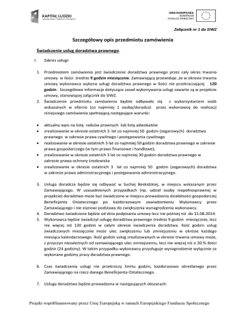 Załącznik nr 1 do SIWZ Szczegółowy opis przedmiotu zamówienia Świadczenie usług doradztwa prawnego. I. Zakres usługi: 1. Przedmiotem zamówienia jest świadczenie doradztwa prawnego przez cały okres trwania umowy w ilości średnio 9 godzin miesięcznie. Zamawiający przewiduje ,że w okresie trwania umowy wykonawca wykona usługi doradztwa prawnego w ilości nie przekraczającej 120 godzin . Szczegółowe informacje dotyczące zasad wykonywania usługi zawarte są w projekcie umowy, stanowiącej załącznik do SIWZ. 2. Świadczenie przedmiotu zamówienia będzie odbywało się z wykorzystaniem osób wskazanych w ofercie (co najmniej 1 osoba/doradca) przez wykonawcę do realizacji niniejszego zamówienia spełniającą następujące warunki: aktualny wpis na listę radców prawnych lub listę adwokatów zrealizowanie w okresie ostatnich 3 lat co najmniej 50 godzin (zegarowych) doradztwa prawnego w zakresie prawa cywilnego i postępowania cywilnego realizowanie w okresie ostatnich 3 lat co najmniej 50 godzin doradztwa prawnego w zakresie prawa gospodarczego (w tym prawo finansowe i handlowe); zrealizowanie w okresie ostatnich 3 lat co najmniej 30 godzin doradztwa prawnego w zakresie prawa ochrony środowiska zrealizowanie w okresie ostatnich 3 lat co najmniej 50 godzin (zegarowych) doradztwa w zakresie prawa administracyjnego i postępowania administracyjnego. 3. Usługa doradcza będzie się odbywać w Suchej Beskidzkiej, w miejscu wskazanym przez Zamawiającego. W uzasadnionych przypadkach (np. udział osoby niepełnosprawnej w projekcie) doradztwo może być świadczone w miejscu prowadzenia działalności gospodarczej Beneficjenta Ostatecznego po każdorazowym zawiadomieniu Wykonawcy przez Zamawiającego i nie stanowi podstawy do zwiększenia wynagrodzenia wykonawcy. 4. Doradztwo świadczone będzie od dnia podpisania umowy lecz nie później niż do 31.08.2014. 5. Wykonawca będzie świadczył usługę doradztwa prawnego średnio 9 godzin miesięcznie, lecz nie więcej niż 120 godzin w całym okresie świadczenia doradztwa. Ilość godzin usług świadczonych miesięcznie może ulec zwiększeniu lub zmniejszeniu w okresie każdego miesiąca kalendarzowego. Ilość godzin usług zrealizowanych w okresie trwania umowy może, z przyczyn niezależnych od zamawiającego ulec zmniejszeniu, lecz nie więcej niż o 20 % ilości godzin (24 godziny). W takim przypadku wykonawcy przysługuje wynagrodzenie wyłącznie za wykonane godziny pracy doradztwa prawnego. 6. Czas świadczenia usługi nie przekroczy limitu godzin, każdorazowo określanego przez Zamawiającego na rzecz danego Beneficjenta Ostatecznego. 7. Usługa doradztwa będzie prowadzona w następujących obszarach: Projekt współfinansowany przez Unię Europejską w ramach Europejskiego Funduszu Społecznego a. b. c. d. e. f. g. h. prawo i postępowanie cywilne, szeroko rozumiane prawo gospodarcze w tym prawo finansowe, handlowe, prawo ochrony środowiska prawo i postępowanie administracyjne, prawo pracy i ubezpieczeń społecznych, prawo i postępowanie podatkowe oraz postępowanie przed urzędami skarbowymi i urzędami cywilnymi oraz przed sądami administracyjnymi w tym zakresie, wynalazczość i prawo autorskie, handel zagraniczny. z zastrzeżeniem zał. nr 5 do wzoru umowy. 8. Usługa doradcza świadczona będzie w dwóch etapach: 8.1. Etap I: Wykonawca przeprowadzi diagnozę potrzeb Klienta polegającą na identyfikacji problemu oraz potrzeb związanych z prowadzeniem działalności gospodarczej poprzez przeprowadzenie szczegółowego wywiadu z klientem, analizy dokumentów. I etap usługi zakończy się sporządzeniem Formularza diagnozy (wzór stanowi załącznik do projektu umowy), w którym Doradca określi ścieżkę postępowania w celu rozwiązania zdiagnozowanych problemów. 8.2 Etap II: Obejmujący działania w ramach usługi doradczej wynikające z uprzednio przeprowadzonej diagnozy. Celem doradztwa będzie rozwiązanie lub przedstawienie propozycji rozwiązania konkretnego problemu a efektem opracowanie i/lub wdrożenie określonych usprawnień i działań w obszarze objętym usługą doradczą (za wyjątkiem doradztwa inwestycyjnego). 8.3 Usługę za wykonaną uznaje się wówczas, gdy oba etapy zostaną wykonane. W przypadku, gdy na etapie diagnozy doradca stwierdzi, że zakres usługi oczekiwany przez klienta wykracza poza zakres określony w pkt. 7, należy odmówić wykonania dalszej usługi. W takim przypadku usługa nie będzie wykonana, a Zamawiający nie zapłaci Wykonawcy za przeprowadzony etap I usługi tj. diagnoza. 9. Usługa doradcza nie może stanowić elementu stałej lub okresowej działalności ani też bieżących kosztów operacyjnych przedsiębiorstwa np. usługi w zakresie doradztwa podatkowego, reklamy, regularnych usług prawnych. Usługa ma na celu wprowadzanie innowacji w przedsiębiorstwach. 10. Usługi doradcze będą świadczone na rzecz Beneficjenta Ostatecznego po zgłoszeniu zapotrzebowania na świadczenie usług przez Zamawiającego. Za rekrutację Beneficjenta Ostatecznego odpowiada Zamawiający. 11. Wykonawca jest zobowiązany do rozpoczęcia świadczenia usługi doradztwa na rzecz Beneficjenta Ostatecznego w czasie nie dłuższym niż 2 dni robocze od dnia przekazania przez Zamawiającego informacji o zapotrzebowaniu na świadczenie usługi. Od momentu rozpoczęcia świadczenia doradztwa do momentu zakończeniu usługi na rzecz jednego Beneficjenta Ostatecznego nie powinno upłynąć więcej niż 60 dni kalendarzowych. W szczególnych wypadkach okres ten może ulec wydłużeniu, po każdorazowym zawiadomieniu Zamawiającego i uzyskaniu od niego pisemnej zgody na wydłużenie terminu świadczenia usługi. Projekt współfinansowany przez Unię Europejską w ramach Europejskiego Funduszu Społecznego 12. Wykonawca będzie zobowiązany do przedstawienia karty doradztwa (zgodnej ze wzorem przekazanym przez Zamawiającego) dla każdego Beneficjenta Ostatecznego indywidualnie