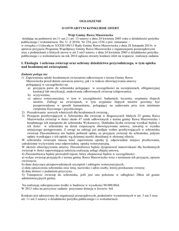 OGŁOSZENIE O OTWARTYM KONKURSIE OFERT Wójt Gminy Rawa Mazowiecka działając na podstawie art.11 ust.2 i art. 13 ustawy z dnia 24 kwietnia 2003 roku o działalności pożytku publicznego i wolontariacie /Dz. U. Z 2010r. Nr 234; poz.1536 z póź. zmianami / w związku z Uchwałą nr XXXII/180/13 Rady Gminy Rawa Mazowiecka z dnia 28 listopada 2013r. w sprawie przyjęcia Programu Współpracy Gminy Rawa Mazowiecka z organizacjami pozarządowymi oraz z podmiotami o których mowa w art.3 ust3 ustawy z dnia 24 kwietnia 2003 o działalności pożytku publicznego i o wolontariacie na rok 2014 ogłasza otwarty konkurs ofert na wsparcie realizacji zadania I. Ekologia i ochrona zwierząt oraz ochrony dziedzictwa przyrodniczego, w tym opieka nad bezdomnymi zwierzętami. Zadanie polega na: 1) Zapewnieniu opieki bezdomnym zwierzętom odłowionym z terenu Gminy Rawa Mazowiecka przed dniem zawarcia umowy, jak i w trakcie obowiązywania umowy polegającej w szczególności na: a) przyjęciu psów do schroniska polegające w szczególności na szczepieniach, obligatoryjnej kastracji lub sterylizacji, znakowaniu odłowionych zwierząt (chipowaniu); b) wyżywieniu; c) opiece weterynaryjnej, w tym w szczególności: badaniach, leczeniu, usypianiu ślepych miotów. Zabiegi na zwierzętach, w tym usypianie ślepych miotów powinny być przeprowadzone w sposób humanitarny, polegający na zadawaniu przy tym minimum cierpienia fizycznego i psychicznego; 2) Poszukiwaniu nowych właścicieli dla bezdomnych zwierząt., 3) Przejęciu przebywających w Schronisku dla zwierząt w Boguszycach Małych 25 gmina Rawa Mazowiecka zwierząt w ilości około 47 sztuk odłowionych z terenu gminy Rawa Mazowiecka i bezpłatnego ich transportu do schroniska Wykonawcy. Dokładna liczba zwierząt wynikać będzie z ich ilości w schronisku na dzień rozpoczęcia obowiązywania umowy, zawartej w wyniku niniejszego postępowania. Z uwagi na zabiegi już podjęte wobec przebywających w schronisku zwierząt Zleceniobiorca nie będzie pobierał opłaty za przyjęcie zwierząt do schroniska, jedynie opłaty wynikające z ich opieki wg dziennej stawki określonej w złożonej ofercie. W schronisku zwierzęta muszą mieć zapewniona opiekę tj. odpowiednie miejsce przebywania, całodzienne wyżywienie oraz odpowiednią opiekę weterynaryjną. W okresie obowiązywania umowy Zleceniobiorca będzie dysponował stanowiskami dla bezdomnych zwierząt w ilości zapewniającej należytą realizację usługi objętej umową. 4) Zleceniobiorca będzie prowadził rejestr, który obejmować będzie w szczególności: a) wykaz zwierząt przyjętych z terenu gminy Rawa Mazowiecka wraz z terminem ich przyjęcia, opisem zwierzęcia; b) dane dotyczące przeprowadzanych szczepień i zabiegów weterynaryjnych; c) datę opuszczenia schroniska oraz imię, nazwisko i adres osoby, której przekazano zwierzę d) datę śmierci z podaniem przyczyny. 5) Transporcie zwierząt do schroniska, jeśli jest ono położone w odległości 20km od granic administracyjnych gminy. Na realizację zabezpieczono środki w budżecie w wysokości 90.000.00zł. W 2013 roku na powyższe zadanie przyznano dotację w kwocie- 0zł. Konkurs jest adresowany do organizacji pozarządowych, podmiotów wymienionych w art. 3 ust.3 oraz art. 11 ust.3 ustawy o działalności pożytku publicznego i o wolontariacie. II. Zasady przyznawania dotacji: Dotacja zostanie przekazana zgodnie z przepisami ustawy z dnia 24 kwietnia 2003r. o działalności pożytku publicznego i o wolontariacie po podpisaniu stosownej umowy z wyłonionym oferentem, z zachowaniem następujących warunków: 1) Zadanie winno być przedmiotem działalności statutowej podmiotu ubiegającego się o dotację. 2) Zadanie nie może być realizowane przez podmiot niebędący stroną umowy. 3) Dotację na realizację zadań otrzymują podmioty, których oferty zostaną uznane za najkorzystniejsze i wybrane w postępowaniu konkursowym. 4) Dotacja jest przeznaczona na realizację zadań o których mowa w ogłoszeniu konkursowym. 5) Złożenie oferty o dotację nie gwarantuje przyznania środków w wysokości, o którą występuje oferent. 6) Zlecenie realizacji zadania przez Gminę Rawa Mazowiecka nastąpi w trybie określonym w art. 11 ust. 1 pkt. 1 ustawy z dnia 24 kwietnia 2003r. o działalności pożytku publicznego i wolontariacie. 7) Szczegółowe i ostateczne warunki realizacji, finansowane i rozliczenia zadań reguluje umowa pomiędzy oferentem a Gminą Rawa Mazowiecka. III. Termin i warunki realizacji zadania: 1) Realizacja zadania obejmuje okres od podpisania umowy do 31 grudnia 2014r. 2) Szczegółowe terminy i warunki realizacji zastaną określone każdorazowo w wiążącej strony umowie. W rozliczeniu dotacji nie będą uwzględniane dokumenty finansowe wystawione przed datą zawarcia umowy. 3) Podmiot składający ofertę na realizację zadania powinien posiadać niezbędne doświadczenie w organizacji tego typu zadań oraz zasoby rzeczowe w postaci bazy materialno – technicznej lub dostęp do takiej bazy i zasoby osobowe, zapewniające wykonanie zadania. 4) W przypadku otrzymania dotacji do każdego sprawozdania należy dołączyć: a) zestawienie dotyczące ilości przyjętych do schroniska bezdomnych zwierząt z terenu Gminy Rawa Mazowiecka z podaniem ich nr chip oraz datą przyjęcia, b) dokumentację potwierdzającą wykonanie zabiegów weterynaryjnych, c) zestawienie dotyczące ilości zwierząt adoptowanych, padłych oraz pozostających pod opieką Zleceniobiorcy. IV. Kryteria tryb i termin rozpatrywania i wyboru ofert 1. Rozstrzygnięcie ofert nastąpi w terminie do 6-dni od dnia upłynięcia terminu ich składania. 2. Oceny formalnej i merytorycznej złożonych ofert oraz ich kwalifikacji do otrzymania dotacji dokona komisja konkursowa powołana przez Wójta Gminy Rawa Mazowiecka. 3. Ocena formalna obejmuje: - terminowość i formę złożenia oferty, - zgodność wymaganych podpisów, - kompletność, popr