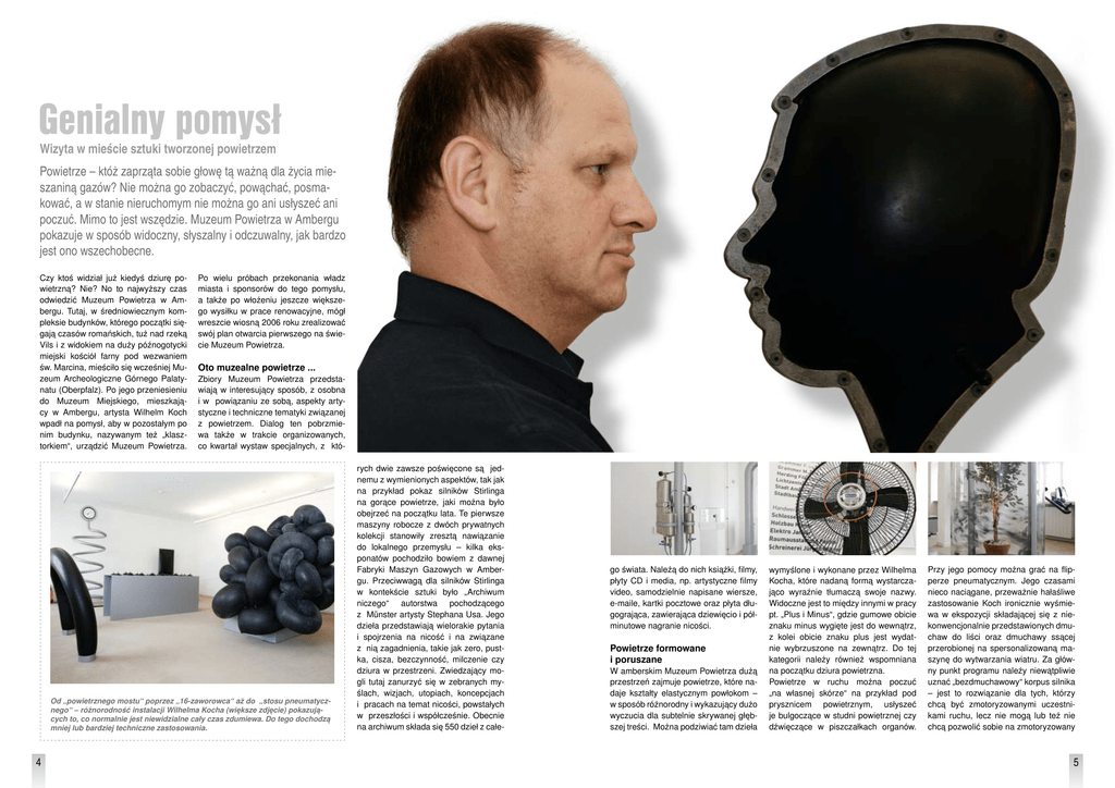 Genialny pomysł Wizyta w mieście sztuki tworzonej powietrzem Powietrze – któż zaprząta sobie głowę tą ważną dla życia mieszaniną gazów? Nie można go zobaczyć, powąchać, posmakować, a w stanie nieruchomym nie można go ani usłyszeć ani poczuć. Mimo to jest wszędzie. Muzeum Powietrza w Ambergu pokazuje w sposób widoczny, słyszalny i odczuwalny, jak bardzo jest ono wszechobecne. Czy ktoś widział już kiedyś dziurę powietrzną? Nie? No to najwyższy czas odwiedzić Muzeum Powietrza w Ambergu. Tutaj, w średniowiecznym kompleksie budynków, którego początki sięgają czasów romańskich, tuż nad rzeką Vils i z widokiem na duży późnogotycki miejski kościół farny pod wezwaniem św. Marcina, mieściło się wcześniej Muzeum Archeologiczne Górnego Palatynatu (Oberpfalz). Po jego przeniesieniu do Muzeum Miejskiego, mieszkający w Ambergu, artysta Wilhelm Koch wpadł na pomysł, aby w pozostałym po nim budynku, nazywanym też „klasztorkiem“, urządzić Muzeum Powietrza. Po wielu próbach przekonania władz miasta i sponsorów do tego pomysłu, a także po włożeniu jeszcze większego wysiłku w prace renowacyjne, mógł wreszcie wiosną 2006 roku zrealizować swój plan otwarcia pierwszego na świecie Muzeum Powietrza. Oto muzealne powietrze ... Zbiory Muzeum Powietrza przedstawiają w interesujący sposób, z osobna i w powiązaniu ze sobą, aspekty artystyczne i techniczne tematyki związanej z powietrzem. Dialog ten pobrzmiewa także w trakcie organizowanych, co kwartał wystaw specjalnych, z któ- Od „powietrznego mostu“ poprzez „16-zaworowca“ aż do „stosu pneumatycznego“ – różnorodność instalacji Wilhelma Kocha (większe zdjęcie) pokazujących to, co normalnie jest niewidzialne cały czas zdumiewa. Do tego dochodzą mniej lub bardziej techniczne zastosowania. 4 rych dwie zawsze poświęcone są jednemu z wymienionych aspektów, tak jak na przykład pokaz silników Stirlinga na gorące powietrze, jaki można było obejrzeć na początku lata. Te pierwsze maszyny robocze z dwóch prywatnych kolekcji stanowiły zresztą nawiązanie do lokalnego przemysłu – kilka eksponatów pochodziło bowiem z dawnej Fabryki Maszyn Gazowych w Ambergu. Przeciwwagą dla silników Stirlinga w kontekście sztuki było „Archiwum niczego“ autorstwa pochodzącego z Münster artysty Stephana Usa. Jego dzieła przedstawiają wielorakie pytania i spojrzenia na nicość i na związane z nią zagadnienia, takie jak zero, pustka, cisza, bezczynność, milczenie czy dziura w przestrzeni. Zwiedzający mogli tutaj zanurzyć się w zebranych myślach, wizjach, utopiach, koncepcjach i pracach na temat nicości, powstałych w przeszłości i współcześnie. Obecnie na archiwum składa się 550 dzieł z całe- go świata. Należą do nich książki, filmy, płyty CD i media, np. artystyczne filmy video, samodzielnie napisane wiersze, e-maile, kartki pocztowe oraz płyta długogrająca, zawierająca dziewięcio i półminutowe nagranie nicości. Powietrze formowane i poruszane W amberskim Muzeum Powietrza dużą przestrzeń zajmuje powietrze, które nadaje kształty elastycznym powłokom – w sposób różnorodny i wykazujący dużo wyczucia dla subtelnie skrywanej głębszej treści. Można podziwiać tam dzieła wymyślone i wykonane przez Wilhelma Kocha, które nadaną formą wystarczająco wyraźnie tłumaczą swoje nazwy. Widoczne jest to między innymi w pracy pt. „Plus i Minus“, gdzie gumowe obicie znaku minus wygięte jest do wewnątrz, z kolei obicie znaku plus jest wydatnie wybrzuszone na zewnątrz. Do tej kategorii należy również wspomniana na początku dziura powietrzna. Powietrze w ruchu można poczuć „na własnej skórze“ na przykład pod prysznicem powietrznym, usłyszeć je bulgoczące w studni powietrznej czy dźwięczące w piszczałkach organów. Przy jego pomocy można grać na flipperze pneumatycznym. Jego czasami nieco naciągane, przeważnie hałaśliwe zastosowanie Koch ironicznie wyśmiewa w ekspozycji składającej się z niekonwencjonalnie przedstawionych dmuchaw do liści oraz dmuchawy ssącej przerobionej na spersonalizowaną maszynę do wytwarzania wiatru. Za główny punkt programu należy niewątpliwie uznać „bezdmuchawowy“ korpus silnika – jest to rozwiązanie dla tych, którzy chcą być zmotoryzowanymi uczestnikami ruchu, lecz nie mogą lub też nie chcą pozwolić sobie na zmotoryzowany 5 Tłoki silnika Stirlinga porusza nic innego jak „ciepłe powietrze“. Specjalna wystawa w lecie 2008 w Muzeum Powietrza w Ambergu pokazuje wczesne egzemplarze tych urządzeń, z tego wiele pracujących. pojazd, wyjaśnia przewrotnie Wilhelm Koch. „Powietrzni” nauczyciele dla małych „powietrzo-klasistów” Tuż obok wejścia do muzeum po lewej stronie znajduje się „latająca klasa“. Tutaj w każdą pierwszą sobotę miesiąca od godz. 11.00 do 13.00 organizuje się oprowadzanie dzieci z udziałem jednej z „powietrznych nauczycielek“, po czym następują zajęcia praktyczne, których tematem jest powietrze. Na nich powietrze ujmuje się w ramy, rozpoczynając od robienia znanych wszystkim samolocików z papieru, dzieci mogą też same zamieniać się w samoloty, krótko mówiąc dowiadują się o różnorodności zawartej w tak oczywistej rzeczy jak powietrze. Z „latającej klasy“ chętnie korzystają szkoły i przedszkola, można też wykupić jej rezerwację na dziecięce urodziny. Powietrze, którego można doświadczyć i które można zrozumieć. Przy wszystkich tych atrakcjach nie zaniedbuje się także i techniki, by wymienić tu amortyzowane powietrzem siedzenia pojazdów użytkowych (produkowane przez firmę Grammer z Ambergu), jak również wyrobów KAESER KOMPRESSOREN – firmy wspierającej muzeum, „Shock Blower“ firmy Herding do pneumatycznego czyszczenia filtrów pyłowych czy wreszcie szczegółowo przedstawiona instalacja na temat mięśni pneumatycznych firmy Festo (patrz tak