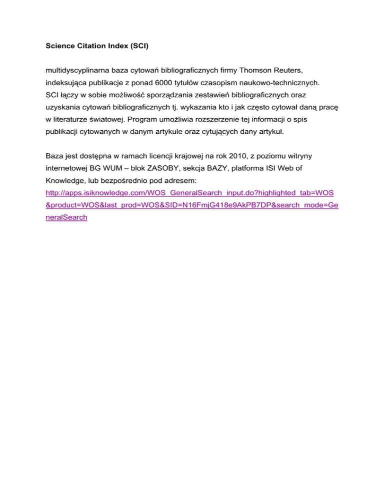 Science Citation Index (SCI) multidyscyplinarna baza cytowań bibliograficznych firmy Thomson Reuters, indeksująca publikacje z ponad 6000 tytułów czasopism naukowo-technicznych. SCI łączy w sobie możliwość sporządzania zestawień bibliograficznych oraz uzyskania cytowań bibliograficznych tj. wykazania kto i jak często cytował daną pracę w literaturze światowej. Program umożliwia rozszerzenie tej informacji o spis publikacji cytowanych w danym artykule oraz cytujących dany artykuł. Baza jest dostępna w ramach licencji krajowej na rok 2010, z poziomu witryny internetowej BG WUM – blok ZASOBY, sekcja BAZY, platforma ISI Web of Knowledge, lub bezpośrednio pod adresem: http://apps.isiknowledge.com/WOS_GeneralSearch_input.do?highlighted_tab=WOS &product=WOS&last_prod=WOS&SID=N16FmjG418e9AkPB7DP&search_mode=Ge neralSearch