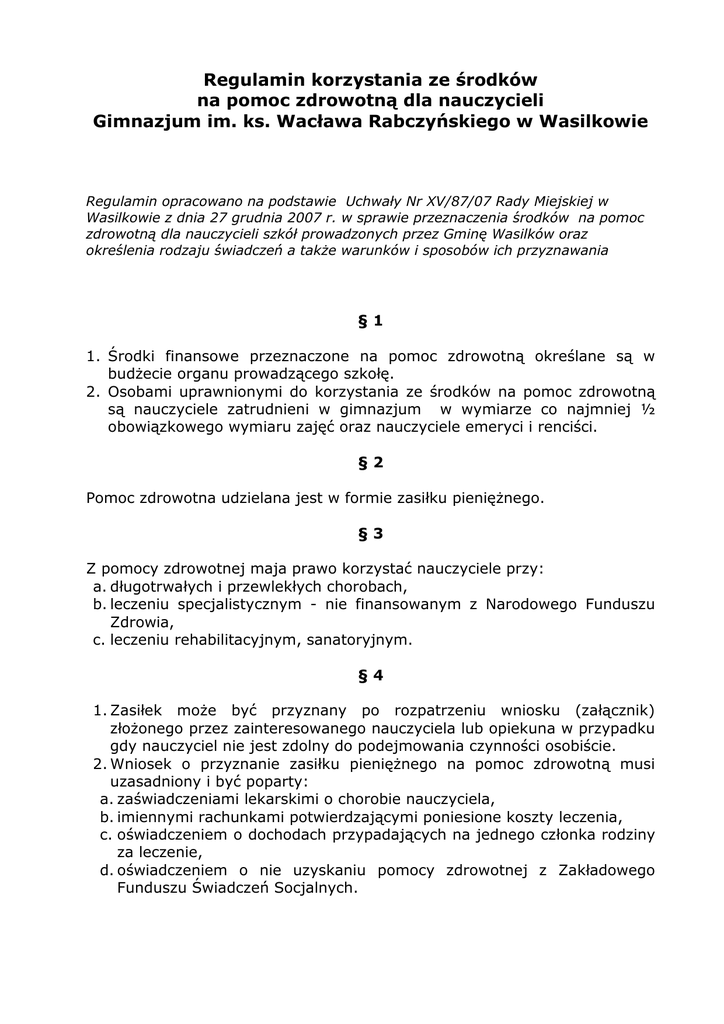 Regulamin korzystania ze środków na pomoc zdrowotną dla nauczycieli Gimnazjum im. ks. Wacława Rabczyńskiego w Wasilkowie Regulamin opracowano na podstawie Uchwały Nr XV/87/07 Rady Miejskiej w Wasilkowie z dnia 27 grudnia 2007 r. w sprawie przeznaczenia środków na pomoc zdrowotną dla nauczycieli szkół prowadzonych przez Gminę Wasilków oraz określenia rodzaju świadczeń a takŜe warunków i sposobów ich przyznawania §1 1. Środki finansowe przeznaczone na pomoc zdrowotną określane są w budŜecie organu prowadzącego szkołę. 2. Osobami uprawnionymi do korzystania ze środków na pomoc zdrowotną są nauczyciele zatrudnieni w gimnazjum w wymiarze co najmniej ½ obowiązkowego wymiaru zajęć oraz nauczyciele emeryci i renciści. §2 Pomoc zdrowotna udzielana jest w formie zasiłku pienięŜnego. §3 Z pomocy zdrowotnej maja prawo korzystać nauczyciele przy: a. długotrwałych i przewlekłych chorobach, b. leczeniu specjalistycznym - nie finansowanym z Narodowego Funduszu Zdrowia, c. leczeniu rehabilitacyjnym, sanatoryjnym. §4 1. Zasiłek moŜe być przyznany po rozpatrzeniu wniosku (załącznik) złoŜonego przez zainteresowanego nauczyciela lub opiekuna w przypadku gdy nauczyciel nie jest zdolny do podejmowania czynności osobiście. 2. Wniosek o przyznanie zasiłku pienięŜnego na pomoc zdrowotną musi uzasadniony i być poparty: a. zaświadczeniami lekarskimi o chorobie nauczyciela, b. imiennymi rachunkami potwierdzającymi poniesione koszty leczenia, c. oświadczeniem o dochodach przypadających na jednego członka rodziny za leczenie, d. oświadczeniem o nie uzyskaniu pomocy zdrowotnej z Zakładowego Funduszu Świadczeń Socjalnych. §5 1. Wnioski wraz z kompletem załączników naleŜy składać do dyrektora gimnazjum. 2. Wnioski rozpatrywane są przez dyrektora raz na kwartał (w marcu, czerwcu, wrześniu i grudniu) 3. Do opiniowania wniosków dyrektor powołuje Komisję Zdrowotną, składająca się z 3 członków: 2 przedstawicieli związków zawodowych działających na terenie Gimnazjum i wicedyrektora (Zespół Uzgodnieniowy Zakładowego Funduszu Świadczeń Socjalnych) 4. Przy rozpatrywaniu wniosków brane są pod uwagę: wysokość poniesionych przez nauczyciela kosztów leczenia oraz całokształt okoliczności wpływających na sytuację materialną np. długotrwałe zwolnienie lekarskie, przewlekła choroba, konieczność dalszego leczenia w domu, stosowanie specjalnej diety, zapewnienie choremu dodatkowej opieki, itp. oraz dochody przypadające na 1 członka rodziny nauczyciela ze wszystkich źródeł członków rodziny. §6 1. Wysokość zasiłków zaleŜy od moŜliwości finansowych funduszu. 2. Świadczenie jest przyznawane danemu nauczycielowi tylko raz w roku. 3. W wyjątkowych sytuacjach dyrektor moŜe odstąpić od tej zasady i przyznać ponownie zasiłek z w/w. środków. 4. Odmowa przyznania zasiłku pienięŜnego na pomoc zdrowotną musi być uzasadniona i przekazana w formie pisemnej osobie zainteresowanej. §7 Regulamin wchodzi w Ŝycie z dniem 16 grudnia 2008 r. …………………………………………………… Podpis i pieczeć dyrektora