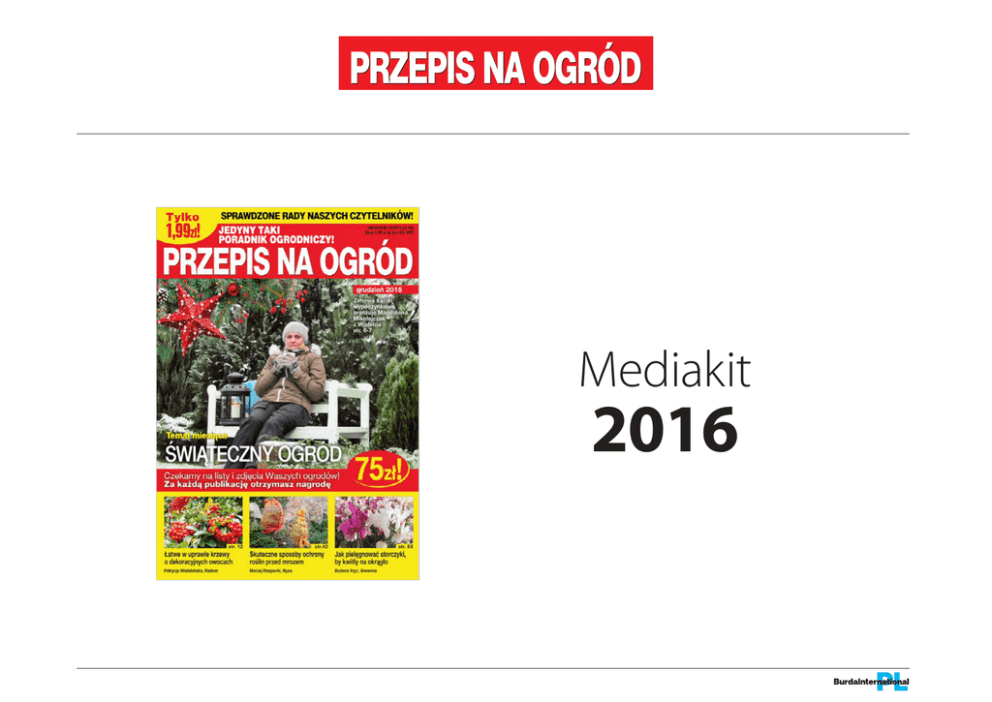 Mediakit 2016 Słowo wstępu PRZEPIS NA OGRÓD jest pierwszym i – jak do tej pory – jedynym na rynku interaktywnym miesięcznikiem ogrodniczym. Ukazuje się od kwietnia 2010 roku. PRZEPIS NA OGRÓD to czasopismo w całości tworzone przez czytelników i dla czytelników. Tytuł kierujemy do szerokiego grona miłośników ogrodnictwa, aktywnie poszukujących praktycznych porad i chętnie dzielących się własnymi doświadczeniami. W tym wyjątkowym poradniku zdradzamy sprawdzone przez czytelników i wsparte opinią ekspertów sposoby uprawy, pielęgnacji i ochrony roślin. Jednocześnie doradzamy w innych dziedzinach, takich jak zdrowie, kulinaria czy architektura ogrodowa. Z każdym rokiem nasza rodzina ogrodnicza powiększa się o kolejne interaktywne wydania specjalne, m.in. „Zdrowie z Natury”, „Kwiaty w Domu”, „Cięcie”, „Kalendarz Księżycowy”, „Najpiękniejsze Ogrody Czytelników”, „Ochrona Roślin”. Co roku do wydania styczniowego dołączamy również kalendarz ścienny ilustrowany fotografiami z ogrodów czytelników. W PRZEPISIE NA OGRÓD za każdy opublikowany list płacimy autorowi 75 złotych. Najciekawszy ogród wyróżniamy fotoreportażem, a jego właściciel trafia na okładkę i otrzymuje aż 300 złotych nagrody! Marta Suta redaktor naczelna WSTĘP Sprzedaż: 84 835 egz. Czytelnictwo: 323 005 Profil czytelnika: 27% mężczyzn, 73% kobiet Średni wiek: 48 lat Średnie i wyższe wykształcenie: 71% Dochód gospodarstwa domowego powyżej 3 000 zł: 60% Miejsce zamieszkania – miasta powyżej 50 000 mieszk.: 30% Źródło: P BC; 7/2014 – 6/2015; CCS; wszyscy; n= 29 342; realizacja Millward Brown; opracowanie Burda ZKDP; 7/2014 – 6/2015 O TYTULE Online facebook Fan page Przepisu na Ogród 16 300 fanów (stan na 02.12.2015) mojpieknyogrod.pl 397 475 odsłon 95 993 unikalnych użytkowników (01-10.2015) ONLINE Formaty i cennik Ceny obowiązują do 29.02.2016 r. CAŁA STRONA (5+148+5) x (5+210+5) mm 1/2 STRONY PION 1/2 STRONY POZIOM 1/3 STRONY PION 1/3 STRONY POZIOM II okładka 16 900 zł III okładka 15 900 zł IV okładka 19 900 zł cała strona 14 900 zł 1/2 strony 8 900 zł 1/3 strony 6 900 zł DOPŁATY Reklama w pierwszej 1/2 pisma (5+73+5) x (5+210+5) mm (5+148+5) x (5+102+5) mm (5+50+5) x (5+210+5) mm (5+148+5) x (5+67+5) mm Reklama w pierwszej 1/3 pisma Reklama przy wybranym materiale Drugi reklamodawca 15% 30% 15% 10% Inne niestandardowe reklamy na podstawie odrębnych kalkulacji. Do cen należy dodać podatek VAT w obowiązującej stawce. FORMATY I CENNIK Harmonogram wydawniczy HARMONOGRAM Numer wydania Termin dostarczenia materiałów Pierwszy dzień sprzedaży 2/2016 22.12.2015 07.01.2016 3/2016 21.01.2016 03.02.2016 4/2016 18.02.2016 02.03.2016 5/2016 17.03.2016 01.04.2016 6/2016 20.04.2016 04.05.2016 7/2016 19.05.2016 01.06.2016 8/2016 23.06.2016 06.07.2016 9/2016 21.07.2016 03.08.2016 10/2016 19.08.2016 01.09.2016 11/2016 22.09.2016 05.10.2016 12/2016 20.10.2016 02.11.2016 1/2017 18.11.2016 01.12.2016 Dane techniczne i zasady przyjmowania reklam Format netto 148x210 mm Format plików PDF wersja 1.3 Nośniki Pliki do 10 MB e-mail: [email protected] ftp://ftp.burdamedia.pl/ login: reklama hasło: burdamedia Druk offset Oprawa szyta Przygotowanie materiałów (skrót ze specyfikacji technicznej) Przestrzeń barwna: CMYK W przypadku grafik wektorowych teksty zamienione na krzywe Maksymalna całkowita suma farb (TIL): okładki: 320% strony wewnętrzne: 270% Profile ICC: okładki: DonnelleyCoated v1U strony wewnętrzne: SC paper Spady min. 5 mm; minimalna odległość istotnych elementów od linii cięcia: 5 mm Profile ICC dostępne są na ftp.burdamedia.pl w folderze DOWNLOAD. Powyższa tabela stanowi skrót specyfikacji technicznej dostępnej na www.burdamedia.pl lub ftp.burdamedia.pl w folderze DOWNLOAD. W przypadku rozbieżności obowiązuje treść pełnej specyfikacji technicznej. W razie pytań technicznych prosimy o kontakt: Tomasz Langsam, tel. +48 71 37 62 828, e-mail: [email protected] Szczegółowe warunki sprzedaży powierzchni reklamowej, w tym procedury zamawiania, publikacji oraz emisji ogłoszeń i/lub reklam w czasopismach wydawanych przez Burda Media Polska Sp. z o.o. oraz Spółki z grupy Burda Polska, tj. Burda Communications Sp. z o.o., Burda Publishing Polska Sp. z o.o., Burda GL Polska Sp. z o.o. oraz Burda NG Polska Sp. z o.o. Sp. Komandytowa, określone są w Regulaminie Zamieszczania Reklam i Ogłoszeń, dostępnym pod adresem www.burdamedia.pl DANE TECHNICZNE Dlaczego prasa 1 2 Prasa angażuje – czytanie odbywa się w skupieniu; trudno przy lekturze prasy oddawać się jednocześnie innym czynnościom. Prasa buduje wiarygodność – poprzez „towarzyszenie” czytelnikom i „rozmawianie” z nimi (poprzez e-maile, listy, ankiety, komentarze, polemiki) prasa ma opinię doradcy, który umożliwia dokonywanie wyboru. Zaufanie, jakim darzą czytelnicy swoje tytuły i ich wiarygodność wzmacniają przekaz reklamowy. 3 Prasa pogłębia przekaz – poprzez umieszczanie w reklamie pogłębionego komunikatu odbiorca może dowiedzieć się więcej o produkcie. Reklamy prasowe mogą świadomie prezentować inne treści i formy wyrazu niż reklama w innych mediach. W ten sposób reklama prasowa może wzmacniać i modyfikować wizerunek produktu. 4 Prasa dociera precyzyjnie – bogactwo tematyczne prasy oraz szeroko zakrojone badania czytelnictwa i badania konsumenckie pozwalają na precyzyjne opisanie czytelnika i tym samym dobre dopasowanie medium do reklamowanych produktów. BENEFITY 5 Prasa to medium kreatywne – oferta dla reklamodawców jest bardzo szeroka. Poza ogromną liczbą formatów na stronach pisma istnieje cały szereg różnorodnych form, takich jak wrzutki, wklejki, wszywki, banderole, paski zapachowe, zakładki, kalki i wiele innych, które zapadają w pamięć i otwierają nowy rozdział w reklamie prasowej. Możliwości są niemal nieograniczone. 6 Prasa to intymny kontakt z czytelnikiem – 
