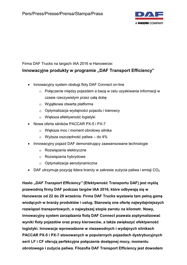 Pers/Press/Presse/Prensa/Stampa/Prasa Firma DAF Trucks na targach IAA 2016 w Hanowerze: Innowacyjne produkty w programie „DAF Transport Efficiency” • Innowacyjny system obsługi floty DAF Connect on-line o Połączenie między pojazdem a bazą w celu uzyskiwania informacji w czasie rzeczywistym przez całą dobę o Wyjątkowa otwarta platforma o Optymalizacja wydajności pojazdu i kierowcy o Większa efektywność logistyki • Nowa oferta silników PACCAR PX-5 i PX-7 o Większa moc i moment obrotowy silnika o Wyższa oszczędność paliwa – do 4% • Innowacyjny pojazd DAF demonstrujący zaawansowane technologie o Rozwiązania elektryczne o Rozwiązania hybrydowe o Optymalizacja aerodynamiczna • DAF utrzymuje pozycję lidera branży w zakresie zużycia paliwa i emisji CO2 Hasło „DAF Transport Efficiency” (Efektywność Transportu DAF) jest myślą przewodnią firmy DAF podczas targów IAA 2016, które odbywają się w Hanowerze od 22 do 29 września. Firma DAF Trucks wystawia tam pełną gamę wiodących w branży produktów i usług. Stanowią one ofertę najwydajniejszych rozwiązań transportowych, o najwyższej stopie zwrotu na kilometr. Nowy, innowacyjny system zarządzania flotą DAF Connect pozwala zoptymalizować wyniki floty pojazdów oraz pracy kierowców, a także zwiększyć efektywność logistyki. Innowacje wprowadzone w niezawodnych i wydajnych silnikach PACCAR PX-5 i PX-7 stosowanych w popularnych pojazdach dystrybucyjnych serii LF i CF oferują perfekcyjne połączenie dostępnej mocy, momentu obrotowego i zużycia paliwa. Filozofia DAF Transport Efficiency jest dowodem 2 dumy z dziedzictwa firmy DAF w oferowaniu najniższego kosztu eksploatacji i zużycia paliwa. Prezentując swój innowacyjny pojazd DAF potwierdza swoje aspiracje do utrzymania pozycji lidera pod względem ekonomicznego spalania i niskiego poziomu emisji spalin. Stanowisko firmy DAF będzie usytuowane w hali 17 kompleksu wystawowego. Na obszarze 2500 m2 przedstawiona zostanie pełna oferta pojazdów, która wyznacza standardy w zakresie jakości, niskich kosztów eksploatacji i wydajności. Oferta firmy DAF trucks obejmuje model dystrybucyjny LF, wszechstronny model CF do szerokiej gamy zastosowań i flagowy model XF do transportu ciężkiego oraz na długich dystansach. Aby uwypuklić znaczenie, jakie dla firmy DAF i sieci jej 1000 dealerów i punktów serwisowych ma kompletna gama usług towarzyszących jej światowej klasy produktom, ważne miejsce na stoisku firmy DAF na targach IAA zajmą działy PACCAR Financial, PacLease, PACCAR Parts, TRP oraz dział kontraktów serwisowych DAF MultiSupport. System zarządzania flotą DAF Connect Na targach IAA firma DAF wprowadza na rynek system DAF Connect, innowacyjny system zarządzania flotą, zapewniający firmom transportowym informacje o wydajności pojazdów i kierowców w czasie rzeczywistym. Informacje o lokalizacji pojazdów, zużyciu paliwa, przebiegach, poziomie wykorzystania floty oraz czasach przestoju są czytelnie prezentowane na dostępnym on-line pulpicie, który można dostosować do potrzeb i indywidualnych oczekiwań klienta. Przyjazny dla użytkownika pulpit można skonfigurować w taki sposób, aby prezentowane były wyczerpujące raporty o zużyciu paliwa z danymi bieżącymi i historycznymi oraz porównywaniem poszczególnych pojazdów i kierowców. Funkcja Live Fleet View dostarcza wszystkich niezbędnych informacji w zakresie lokalizacji pojazdów floty w celu zapewnienia optymalnego planowania, obejmującego pokonywane odległości, wybór trasy oraz czas jazdy konkretnego pojazdu i kierowcy. Klient może samodzielnie definiować sygnały alarmowe w przypadku wystąpienia odchyleń od żądanej prędkości, trasy, lokalizacji czy zużycia paliwa, co pozwala na natychmiastową korektę wydajności floty. 3 System DAF Connect optymalizuje dostępność pojazdów, redukuje koszt eksploatacji i usprawnia logistykę. DAF Connect również pozwala na optymalizację planowania czynności naprawczych i obsługowych oraz pozwala skorzystać z indywidualnego doradztwa firmy DAF. „Dzięki systemowi DAF Connect wkraczamy w nową erę wspierania naszych klientów, pozwalając im uzyskać najwyższą rentowność z kilometra”, twierdzi Richard Zink, dyrektor działu marketingu i sprzedaży w firmie DAF Trucks. System DAF Connect, który zostanie udostępniony w ostatnim kwartale 2016 roku, przoduje na rynku w jakości, szybkości działania, łatwości obsługi i możliwości porównywania wydajności poszczególnych pojazdów. Richard Zink dodaje: „Współpracujemy z najlepszymi, niezależnymi dostawcami systemów zarządzania flotą, co pozwala nam oferować otwartą platformę. Ma to wielkie znaczenie w przypadku flot posiadających pojazdy DAF i innych marek oraz flot DAF, które już zainwestowały w systemy zarządzania flotą”. Zoptymalizowane silniki PACCAR PX-5 i PX-7 do pojazdów serii DAF LF i CF Częścią filozofii DAF Transport Efficiency jest wprowadzenie innowacji do popularnych pojazdów dystrybucyjnych DAF LF i CF, wyposażonych w silniki PACCAR PX. Większy moment obrotowy przy niższej prędkości obrotowej silnika zwiększa komfort kierowcy i zmniejsza zużycie paliwa. Te modyfikacje jednostek napędowych w połączeniu z nowymi, szybszymi przełożeniami układów napędowych, umożliwiają ograniczenie prędkości obrotowej silnika o nawet 300 obr./min przy prędkości 85 km/h oraz zmniejszenie zużycia paliwa nawet o 4%. Nowe oprogramowanie, udoskonalone chłodzenie i zarządzanie zasilaniem powietrzem wydajnego i niezawodnego silnika PACCAR PX-5 o pojemności 4,5 litra oraz silnika PACCAR PX-7 o pojemności 6,7 litra zwiększyły moment obrotowy nawet o 12%. Maksymalny moment obrotowy 4-cylindrowego silnika PACCAR PX-5 stosowanego w pojazdach serii DAF LF wynosi teraz aż 850 Nm przy 1200–1500 obr./min, a dla silnika PACCAR PX-7 stosowanego w pojazdach serii DAF LF i CF moment obrotowy osiąga wa