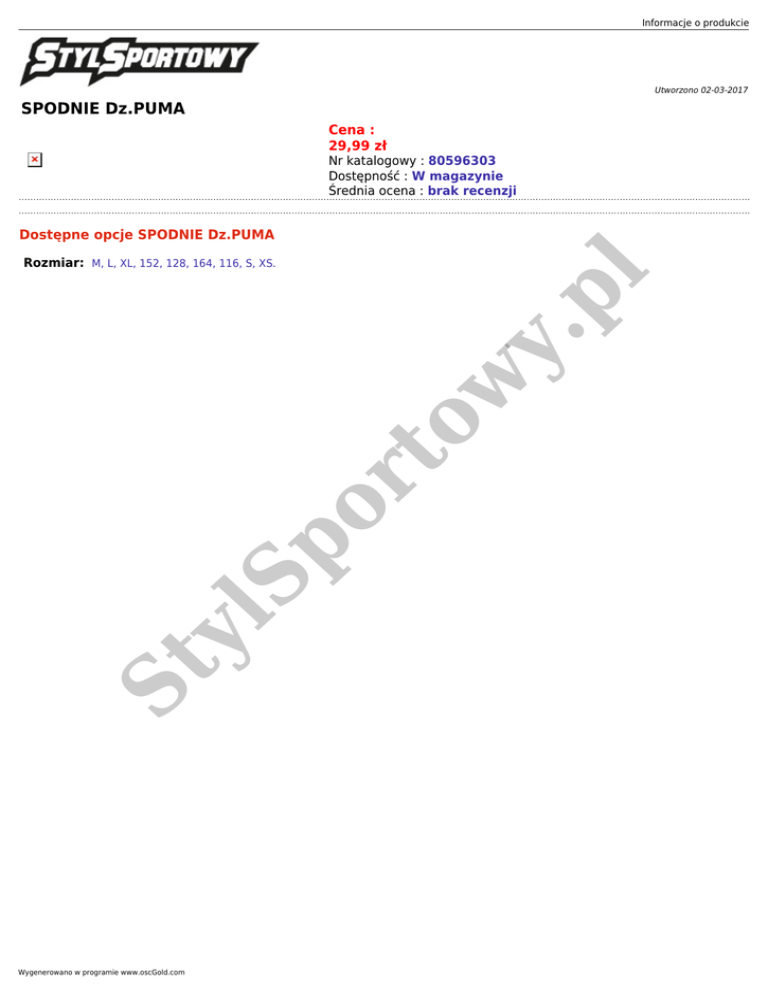 Informacje o produkcie Utworzono 02-03-2017 SPODNIE Dz.PUMA Cena : 29,99 zł Nr katalogowy : 80596303 Dostępność : W magazynie Średnia ocena : brak recenzji Dostępne opcje SPODNIE Dz.PUMA St y lS p or to w y. pl Rozmiar: M, L, XL, 152, 128, 164, 116, S, XS. Wygenerowano w programie www.oscGold.com