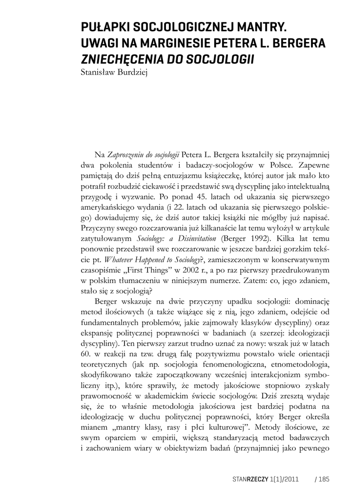Pułapki socjologicznej mantry. Uwagi na marginesie Petera L. Bergera Zniechęcenia do socjologii Stanisław Burdziej Na Zaproszeniu do socjologii Petera L. Bergera kształciły się przynajmniej dwa pokolenia studentów i badaczy-socjologów w Polsce. Zapewne pamiętają do dziś pełną entuzjazmu książeczkę, której autor jak mało kto potrafił rozbudzić ciekawość i przedstawić swą dyscyplinę jako intelektualną przygodę i wyzwanie. Po ponad 45. latach od ukazania się pierwszego amerykańskiego wydania (i 22. latach od ukazania się pierwszego polskiego) dowiadujemy się, że dziś autor takiej książki nie mógłby już napisać. Przyczyny swego rozczarowania już kilkanaście lat temu wyłożył w artykule zatytułowanym Sociology: a Disinvitation (Berger 1992). Kilka lat temu ponownie przedstawił swe rozczarowanie w jeszcze bardziej gorzkim tekście pt. Whatever Happened to Sociology?, zamieszczonym w konserwatywnym czasopiśmie „First Things” w 2002 r., a po raz pierwszy przedrukowanym w polskim tłumaczeniu w niniejszym numerze. Zatem: co, jego zdaniem, stało się z socjologią? Berger wskazuje na dwie przyczyny upadku socjologii: dominację metod ilościowych (a także wiążące się z nią, jego zdaniem, odejście od fundamentalnych problemów, jakie zajmowały klasyków dyscypliny) oraz ekspansję politycznej poprawności w badaniach (a szerzej: ideologizacji dyscypliny). Ten pierwszy zarzut trudno uznać za nowy: wszak już w latach 60. w reakcji na tzw. drugą falę pozytywizmu powstało wiele orientacji teoretycznych (jak np. socjologia fenomenologiczna, etnometodologia, skodyfikowano także zapoczątkowany wcześniej interakcjonizm symboliczny itp.), które sprawiły, że metody jakościowe stopniowo zyskały prawomocność w akademickim świecie socjologów. Dziś zresztą wydaje się, że to właśnie metodologia jakościowa jest bardziej podatna na ideologizację w duchu politycznej poprawności, który Berger określa mianem „mantry klasy, rasy i płci kulturowej”. Metody ilościowe, ze swym oparciem w empirii, większą standaryzacją metod badawczych i zachowaniem wiary w obiektywizm badań (przynajmniej jako pewnego StanRzeczy 1(1)/2011 / 185 ideału) zdają się silniej opierać ideologicznej manipulacji, choć z pewnością jej nie uniemożliwiają. Nierzadko to metody jakościowe sprzyjają ucieczce od problemów podstawowych w luźne rozważania o „tożsamości”, w pseudokrytyczną „krytyczną analizę dyskursu” itp. W każdym razie bardziej trafny jest chyba zarzut ideologizacji badań, choć i tu warto pamiętać, że i klasycy dyscypliny miewali bardzo sprecyzowane poglądy i uczestniczyli (jak np. Émile Durkheim, o czym dalej) w życiu politycznym swej epoki w stopniu nie mniejszym, niż wielu socjologów dzisiejszych. Jak wspomniałem, wiele z tych zarzutów Berger stawiał swej dyscyplinie już wcześniej, np. w artykule z 1992 r., znamiennie zatytułowanym Sociology: A Disinvitation? Wymienił tam cztery symptomy, które wskazują na upadek socjologii: zaściankowość, trywialność, przesadny racjonalizm oraz ideologizację. Jego zdaniem, zaściankowość przejawia się m.in. w wąskiej specjalizacji współczesnych socjologów, w braku znajomości przynajmniej jednego społeczeństwa niezachodniego. Trywialność ma być wynikiem bezrefleksyjnego naśladowania nauk przyrodniczych; zarzut ten powtarza Berger w tekście późniejszym, gdzie mówi wręcz o fetyszyzmie metodologicznym. Dla pocieszenia dodaje, że inne nauki humanistyczne nie są w lepszej kondycji. Krytyka Bergera to zresztą tylko jeden z wielu głosów, jakie wpisują się w szerszą debatę nad poprawnością polityczną oraz kondycją nauk społecznych i humanistyki. W Stanach Zjednoczonych dyskusja ta toczy się od dobrych kilkudziesięciu lat, choć, jak się zdaje, do tej pory koncentrowała się na kwestii kanonu lektur, wykorzystywanych na uniwersytetach w nauczaniu „podstaw kultury Zachodu” (później kurs przemianowano na „Great Books”; zob. Berman red. 1992) oraz postępów dekonstruktywizmu w takich dziedzinach, jak filozofia, literaturoznawstwo czy architektura (por. Kimball 1998). Jeden z głównych uczestników debaty, Allan Bloom, w Umyśle zamkniętym (2007) narzekał przede wszystkim na podważanie autorytetu tradycji, jej relatywizację i deprecjonowanie myślicieli od Platona do Szekspira jako „białych, martwych mężczyzn”. Jak natomiast procesy powyżej wymienione (dodajmy – przez nastawionych konserwatywnie krytyków) przebiegały w obszarze socjologii? Kondycji socjologii poświęcono specjalny numer czasopisma „Sociological Forum” z 1994 r. We wprowadzeniu do zbioru artykułów na ten temat Stephen Cole (1994) jako główne przejawy schyłku wymienił zauważalny spadek prestiżu dyscypliny, ograniczenie środków na badania i zmniejszenie się liczby studentów; Martin Seymour Lipset (1994) w swym artykule dodał jeszcze upolitycznienie socjologii, przejawiające się m.in. w niszczących konfliktach w łonie stowarzyszeń i wydziałów. W tym miejscu warto podać konkretny przykład takiego upolitycznienia, jaki wiązał / 186 StanRzeczy 1(1)/2011 się z inicjatywą prezydenta American Sociological Association (dalej: ASA), Michaela Burawoya. W 2004 r. Burawoy, zdeklarowany zwolennik socjologii publicznej (Burawoy 2005, 2009; por. Tittle 2004), która miałaby angażować się w bieżące dyskusje publiczne, nie stroniąc od jasnego opowiadania się po jednej stronie danego konfliktu, zaproponował, aby ASA podjęło uchwałę potępiającą projekt poprawki konstytucyjnej, który definiując małżeństwo jako związek kobiety i mężczyzny miał uniemożliwić zawieranie małżeństw pomiędzy osobami tej samej płci. Propozycja ta padła w kontekście debat i sporów sądowych, jakie na temat prawnej definicji małżeństwa toczyły się ówcześnie w wielu stanach USA (największe kontrowersje wzbudziła w 