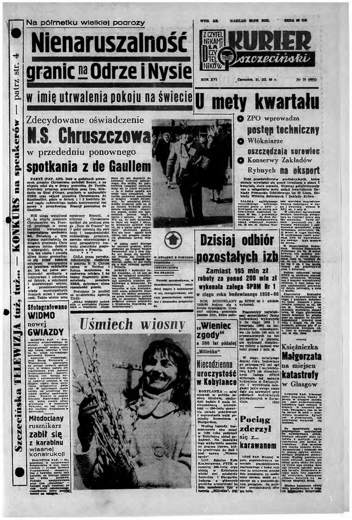 N a półm etku wielkie] poaro2y ZHfltlJ an tĄ NiK0V Zdecydowane oświadczenie ZPO wprowadza N.S. C hruszczow a postąp techniczny Włókniarze w przededniu ponownego oszczędzaia surowiec Konserwy Zakładów spotkania z de Gaullem Rybnych R3 ekSBOlt Boi* przedsiębiorstw produkcyjnych, która zdołały wywiązać sic przed terminem * planu I kwartału stale wzrasta. Wczoraj poinformowały n u o osiągnięciu mety zadań kwartalnych Za kłady Przemyśla Odzieżowego Im 22 Lipca. Za* kłady Włókien Sztucznych I Zakłady Rybne. ZAŁOGA n a jw ięk sz eg o sz czecińskiego k o b ie ce g o a a k U d u p n e y — Z PO w y w iąz ała sfc u sw y ch p r o d u k c y jn y e h u a ł l i m i Je■m m U ta n . 1 p r z e w id u je d o sta rcz en ie do d n ia d z l• le jn e g o p o n a d p la n o w y c h u b r a ń roboczych w a r to ic l o k , M ty*, d . O gólna w a r - łoM w y ro b ó w w y p ro d o k o w a n y c h d o d a tk o w o w clą* n I k w a r ta łu w y n o si w Z PO o k . X m in u . W zakła d zie zasto so w a n o o sta tn io Innow ację p o le g a , ią c ą n a c lą g ło ic l p r a c y m ią d*y z m ian a m i. N ew y s y ste m przycaynU ii« do w zro stu w y d a jn o ic l 1 sp o w oaow al oezczę d n o if c z a sa ------------------------------------- — — - w yno szą cą p rz e c ię tn ie ( k , 1S m in u t w c ią g a dniów ki* W n a jb liż sz y m czasie przy* •tą pi Z PO do w p row adza* n la no w eg o ty p u n a u y a do n y c i a . Dzisiaj odbiór pozostałych izb Sfotografowano WIDMO nowej G W IA Z D Y MOSKWA P A P . - P r a c ow nicy m oałdew aldego m sty tu tu A stronom icznego sfo to g rafo w ali w idm o Rwia zdy n o w ej, o d k ry te j » m o r c a b r . prze z n o rw e sk ie g o a stro n o m a H assela. A stronom m oskiew ski, p ro f. B o ry s W oroncow W lellam lnow . a p ec jalista od g-uiazd no w y ch o św lad czyi. 11 w idm o z ostało sfo lo g rafo w an e p rzy pom ocy iy -eeM ym etrcw eJ k a m e ry . Zdlęclo Jest b a rd z o w y raź n e t a stro n o m o w ie m a j ą n a d zie je u z y sk ać w nie d łu g im czasie d a n e d o ty czące te m p e ra tu ry gw ia zdy. W na jbliż szym czasie n ależy t e t o czekiw ać w y nik ó w analiz y a p ek tro g ra m ów . Pozw oli to poznać fizyczne w la < d w o id gw la zdy. k tó ra została afotog rafo w an a w m ocriende w y b u ch u , co Jest niezw y k le rza d k im w y p ad k iem w a stro n o m ii. Młodociany rusznikarz za b ił sią z karabinu własnej Konstrukcji BIAŁYSTOK P A P . - Za m ie sz k ały w rolejacow oicl B akałarze w o w w o). b ia ło sto c k im - 14-łetnl H yszard P rz y b o ro w sk i sk o n stru o - Uśmiech wiosny Niecodzienna uroczystość w Kobylance W ciągu mijającego dzisiaj roku budowlane co przysporzyli oni ogó Jem mlartu i wojewódz twu 3.278 lab mieszkal nych Załoga SPBM wykonała le i zadania budowlane w Świnoujś ciu i wyrównała zale głości Jakie gwego czasu dały się zauważyć przy njbotach budowlanych prowadzonych w Szcze cinie. (dra) KOBYLANKA — miej scowość W pobliiu Je ziora Miedwie, obcho dzić będzie 8 maja br. niecodzienną uroczys tość - 500-1ecie zawar cia układu pokojowego i zaprzestania walk po między Szczecinem a P o c i ą g Stargardem. Według legendy, bur mistrzowie obu miast w 1460 roku podpisali w Kobylance układ po kojowy. Na pamiątkę tego wydarzenia zasadzo no drzewo lipowe, które przetrwało do dzll I nosi nazwę „Wieniec zgody". Ł 0 D 2 P A P . W ezoraJ w LOP, Sskołne Koła godz. popołu d n io w y c h sa prze d się b io rstw a Krajoznawcze, PTTK w m oc hód rocznicę 500-1 ecia orga po g rzebow ego z Łodzi naje nlzują w Kobylance c h ał a a k o le jo w y m p iz e je t wielki slot młodzi eiy Szczecina I Stargardu. Jednym a głównych punktów uroczystości bę LO VD TN P A P . O lb rzy m i p o ż ar m a g az y n u w h isk y w p o rcie w G lasgow o k r e il a *•« J a k o n a jp o w a ż n ie js z ą k a ta s tro f ą te g o ro d z a ju w S z k o c ji w o sta tn ic h cza sa ch . P o c ią g n ęła o n a aa s« bą im le r ć M oaób — p r r s w a in le stra ż a k ó w . Z ginęli oni w p ło m ie n ia c h , lu k p rz y w a le n i w alą c y m i się zd e rzy ł się Z... karawanem Z d o ła n o od n a leź ć d a l a z a le d w ie • z a b ity c h . A k c ja rato w n ic z a je s t b a rdz o o t ru d n io n a . N ad m ia ste m (to i c z a rn a c h m a r a d y m a . R y n sz to k a m i 1 Ociekam! s ta le Jeszcze sp ły w a w h isk y , p ło n ą c a b łę k itn y m pło m ie n ie m . W edług p ra w lz o ry c z n y e h o b liczeń, p a stw ą p to m ie n i p a d ło o k o ło t<« ty slą e y litró w tego tr u n k n . S pło n ą ł ró w n ież są sie d n i m s g a zy n ty to n iu . Z B lszcsenltt ole g ły U k tę trz y sa m o ch o d y s tr s ta e k l e , p rzy sy p a n e 7rn za r.il w a lą c y c h si« a a p STR O W A — K U R IM j Rotacja j JSTOP! 7 (m ialeo* na m u ta l* I / wiadomości dis których WARUNKOWA ZGODA Londyn i Nowy Jork wspólny komunikat Macmillana i Eisenhowera o częściowym przyjęciu propozycji ZSRR WASZYNGTON PAP. Jak jo l donoalHśmy, w ogłoszonym w e wtorek wieczorem wapólnym oówUuIezcnlu Eisenhower 1 Macmlllan przyjęli czę śclowo radziecką propozycją w tprawle zaprze stania prób Jądrowych, Jednakie powrócili snów do problemu kontroli dnjąo przy tym wyrmlnie do zrozumienia, Ił zgodę n» zokau eksperymen tów uzależniają od „odpowiedniego** uregulowa nla tego problemu. Echa konferencji prasowej ZAP DOKUMENTY o zbrodniczej działalności Oberlaendera są wiarygodne - stwierdza „Le Monde" A a e a e ja ___ k tó r a o d tw o rzy ca* tą k a rie r ę d r O b eria en d e t a w o k rasi* o a ta tn lc h U la t. J e d e a a d o k u m e n tó w Św iadczy, t * p rz ó d w o jn ą byl on ---------------•ocJalM ty e m e j p rz y „ n u n d I łe u t•C hor O *ten” . W ty m c h a r a k te r z e ż a d e n u n c jo w al j a k o w ro g a Raeezy tw ie rz c h n lk a k o