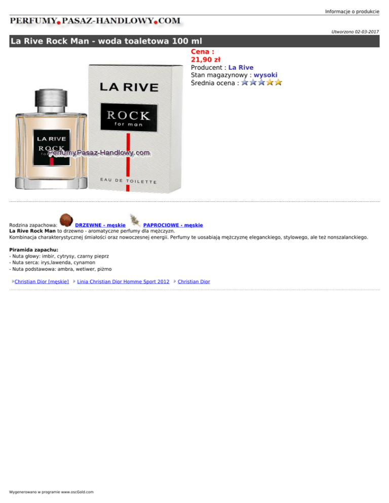 Informacje o produkcie Utworzono 02-03-2017 La Rive Rock Man - woda toaletowa 100 ml Cena : 21,90 zł Producent : La Rive Stan magazynowy : wysoki Średnia ocena : Rodzina zapachowa: DRZEWNE - męskie PAPROCIOWE - męskie La Rive Rock Man to drzewno - aromatyczne perfumy dla mężczyzn. Kombinacja charakterystycznej śmiałości oraz nowoczesnej energii. Perfumy te uosabiają mężczyznę eleganckiego, stylowego, ale też nonszalanckiego. Piramida zapachu: - Nuta głowy: imbir, cytrysy, czarny pieprz - Nuta serca: irys,lawenda, cynamon - Nuta podstawowa: ambra, wetiwer, piżmo Christian Dior [męskie] Linia Christian Dior Homme Sport 2012 Wygenerowano w programie www.oscGold.com Christian Dior
