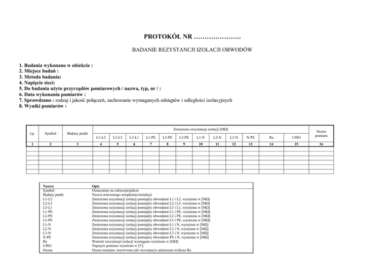 PROTOKÓŁ NR …………………. BADANIE REZYSTANCJI IZOLACJI OBWODÓW 1. Badania wykonano w obiekcie : 2. Miejsce badań : 3. Metoda badania: 4. Napięcie sieci: 5. Do badania użyto przyrządów pomiarowych / nazwa, typ, nr / : 6. Data wykonania pomiarów : 7. Sprawdzono : rodzaj i jakość połączeń, zachowanie wymaganych odstępów i odległości izolacyjnych 8. Wyniki pomiarów : Zmierzona rezystancja izolacji [MΩ] Lp. Symbol Badany punkt 1 2 3 Nazwa Symbol Badany punkt L1-L2 L2-L3 L3-L1 L1-PE L2-PE L3-PE L1-N L2-N L3-N N-PE Ra UISO Ocena L1-L2 L2-L3 L3-L1 L1-PE L2-PE L3-PE L1-N L2-N L3-N N-PE Ra UlSO Ocena pomiaru 4 5 6 7 8 9 10 11 12 13 14 15 16 Opis Oznaczenie na szkicu/projekcie Nazwa mierzonego urządzenia/instalacji Zmierzona rezystancji izolacji pomiędzy obwodami L1 i L2, wyrażona w [MΩ] Zmierzona rezystancji izolacji pomiędzy obwodami L2 i L3, wyrażona w [MΩ] Zmierzona rezystancji izolacji pomiędzy obwodami L3 i L1, wyrażona w [MΩ] Zmierzona rezystancji izolacji pomiędzy obwodami L1 i PE, wyrażona w [MΩ] Zmierzona rezystancji izolacji pomiędzy obwodami L2 i PE, wyrażona w [MΩ] Zmierzona rezystancji izolacji pomiędzy obwodami L3 i PE, wyrażona w [MΩ] Zmierzona rezystancji izolacji pomiędzy obwodami L1 i N, wyrażona w [MΩ] Zmierzona rezystancji izolacji pomiędzy obwodami L2 i N, wyrażona w [MΩ] Zmierzona rezystancji izolacji pomiędzy obwodami L3 i N, wyrażona w [MΩ] Zmierzona rezystancji izolacji pomiędzy obwodami PE i N, wyrażona w [MΩ] Wartość rezystancji izolacji wymagana wyrażona w [MΩ] Napięcie pomiaru wyrażone w [V] Ocena pomiaru: pozytywna gdy rezystancja zmierzona większa Ra Uwagi i zalecenia : Ocena końcowa : Orzeczenie: Pomiary wykonał : 1. ............................................................ 2. ............................................................