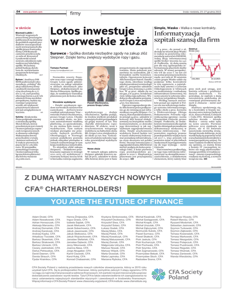 .04 www.parkiet.com Biomed-Lublin | Wartość wygranych przez firmę przetargów publicznych na dostawę do polskich szpitali produktów osoczopochodnych wytwarzanych dla spółki przez francuską firmę LFB Biomedicaments przekroczyła 20 mln zł. Krzysztof Łysakowski został nowym członkiem rady nadzorczej lubelskiej spółki. Wcześniej pełnił funkcję dyrektora ds. wytwarzania preparatów krwiopoMKT chodnych. Bytom | Analitycy DM BDM podtrzymali rekomendację „redukuj” dla akcji odzieżowej firmy i podnieśli nieznacznie cenę docelową do 2,77 zł z 2,7 zł, czyli poniżej obecnego kursu 2,9 zł. Ich zdaniem firma ma dobre perspektywy, będzie się rozwijać i poprawiać wyniki, ale większość pozytywnych zdarzeń jest już uwzględniona w MR wycenie. Selvita | Krakowska firma podpisała umowę z niemiecką spółką Merck KGaA, której przedmiotem jest rozwój i komercjalizacja cząsteczek terapeutycznych w obszarze onkologii. Maksymalna kwota przychodów z tytułu „kamieni milowych” w trakcie pierwszych pięciu lat to 1,85 mln euro. W przypadku pomyślnego rozwoju i komercjalizacji leku łączna kwota płatności dla Selvity wyniesie MKT 16,5 mln euro. Lotos inwestuje w norweskie złoża Surowce › Spółka dostała niezbędne zgody na zakup złóż Sleipner. Dzięki temu zwiększy wydobycie ropy i gazu. Tomasz Furman [email protected] Norweskie resorty finansów oraz ropy i energii wydały Grupie Lotos zgody administracyjne na zakup udziałów w złożach określanych jako Sleipner, zlokalizowanych na Morzu Północnym. Spółka podaje, że zamknięcie transakcji planowane jest do końca roku. Wzrośnie wydobycie – Dzięki uzyskanym zgodom norweskich ministerstw zamykamy definitywnie rozdział zatytułowany Yme – twierdzi Paweł Olechnowicz, prezes Grupy Lotos. Chodzi o norweskie złoże, na którym zainstalowano wadliwą platformę, co spowodowało, że nie można było ruszyć z wydobyciem. Tym samym wydane pieniądze nie przynosiły żadnych profitów. Obowiązujący w Norwegii system podatkowy pozwala jednak odzyskać pieniądze w ramach realizowanego w tym kraju wydobycia z innych złóż. To niejedyny efekt zakupu Sleipnera. – Dodatkowo przekraczamy zapisany w strategii 2011–2015 cel wydobywczy i stawiamy kolejny mocny krok w kierunku rozwoju segmentu FOT. MAT. PRASOWE w skrócie środa–niedziela, 23–27 grudnia 2015 firmy Paweł Olechnowicz, prezes Grupy Lotos. wydobywczego – dodaje Olechnowicz. Spółka podaje, że średnia wielkość produkcji z przejętych złóż przypadająca na grupę wynosi 16 tys. boe (baryłki ekwiwalentu ropy) dziennie. W efekcie, wraz z uruchomieniem wstępnego wydobycia na bałtyckim złożu B8, Grupa Lotos zwiększyła je do około 30 tys. boe. Tymczasem cel ustalony na koniec tego roku przewidywał wydobycie 24 tys. boe. Nowe złoże W ramach zakupu pakietu Sleipner gdański koncern nabył 28 proc. udziałów w złożu Alfa Sentral, które jest w fazie przygotowania do zagospodarowania. Złoże położone jest zarówno na norweskim, jak i brytyjskim szelfie kontynentalnym. Operatorem koncesji Alfa Sentral jest Statoil. Zasoby tego złoża, określane według międzynarodowej terminologii jako 2C, przypisane udziałom Grupy Lotos, wynoszą 10,3 mln boe. W 45 proc. składa się na nie gaz, a w 55 proc. kondensat (tzw. lekka ropa naftowa). Wydobycie dla udziałów przypisanych Grupie Lotos ma wynieść 4 tys. boe dziennie. Operator zagospodaruje złoże Alfa Sentral przez podłączenie go do istniejącej już infrastruktury na polu Sleipner. Co więcej, Statoil podał niedawno, że przejął 24 proc. udziałów w koncesji Alfa Sentral zlokalizowanej na brytyjskim szelfie kontynentalnym, co dowodzi jego determinacji w jak najszybszym zagospodarowania złoża. Dzięki uruchomieniu wydobycie Statoil będzie też w stanie efektywniej wykorzystać posiadaną infrastrukturę, na czym skorzysta też polska firma. Decyzja inwestycyjna o zagospodarowaniu Alfa Sentral ma być podjęta do końca przyszłego roku. Z kolei pierwsza ropa prawdopodobnie popłynie w 2020 r. Eksploatacja planowana jest przynajmniej do 2032 r. Simple, Wasko › Walka o nowe kontrakty. Informatyzacja szpitali szansą dla firm O 4 proc., do ponad 2 zł, drożały we wtorek akcje Wasko w reakcji na pozytywną rekomendację autorstwa DM BDM. Jedną akcję informatycznej spółki broker wycenia na 2,51 zł. Podkreśla, że dużą szansą jest dla niej ogólnopolska informatyzacja placówek służby zdrowia. W nowej perspektywie UE do 2020 r. na ten cel ma zostać przeznaczona kwota rzędu 900 mln zł. W ostatnim czasie grupie Wasko udało się podpisać kilka kontraktów w tym segmencie, a największym była umowa z Centrum Onkologicznym w Gliwicach na modernizację i rozbudowę infrastruktury serwerowej. Na nowe umowy w ochronie zdrowia liczy też giełdowe Simple. – Według naszych szacunków ponad 250 szpitali w Polsce nie ma wdrożonego żadnego systemu informatycznego, a tylko około 5 proc. korzysta z Elektronicznego Obiegu Dokumentów. Potrzeby tego rynku są więc ogromne – ocenia Przemysław Gnitecki, prezes Simple. Podkreśla, że dodatkowym wyzwaniem dla szpitali będzie obowiązek prowadzenia dokumentacji medycznej w formie elektronicznej. – Odpowiednie regulacje prawne prawdopodobnie wejdą w życie od 2017 r., więc przyszły rok powinien mijać w placówkach medycznych na przygotowaniu się do tego wymogu – mówi Gnitecki. Nasi rozmówcy podkreślają, że tego typu wdrożenia informatyczne są skomplikowane i czasochłonne, a dodatkowym elementem, który należy brać przy nich pod uwagę, jest kwestia ochrony i poufności danych osobowych. – To powoduje, że szpitale z dużą ostrożnością podchodzą do rozwiązań przetwarzania danych w chmurze – mówi szef Simple. Analitycy spodziewają się, że o kontrakty w branży medycznej ostro walczyć będą też m.in. Asseco Poland, Comarch i Cube.ITG. Również spółka zależna At