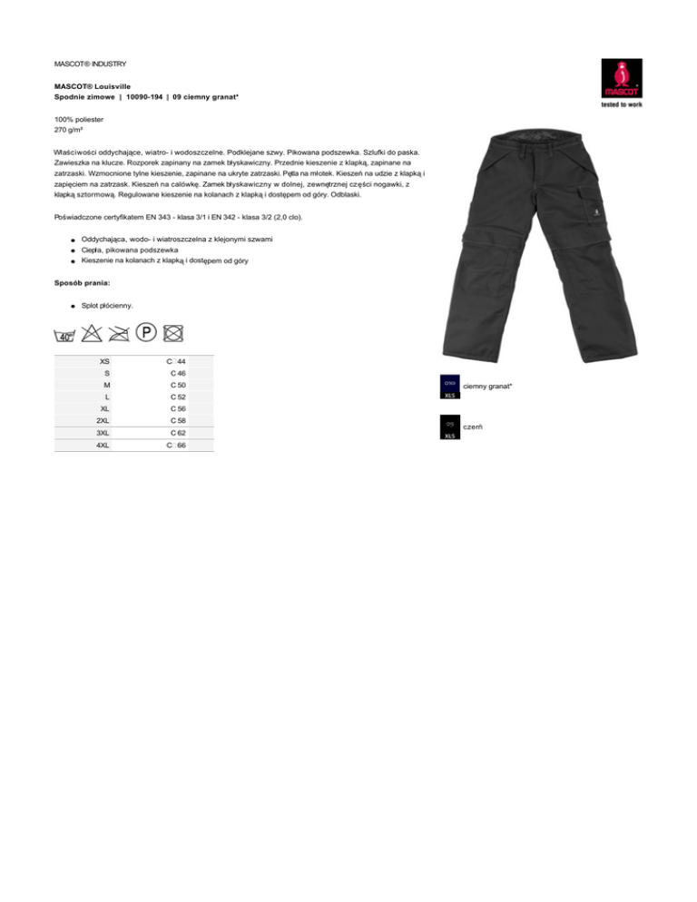 MASCOT® INDUSTRY MASCOT® Louisville Spodnie zimowe | 10090-194 | 09 ciemny granat* 100% poliester 270 g/m² Właściwości oddychające, wiatro- i wodoszczelne. Podklejane szwy. Pikowana podszewka. Szlufki do paska. Zawieszka na klucze. Rozporek zapinany na zamek błyskawiczny. Przednie kieszenie z klapką, zapinane na zatrzaski. Wzmocnione tylne kieszenie, zapinane na ukryte zatrzaski. Pętla na młotek. Kieszeń na udzie z klapką i zapięciem na zatrzask. Kieszeń na calówkę. Zamek błyskawiczny w dolnej, zewnętrznej części nogawki, z klapką sztormową. Regulowane kieszenie na kolanach z klapką i dostępem od góry. Odblaski. Poświadczone certyfikatem EN 343 - klasa 3/1 i EN 342 - klasa 3/2 (2,0 clo). l Oddychająca, wodo- i wiatroszczelna z klejonymi szwami l Ciepła, pikowana podszewka l Kieszenie na kolanach z klapką i dostępem od góry Sposób prania: l Splot płócienny. XS C44 S C 46 M C 50 L C 52 XL C 56 2XL C 58 3XL C 62 4XL C66 ciemny granat* czerń