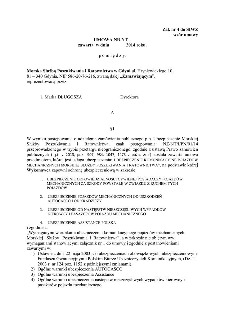 Zał. nr 4 do SIWZ wzór umowy UMOWA NR NT – zawarta w dniu 2014 roku. p o m i ę d z y: Morską Służbą Poszukiwania i Ratownictwa w Gdyni ul. Hryniewickiego 10, 81 – 340 Gdynia, NIP 586-20-76-216, zwaną dalej „Zamawiającym”, reprezentowaną przez: 1. Marka DŁUGOSZA Dyrektora A §1 W wyniku postępowania o udzielenie zamówienia publicznego p.n. Ubezpieczenie Morskiej Służby Poszukiwania i Ratownictwa, znak postępowania: NZ-NT/I/PN/01/14 przeprowadzonego w trybie przetargu nieograniczonego, zgodnie z ustawą Prawo zamówień publicznych ( j.t. z 2013, poz 907, 984, 1047, 1473 z późn. zm.) została zawarta umowa przedmiotem, której jest usługa ubezpieczenia: UBEZPIECZENIE KOMUNIKACYJNE POJAZDÓW MECHANICZNYCH MORSKIEJ SŁUŻBY POSZUKIWANIA I RATOWNICTWA”, na podstawie której Wykonawca zapewni ochronę ubezpieczeniową w zakresie: 1. UBEZPIECZENIE ODPOWIEDZIALNOŚCI CYWILNEJ POSIADACZY POJAZDÓW MECHANICZNYCH ZA SZKODY POWSTAŁE W ZWIĄZKU Z RUCHEM TYCH POJAZDÓW 2. UBEZPIECZENIE POJAZDÓW MECHANICZNYCH OD USZKODZEŃ AUTOCASCO I OD KRADZIEŻY 3. UBEZPIECZENIE OD NASTĘPSTW NIESZCZĘŚLIWYCH WYPADKÓW KIEROWCY I PASAŻERÓW POJAZDU MECHANICZNEGO 4. UBEZPIECZENIE ASSISTANCE POLSKA i zgodnie z: „Wymaganymi warunkami ubezpieczenia komunikacyjnego pojazdów mechanicznych Morskiej Służby Poszukiwania i Ratownictwa”, a w zakresie nie objętym ww. wymaganiami stanowiącymi załącznik nr 1 do umowy i zgodnie z postanowieniami zawartymi w: 1) Ustawie z dnia 22 maja 2003 r. o ubezpieczeniach obowiązkowych, ubezpieczeniowym Funduszu Gwarancyjnym i Polskim Biurze Ubezpieczycieli Komunikacyjnych, (Dz. U. 2003 r. nr 124 poz. 1152 z późniejszymi zmianami). 2) Ogólne warunki ubezpieczenia AUTOCASCO 3) Ogólne warunki ubezpieczenia Assistance 4) Ogólne warunki ubezpieczenia następstw nieszczęśliwych wypadków kierowcy i pasażerów pojazdu mechanicznego. obowiązującymi w dniu zawarcia niniejszej umowy. §2 PRZEDMIOT UBEZPIECZENIA Przedmiotem ubezpieczenia są: 1) 2) 3) 4) 5) Samochody osobowe Samochody ciężarowe Samochody specjalne Przyczepy ciężarowe Wózki widłowe (wg załącznika nr 1 w „Wymaganych warunkach ubezpieczenia komunikacyjnego pojazdów mechanicznych MSPiR” do umowy) §3 TERMIN REALIZACJI UMOWY 1. Umowę zawiera się na okres od 04.03.2014 r. do 03.03.2015 r. 2. Wykonawca wystawi polisy na każdy pojazd, jako dokument zapewniający ochronę ubezpieczeniową, na jeden rok obejmujący okres podany w załączniku nr 1 do „Wymaganych warunków ubezpieczenia komunikacyjnego pojazdów mechanicznych MSPiR” §4 ZMIANA ZAKRESU UBEZPIECZENIA 1. 2. 3. 4. Zamawiający zastrzega, iż przedmiot ubezpieczenia może ulec zmianie (ilość pojazdów objętych ochroną ubezpieczeniową), zgodnie z ust. 2. W przypadku zmniejszenia ilości pojazdów objętych ubezpieczeniem, wynagrodzenie Wykonawcy ulegnie zmniejszeniu o wartość ubezpieczenia danego pojazdu. Zmiana wynagrodzenia zostanie wprowadzona aneksem do umowy. Zmiany wskazane w ust. 2 zostaną wprowadzone aneksem do umowy, na podstawie pisemnego zgłoszenia Zamawiającego i zmiany te będą obowiązujące od dnia zgłoszenia lub innego wskazanego przez Zamawiającego. W przypadku wystąpienia konieczności objęcia ochroną ubezpieczeniową, o której mowa w niniejszej umowie, dodatkowych jednostek przedmiotu zamówienia, zamawiający udzieli zamówień zgodnie z ustawą Pzp. §5 KOSZT REALIZACJI UMOWY 1. Koszt usługi (składka należna za ubezpieczenie) zgodnie z wymogami i zakresem przewidzianym w § 1 Umowy obejmujący okres jednego roku od 04.03.2014 r. do 03.03.2015 r. określony w oparciu o ofertę (wraz z formularzem cen), stanowiące załączniki do niniejszej Umowy wynosi: ………… PLN (słownie: ……….. złoty 00/100) 2. Koszt usługi jest sumą cen polis wystawionych zgodnie z § 3 ust. 2 po uwzględnieniu przebiegu oraz wartości rynkowej pojazdów i wartości podanej przez Zamawiającego dla pojazdów specjalnych zgodnie z zał. nr 1 A do „Wymaganych warunków ubezpieczenia komunikacyjnego pojazdów mechanicznych MSPiR” §6 WARUNKI PŁATNOŚCI 1. Termin płatności składki wynosi 14 dni od daty wystawienia przez Wykonawcę polis ubezpieczeniowych, na rachunek bankowy wskazany przez Wykonawcę 2. W przypadku przelewu bankowego przyjmuje się dzień opłaty jako datę stempla bankowego pod warunkiem posiadania środków finansowych na koncie. 3. W przypadku nieopłacenia w terminie składki lub pierwszej raty za ubezpieczenia dobrowolne, Wykonawca może wypowiedzieć umowę ze skutkiem natychmiastowym i zażądać zapłacenia składki za okres przez który ponosił odpowiedzialność. W przypadku braku wypowiedzenia umowy, rozwiązuje się ona z końcem okresu ubezpieczenia, za który przypada niezapłacona składka. W przypadku nieopłacenia w terminie kolejnej raty, Wykonawca może wezwać Zamawiającego do zapłaty z zagrożeniem, że brak zapłaty w terminie 7 dni od dnia otrzymania wezwania spowoduje ustanie odpowiedzialności. Składka za ubezpieczenie OC jest wymagalna wraz z ustawowymi odsetkami. §7 SPRAWY PROCEDURALNE 1. Umowę sporządzono w trzech jednobrzmiących egzemplarzach, z których dwa egzemplarze otrzymuje Zamawiający, a jeden egzemplarz otrzymuje Wykonawca. 2. W sprawach nieuregulowanych niniejszą Umową stosuje się przepisy Kodeksu Cywilnego oraz przepisy ustawy z 28 lipca 1990 r. o działalności ubezpieczeniowej wraz z późniejszymi zmianami (tekst jednolity: Dz. U. 1996 r. Nr 11 poz. 62 z późniejszymi zmianami). 3. Wszelkie spory mogące powstać w wyniku realizacji umowy pomiędzy Zamawiającym a Wykonawcą, po wyczerpaniu możliwości polubownego załatwienia sporu będą rozstrzygane przez Sąd Rejonowy właściwy dla siedziby Zamawiającego. 4. Zamawiający może odstąpić od umowy na zasadach i ze skutkiem określonym w art. 145 ustawy Prawo zamówień publicznych. Załączniki: 1.Wymagane warunki ubezpieczenia komunikacyjnego pojazdów mec