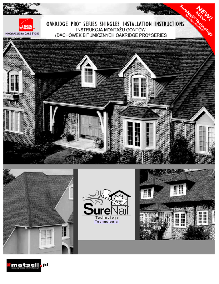 INNOWACJE NA CAŁE śYCIE INSTRUKCJA MONTAśU GONTÓW (DACHÓWEK BITUMICZNYCH OAKRIDGE PRO® SERIES Te c h no lo g ia Instrukcja zastosowania Przed zastosowaniem niniejszego wyrobu naleŜy sprawdzić, jakie są wymagania lokalnych przepisów budowlanych w zakresie wykonywania pokryć dachowych. Prezentowane gonty papowe (dachówki bitumiczne) są przeznaczone do wykonania nowych i remontu starych pokryć dachowych układanych na dowolnych, prawidłowo wybudowanych i podpartych drewnianych poszyciach połaci dachowych, do których moŜna wbijać wystarczającą ilość gwoździ o odpowiedniej wielkości. Pokrywane poszycia powinny być odpowiednio gładkie. Szczegóły są podane w lokalnych przepisach budowlanych. Uwagi i zastrzeŜenia: Producent nie będzie ponosił Ŝadnej odpowiedzialności za problemy wynikające z jakichkolwiek odstępstw od zaleceń instrukcji stosowania oraz od poniŜszych zasad: ObciąŜenie szczytu dachu: Paczki gontów układać na płask. Nie wyginać na kalenicach. Poszycie dachu: Deski poszycia o maksymalnej szerokości 6”. Minimalna grubość poszycia ze sklejki – 3/8”. Minimalna grubość poszycia z płyty OSB – 7/16”. Bez względu na rodzaj zastosowanego poszycia dachu, osoba układająca gont (dekarz) musi: 1. Montować materiał poszycia, zachowując ścisłą zgodność z instrukcjami producentów materiałów poszycia. 2. Chronić poszycie przez zamoknięciem (zawilgoceniem) przed, w czasie oraz po jego ułoŜeniu. Wentylacja: Muszą być spełnione lub nawet przewyŜszone Minimalne Standardy dla Nieruchomości (Minimum Property Standard) FHA. Obchodzenie się z gontem: Szczególną ostroŜność podczas obchodzenia się z gontami naleŜy zachować, gdy temperatura otoczenia spada poniŜej 40°F. Przechowywanie: Przechowywać w zadaszonych miejscach o dobrej wentylacji, przy maksymalnej temperaturze otoczenia wynoszącej 110°F. Układać w stosy na płask (maksymalnie do wysokości 13 paczek). Podczas składowania na placu budowy chronić gont przed działaniem czynników atmosferycznych. Nie przechowywać w pobliŜu rurociągów pary, grzejników, itp. Gwoździe – muszą być ocynkowane, o wymiarze 11 lub 12, główki mają mieć średnicę co najmniej 3/8”. Zszywki – wymiar co najmniej 16, minimalna szerokość koronki 15/16”, muszą mieć wystarczającą długość, aby moŜna je było wbić na głębokość 3/4” w drewniane poszycie dachu lub na wylot przez obszycie dachu zgodne z APA. Zszywki muszą być odporne na korozję. Wszystkie łączniki (elementy mocujące) muszą być wbite najmniej 3/4” do materiału pokrycia dachowego lub całkowicie przebijać obszycie na wylot. Wbity prawidłowo min. średnica 3/8” Wbity nieprawidłowo Poszycie Gont Uwaga: Firma Owens Corning zaleca stosowanie gwoździ jako preferowanej metody mocowania gontów do drewnianych połaci dachowych lub do innych powierzchni, do których da się wbijać gwoździe. OstrzeŜenie: Powierzchnia dachu moŜe być śliska, szczególnie, gdy jest mokra lub oblodzona. Podczas układania gontów naleŜy stosować zabezpieczenia przed upadkiem z wysokości. Nosić buty na gumowych podeszwach. Chodzić ostroŜnie. ZagroŜenie przez spadające przedmioty: Obszar poniŜej wykonywanych prac naleŜy zabezpieczyć, podobnie, jak materiały składowane na dachu. Niezabezpieczony materiał moŜe zsunąć się z dachu. Materiały układać na poziomej płaszczyźnie lub zabezpieczyć w sposób uniemoŜliwiający ześlizgnięcie. Nosić kask ochronny. 1 Specjalna obróbka dekarska okapów: Warstwa podkładowa z materiału WatherLock® lub inna alternatywna samoprzylepna membrana na okapy i obróbki blacharskie musi być załoŜona tak, aby sięgała co najmniej 24” poza wewnętrzną linię ściany budynku. Postępować zgodnie z instrukcją montaŜu dostarczoną przez producenta materiału. Zob. Rys.1 Rys. 1 Specjalna obróbka dekarska okapów Obróbka dekarska w wymaganych miejscach 24” poza wewnętrzną linię ściany budynku linia ściany budynku 2 Podkładowa warstwa nieprzepuszczalna: Standardowe nachylenie dachu (4” na 12” lub więcej). NałoŜenie warstwy podkładowej, metalowych okapników krawędziowych i obróbki dekarskiej okapów: Zob. Rys. 2. Mały kąt nachylenia: (od 2” na 12” do wartości poniŜej 4” na 12”). NałoŜenie warstwy podkładowej i metalowych okapników krawędziowych: Zob. Rys. 2A Rys. 2 Podkładowa warstwa nieprzepuszczalna na dachu o standardowym nachyleniu. Spoiny pionowe 6’ min. Nachylenie 4” na 12” lub więcej Krawędź okapnikana filcu przy nachylonej krawędzi dachu 2” Wierzchnia zakładka Gwoździe 4’ min Zakładka końcowa Filc na okapniku przy krawędzi okapu Rys. 2A Podkładowa warstwa nieprzepuszczalna na dachu o małym kącie nachylenia. Kąty nachylenia od 2” na 12” do wartości poniŜej 4” na 12”). Krawędź ociekacza okapnika Linia ściany Krawędź ociekaokapcza nika Pas początpokowy czątko wy Zakładka końcowa 12” Pierwszy i kolejne pasy rzędymają mająszeroszerokość 36” z zakładką na 19”19” 3 Linie rysowane kredą: Dla ułatwienia wyrównania gontów wzdłuŜ pasów zalecane jest odciśnięcie linii kredowych na odsłoniętej powierzchni warstwy podkładowej, jeszcze przed układaniem gontów. Zob. Rys. 3. Rys. 3 Znakowanie linii kredowych. 13 3/8” dla gontów Oakridge PRO 40® oraz Oakridge PRO 50® 4 Mocowanie gontów: Standardowy schemat mocowania gontów: Zob. Rys. 4. Łączniki (elementy mocujące) muszą się znajdować w obszarze gontów SureNail® przeznaczonym do mocowania ich do podłoŜa. Zob. Rys. 4. Uwaga: Nie wolno umieszczać łączników (elementów mocujących) na pasku uszczelniającym. Standardowy schemat mocowania gontów na dachu mansardowym lub stromym: Zob. Rys. 4A. WYMAGANIA: Jeśli nachylenie dachu przekracza 60 stopni lub 21 cali na stopę, naleŜy zastosować sześć łączników i cztery „placki” plastycznego lepiku bitumicznego na kaŜd