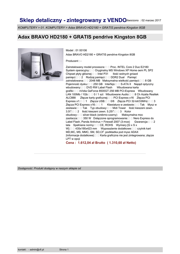 Sklep detaliczny - zintegrowany z VENDOUtworzono : 02 marzec 2017 KOMPUTERY > 01. KOMPUTERY > Adax BRAVO HD2180 + GRATIS pendrive Kingston 8GB Adax BRAVO HD2180 + GRATIS pendrive Kingston 8GB Model : 01 00106 Adax BRAVO HD2180 + GRATIS pendrive Kingston 8GB Producent : Zainstalowany model procesora: Proc. INTEL Core 2 Duo E2180 System operacyjny: Oryginalny MS Windows XP Home oem PL SP2 Chipset płyty głównej: Intel P31 Ilość wolnych gniazd pamięci: 2 Rodzaj pamięci: DDR2 Dual Pamięć zainstalowana: 2048 MB Maksymalna wielkość pamięci: 8 GB Pojemność dysku: 250 GB Interfejs: S-ATA II Napęd optyczny wbudowany: DVD RW Label Flash Wbudowana karta grafiki: nVidia GeForce 8500GT 256 MB PCI-Express Wbudowany LAN 100Mb / 1Gb: 0 / 1 szt Wbudowane Audio: 8 Ch Azalia Realtek ALC888 Złącze karty graficznej: PCI Express x16 Złącza PCI Express x1: 1 Złącza USB: 0/6 Złącza PCI 32-bit/33MHz: 3 Złącza PCI Express x16: 1 Klawiatura w zestawie: Tak Mysz w zestawie: Tak Typ obudowy: Midi Tower Ilość kieszeni zewn. 3.5\": 2 Ilość kieszeni zewn. 5.25\": 3 Kolor obudowy: silver-black (srebrno-czarny) Maksymalna moc zasilacza: 350 W Dołączone oprogramowanie: Nero Express do Label Flash, Panda Antivirus + Firewall 2007 (3-mce) Gwarancja: 2 lata Spełniane normy: CE, ROHS Wymiary [G x S x W]: 435x190x423 mm Wyposażenie dodatkowe: czytnik kart MD,MC, MS, MMC, SM, SD,CF ;podkładka pod mysz ADAX |Informacje dodatkowe|: Karta graficzna nie jest zintegrowana; złącze LPT w opcji Cena : 1.612,04 zł Brutto ( 1.310,60 zł Netto) Dostępność: Produkt dostępny w naszym sklepie od kontakt : - [email protected] Strona 1