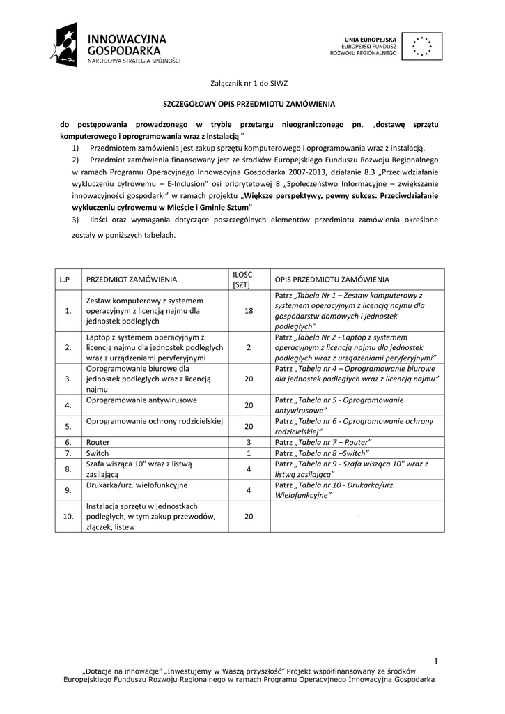 Załącznik nr 1 do SIWZ SZCZEGÓŁOWY OPIS PRZEDMIOTU ZAMÓWIENIA do postępowania prowadzonego w trybie przetargu nieograniczonego pn. „dostawę sprzętu komputerowego i oprogramowania wraz z instalacją " 1) Przedmiotem zamówienia jest zakup sprzętu komputerowego i oprogramowania wraz z instalacją. 2) Przedmiot zamówienia finansowany jest ze środków Europejskiego Funduszu Rozwoju Regionalnego w ramach Programu Operacyjnego Innowacyjna Gospodarka 2007-2013, działanie 8.3 „Przeciwdziałanie wykluczeniu cyfrowemu – E-Inclusion” osi priorytetowej 8 „Społeczeństwo Informacyjne – zwiększanie innowacyjności gospodarki” w ramach projektu „Większe perspektywy, pewny sukces. Przeciwdziałanie wykluczeniu cyfrowemu w Mieście i Gminie Sztum" 3) Ilości oraz wymagania dotyczące poszczególnych elementów przedmiotu zamówienia określone zostały w poniższych tabelach. L.P 1. 2. 3. 4. 5. 6. 7. 8. 9. 10. PRZEDMIOT ZAMÓWIENIA Zestaw komputerowy z systemem operacyjnym z licencją najmu dla jednostek podległych Laptop z systemem operacyjnym z licencją najmu dla jednostek podległych wraz z urządzeniami peryferyjnymi Oprogramowanie biurowe dla jednostek podległych wraz z licencją najmu Oprogramowanie antywirusowe Oprogramowanie ochrony rodzicielskiej Router Switch Szafa wisząca 10" wraz z listwą zasilającą Drukarka/urz. wielofunkcyjne Instalacja sprzętu w jednostkach podległych, w tym zakup przewodów, złączek, listew ILOŚĆ [SZT] 18 2 20 20 20 3 1 4 4 20 OPIS PRZEDMIOTU ZAMÓWIENIA Patrz „Tabela Nr 1 – Zestaw komputerowy z systemem operacyjnym z licencją najmu dla gospodarstw domowych i jednostek podległych” Patrz „Tabela Nr 2 - Laptop z systemem operacyjnym z licencją najmu dla jednostek podległych wraz z urządzeniami peryferyjnymi” Patrz „Tabela nr 4 – Oprogramowanie biurowe dla jednostek podległych wraz z licencją najmu” Patrz „Tabela nr 5 - Oprogramowanie antywirusowe” Patrz „Tabela nr 6 - Oprogramowanie ochrony rodzicielskiej” Patrz „Tabela nr 7 – Router” Patrz „Tabela nr 8 –Switch” Patrz „Tabela nr 9 - Szafa wisząca 10" wraz z listwą zasilającą” Patrz „Tabela nr 10 - Drukarka/urz. Wielofunkcyjne” - 1 „Dotacje na innowacje” „Inwestujemy w Waszą przyszłość” Projekt współfinansowany ze środków Europejskiego Funduszu Rozwoju Regionalnego w ramach Programu Operacyjnego Innowacyjna Gospodarka TABELA NR 1 Przedmiot zamówienia: Ilość: Zastosowanie: Okres gwarancji: Typ: Parametr Wydajność obliczeniowa Pamięć operacyjna RAM Wbudowane złącza wewnętrzne (na płycie głównej) Porty I/O Dysk twardy Napęd optyczny Czytnik kart Karta sieciowa Karta dźwiękowa Karta graficzna Obudowa/Zasilacz Zestaw komputerowy z systemem operacyjnym z licencją najmu dla jednostek podległych 18 Komputer będzie wykorzystywany dla potrzeb aplikacji biurowych, aplikacji edukacyjnych, aplikacji obliczeniowych, przeglądania multimediów, dostępu do Internetu oraz poczty elektronicznej Minimum 60 miesięcy Komputer stacjonarny Minimalne wymagane parametry Oferowany procesor musi zapewnić wydajność, przy nominalnych parametrach pracy procesora (określonych przez producenta procesora, niedozwolony jest tzw. „overclocking”) mierzoną za pomocą testu PassMark CPU Mark minimum 4790 punktów. Procesor musi występować w zestawieniu na stronie: http://cpubenchmark.net/cpu_list.php (załączyć wydruk ze strony internetowej) Zainstalowana pamięć operacyjna o pojemności minimum 8 GB. a) 1 złącze PCI-EXPRESS 3.0 x16 b) 1 złącze PCI-EXPRESS x1 (lub wyższe), dopuszcza się typu Low Profile c) 3 porty SATA 3Gb/s (lub wyższe) a) 1x port sieciowy RJ 45 b) min. 8 portów USB w tym 2 USB 3.0 (min. 2 porty wyprowadzone na panelu przednim obudowy). Wymagana ilość i rozmieszczenie (na zewnątrz obudowy komputera) portów USB nie może być osiągnięta w wyniku stosowania konwerterów, przejściówek, itp. c) 1x port DVI-D lub HDMI lub DisplayPort d) 1x port VGA 500 GB, z interfejsem SATA, rozmiar 3,5” Nagrywarka DVD+/-RW S-ATA 5,25" wraz z oprogramowaniem do nagrywania płyt. Napęd przystosowany do pracy w pozycji poziomej i pionowej. Czytnik kart pamięci multimedialnych Port sieci LAN 10/100/1000 Ethernet RJ 45 Zintegrowana, gniazda słuchawek i mikrofonu wyprowadzone na przedni i tylny panel obudowy Karta graficzna zintegrowana a) Umożliwiająca pracę w pionie jak i w poziomie, z obsługą kart PCI Express (dopuszcza się karty typu typu Low Profile), wyposażona w min. 2 kieszenie: 1 szt. 5,25” (zewnętrzna), 1 szt. 3,5” (wewnętrzna). b) Obudowa powinna fabrycznie umożliwiać montaż min. 1 szt. dysku 3,5” lub 2,5”. c) Suma wymiarów obudowy nie może przekraczać 82 cm. d) Moduł konstrukcji obudowy w jednostce centralnej komputera powinien pozwalać na demontaż kart rozszerzeń, napędu optycznego i 3,5” dysku twardego bez konieczności użycia narzędzi. e) Obudowa w jednostce centralnej musi być otwierana bez konieczności użycia narzędzi oraz powinna posiadać czujnik otwarcia obudowy współpracujący z BIOS’em płyty głównej. f) Obudowa musi umożliwiać zastosowanie zabezpieczenia fizycznego w postaci linki metalowej (złącze blokady Kensingtona lub równoważne) oraz kłódki (oczko w obudowie do założenia kłódki) 2 „Dotacje na innowacje” „Inwestujemy w Waszą przyszłość” Projekt współfinansowany ze środków Europejskiego Funduszu Rozwoju Regionalnego w ramach Programu Operacyjnego Innowacyjna Gospodarka rozwiązanie zabezpieczające sprzęt przed kradzieżą. Zasilacz o mocy dostosowanej do oferowanego sprzętu, pracujący w sieci 230V 50/60Hz prądu zmiennego i efektywności min. 80%. Klawiaturę USB w układzie QWERTY obsługującą standard polski programisty, długość przewodu – 1,5m. Mysz optyczną USB z trzema klawiszami oraz rolką (scroll), długość przewodu – 1,5m. Patrz „Tabela nr 3 - System operacyjny z licencją najmu dl
