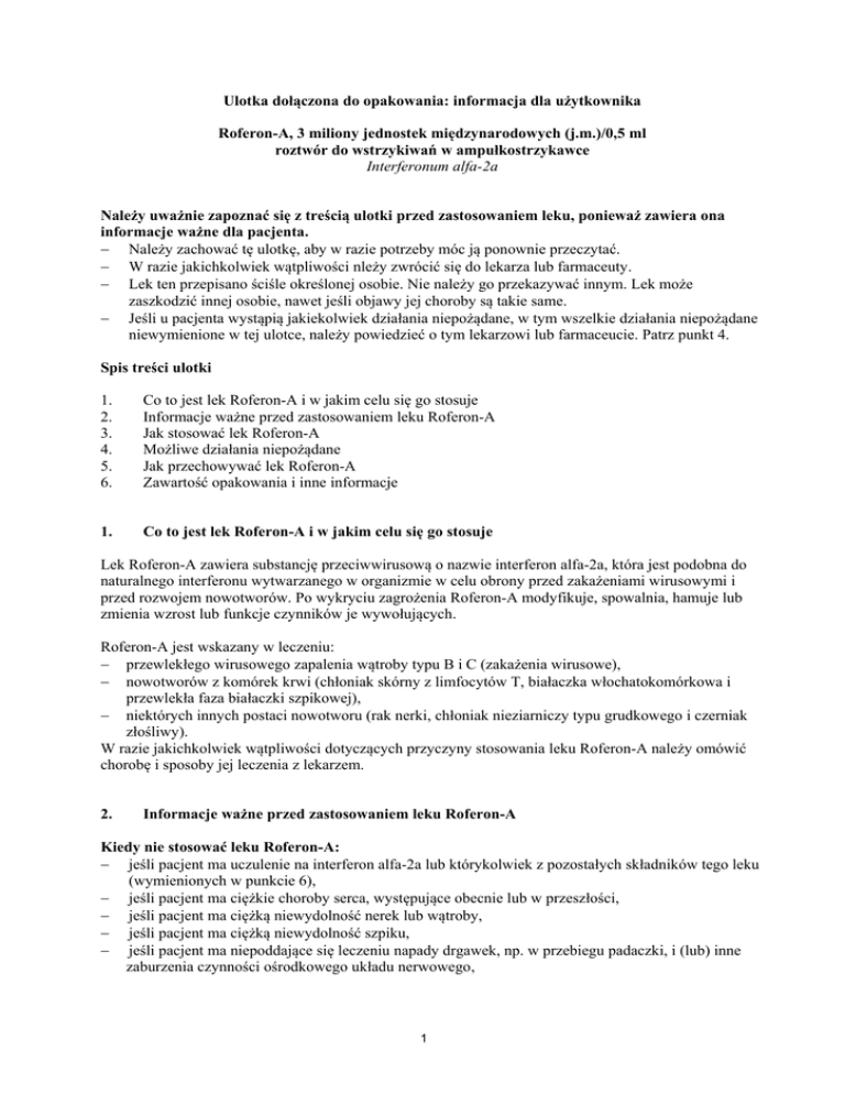 Ulotka dołączona do opakowania: informacja dla użytkownika Roferon-A, 3 miliony jednostek międzynarodowych (j.m.)/0,5 ml roztwór do wstrzykiwań w ampułkostrzykawce Interferonum alfa-2a Należy uważnie zapoznać się z treścią ulotki przed zastosowaniem leku, ponieważ zawiera ona informacje ważne dla pacjenta. Należy zachować tę ulotkę, aby w razie potrzeby móc ją ponownie przeczytać. W razie jakichkolwiek wątpliwości nleży zwrócić się do lekarza lub farmaceuty. Lek ten przepisano ściśle określonej osobie. Nie należy go przekazywać innym. Lek może zaszkodzić innej osobie, nawet jeśli objawy jej choroby są takie same. Jeśli u pacjenta wystąpią jakiekolwiek działania niepożądane, w tym wszelkie działania niepożądane niewymienione w tej ulotce, należy powiedzieć o tym lekarzowi lub farmaceucie. Patrz punkt 4. Spis treści ulotki 1. 2. 3. 4. 5. 6. Co to jest lek Roferon-A i w jakim celu się go stosuje Informacje ważne przed zastosowaniem leku Roferon-A Jak stosować lek Roferon-A Możliwe działania niepożądane Jak przechowywać lek Roferon-A Zawartość opakowania i inne informacje 1. Co to jest lek Roferon-A i w jakim celu się go stosuje Lek Roferon-A zawiera substancję przeciwwirusową o nazwie interferon alfa-2a, która jest podobna do naturalnego interferonu wytwarzanego w organizmie w celu obrony przed zakażeniami wirusowymi i przed rozwojem nowotworów. Po wykryciu zagrożenia Roferon-A modyfikuje, spowalnia, hamuje lub zmienia wzrost lub funkcje czynników je wywołujących. Roferon-A jest wskazany w leczeniu: przewlekłego wirusowego zapalenia wątroby typu B i C (zakażenia wirusowe), nowotworów z komórek krwi (chłoniak skórny z limfocytów T, białaczka włochatokomórkowa i przewlekła faza białaczki szpikowej), niektórych innych postaci nowotworu (rak nerki, chłoniak nieziarniczy typu grudkowego i czerniak złośliwy). W razie jakichkolwiek wątpliwości dotyczących przyczyny stosowania leku Roferon-A należy omówić chorobę i sposoby jej leczenia z lekarzem. 2. Informacje ważne przed zastosowaniem leku Roferon-A Kiedy nie stosować leku Roferon-A: jeśli pacjent ma uczulenie na interferon alfa-2a lub którykolwiek z pozostałych składników tego leku (wymienionych w punkcie 6), jeśli pacjent ma ciężkie choroby serca, występujące obecnie lub w przeszłości, jeśli pacjent ma ciężką niewydolność nerek lub wątroby, jeśli pacjent ma ciężką niewydolność szpiku, jeśli pacjent ma niepoddające się leczeniu napady drgawek, np. w przebiegu padaczki, i (lub) inne zaburzenia czynności ośrodkowego układu nerwowego, 1 jeśli pacjent ma przewlekłe zapalenie wątroby z zaawansowaną, niewyrównaną niewydolnością lub marskością wątroby, jeśli pacjent jest lub był niedawno leczony z powodu przewlekłego zapalenia wątroby lekami osłabiającymi czynność układu immunologicznego. Lek Roferon-A jest przeciwwskazany u dzieci do 3 lat, ponieważ zawiera jako substancję pomocniczą alkohol benzylowy w ilości 10 mg/ml roztworu. Lek może powodować zatrucia i reakcje alergiczne (anafilaktoidalne) u noworodków i dzieci do 3 lat. W leczeniu niektórych chorób Roferon-A może być stosowany w skojarzeniu z innymi lekami. W takiej sytuacji lekarz wyjaśni wszelkie dodatkowe ważne informacje dotyczące stosowania leku Roferon-A. Ostrzeżenia i środki ostrożności Przed rozpoczęciem stosowania leku Roferon-A należy omówić to z lekarzem lub farmaceutą. Należy poinformować lekarza: o zaburzeniach lub chorobach psychicznych, obecnie lub w przeszłości, o łuszczycy (choroba, której objawami są nawracające, suche, nieregularne, łuszczące się zmiany skórne), o chorobach nerek, serca lub wątroby, o chorobach autoimmunologicznych, np. chorobach tarczycy, zapaleniu naczyń krwionośnych, obecnie lub w przeszłości, o przeprowadzonym lub planowanym w najbliższej przyszłości przeszczepieniu narządu (np. nerki) lub szpiku kostnego, o stwierdzonej lub podejrzewanej ciąży, o małej liczbie krwinek, o cukrzycy (choroba objawiająca się wysokim stężeniem glukozy we krwi), o innych chorobach krwi, o leczeniu z powodu przewlekłego zapalenia wątroby typu C, o zakażeniu wirusem HIV i leczeniu lekami przeciwretrowirusowymi, o przyjmowaniu jakichkolwiek innych leków (w tym również leków, które nie zostały przepisane przez lekarza), jeśli dorosły pacjent nadużywa lub w przeszłości nadużywał substancji psychoaktywnych (np. alkoholu lub niektórych leków). Należy poinformować lekarza o chorobie krwi lub cukrzycy. W takim przypadku lekarz może zlecić pobieranie próbek krwi w stałych odstępach czasu w celu sprawdzenia jej składu, który może się zmienić podczas terapii. Na podstawie uzyskanych wyników badań krwi lekarz może ustalić nową dawkę leku Roferon-A lub innych leków przyjmowanych w tym samym czasie. Ciężka reakcja alergiczna. Jeśli podczas stosowania leku Roferon-A wystąpią objawy ciężkiej reakcji alergicznej (takie jak trudności w oddychaniu, świszczący oddech lub pokrzywka), należy natychmiast zgłosić się po pomoc lekarską. Gorączka (zakażenie). Jeśli w trakcie terapii lekiem Roferon-A wystąpi utrzymująca się gorączka lub inne objawy zakażenia (szczególnie dotyczy to pacjentów ze zmniejszoną liczbą białych krwinek), należy niezwłocznie zgłosić się do lekarza. Lekarz wdroży odpowiednie leczenie zakażenia i rozważy zakończenie terapii lekiem Roferon-A. Zaburzenia psychiczne. Jeśli w trakcie leczenia lekiem Roferon-A wystąpią objawy depresji, takie jak smutek, uczucie beznadziejności, bezwartościowości, niezdolność do radzenia sobie z codziennymi obowiązkami lub myśli samobójcze, należy natychmiast skontaktować się z lekarzem. 2 Zaburzenia widzenia. Jeśli w trakcie lub po zakończeniu leczenia lekiem Roferon-A wystąpi pogorszenie ostrości lub utrata widzenia, należy natychmiast zgłosić się do lekarza. Lek 