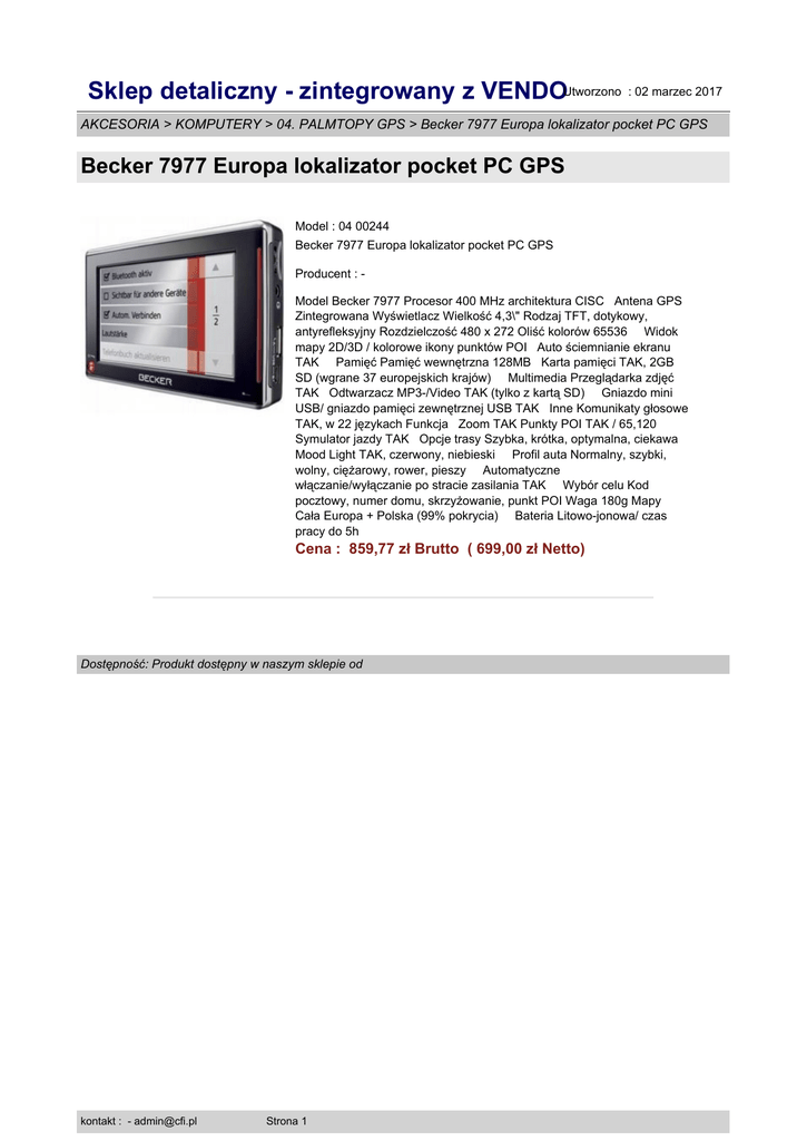 Sklep detaliczny - zintegrowany z VENDOUtworzono : 02 marzec 2017 AKCESORIA > KOMPUTERY > 04. PALMTOPY GPS > Becker 7977 Europa lokalizator pocket PC GPS Becker 7977 Europa lokalizator pocket PC GPS Model : 04 00244 Becker 7977 Europa lokalizator pocket PC GPS Producent : Model Becker 7977 Procesor 400 MHz architektura CISC Antena GPS Zintegrowana Wyświetlacz Wielkość 4,3\" Rodzaj TFT, dotykowy, antyrefleksyjny Rozdzielczość 480 x 272 Oliść kolorów 65536 Widok mapy 2D/3D / kolorowe ikony punktów POI Auto ściemnianie ekranu TAK Pamięć Pamięć wewnętrzna 128MB Karta pamięci TAK, 2GB SD (wgrane 37 europejskich krajów) Multimedia Przeglądarka zdjęć TAK Odtwarzacz MP3-/Video TAK (tylko z kartą SD) Gniazdo mini USB/ gniazdo pamięci zewnętrznej USB TAK Inne Komunikaty głosowe TAK, w 22 językach Funkcja Zoom TAK Punkty POI TAK / 65,120 Symulator jazdy TAK Opcje trasy Szybka, krótka, optymalna, ciekawa Mood Light TAK, czerwony, niebieski Profil auta Normalny, szybki, wolny, ciężarowy, rower, pieszy Automatyczne włączanie/wyłączanie po stracie zasilania TAK Wybór celu Kod pocztowy, numer domu, skrzyżowanie, punkt POI Waga 180g Mapy Cała Europa + Polska (99% pokrycia) Bateria Litowo-jonowa/ czas pracy do 5h Cena : 859,77 zł Brutto ( 699,00 zł Netto) Dostępność: Produkt dostępny w naszym sklepie od kontakt : - [email protected] Strona 1