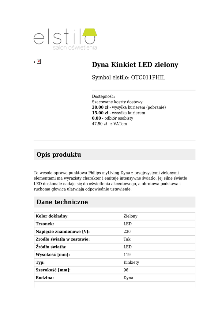 Dyna Kinkiet LED zielony ● Symbol elstilo: OTC011PHIL Dostępność: Szacowane koszty dostawy: 20.00 zł - wysyłka kurierem (pobranie) 15.00 zł - wysyłka kurierem 0.00 - odbiór osobisty 47,90 zł z VATem Opis produktu Ta wesoła oprawa punktowa Philips myLiving Dyna z przejrzystymi zielonymi elementami ma wyrazisty charakter i emituje intensywne światło. Jej silne światło LED doskonale nadaje się do oświetlenia akcentowego, a obrotowa podstawa i ruchoma głowica ułatwiają odpowiednie ustawienie. Dane techniczne Kolor dokładny: Zielony Trzonek: LED Napięcie znamionowe [V]: 230 Źródło światła w zestawie: Tak Źródło światła: LED Wysokość [mm]: 119 Typ: Kinkiety Szerokość [mm]: 96 Rodzina: Dyna Rodzaj: Wewnętrzne Moc [W]: 3 Kolor: Zielony Ilość źródeł światła: 1 Długość [mm]: 96