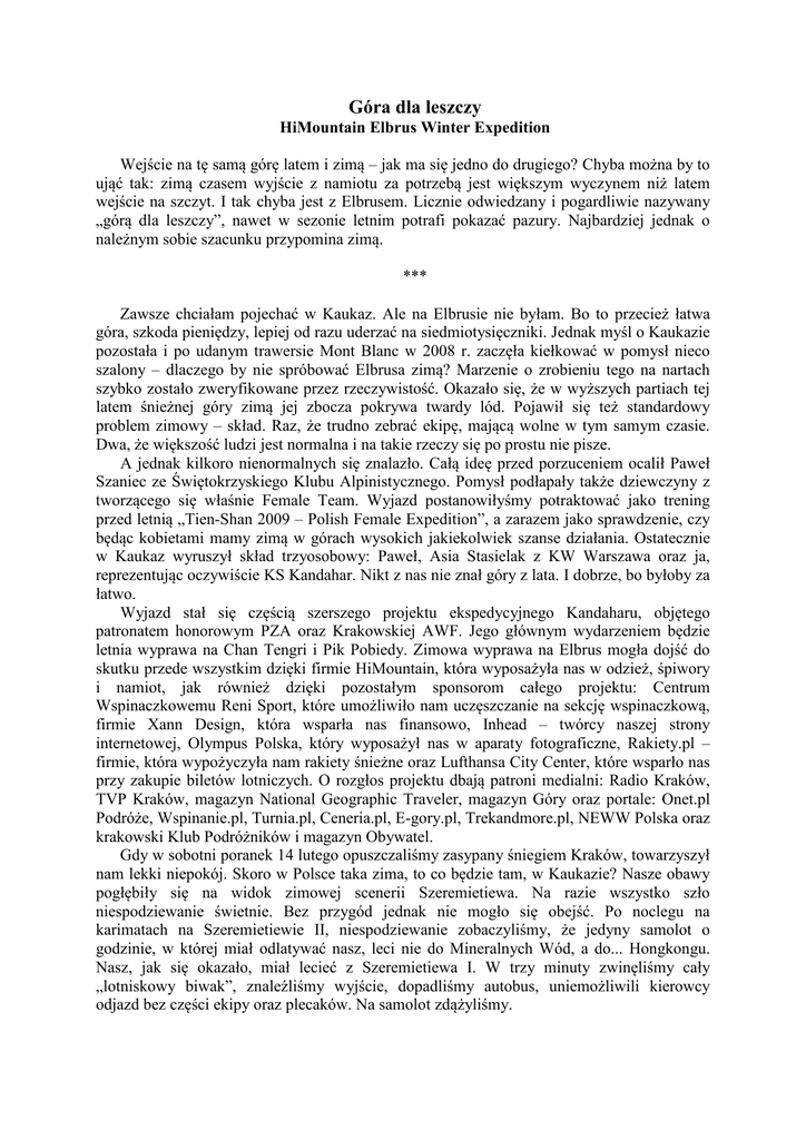 Góra dla leszczy HiMountain Elbrus Winter Expedition Wejście na tę samą górę latem i zimą – jak ma się jedno do drugiego? Chyba można by to ująć tak: zimą czasem wyjście z namiotu za potrzebą jest większym wyczynem niż latem wejście na szczyt. I tak chyba jest z Elbrusem. Licznie odwiedzany i pogardliwie nazywany „górą dla leszczy”, nawet w sezonie letnim potrafi pokazać pazury. Najbardziej jednak o należnym sobie szacunku przypomina zimą. *** Zawsze chciałam pojechać w Kaukaz. Ale na Elbrusie nie byłam. Bo to przecież łatwa góra, szkoda pieniędzy, lepiej od razu uderzać na siedmiotysięczniki. Jednak myśl o Kaukazie pozostała i po udanym trawersie Mont Blanc w 2008 r. zaczęła kiełkować w pomysł nieco szalony – dlaczego by nie spróbować Elbrusa zimą? Marzenie o zrobieniu tego na nartach szybko zostało zweryfikowane przez rzeczywistość. Okazało się, że w wyższych partiach tej latem śnieżnej góry zimą jej zbocza pokrywa twardy lód. Pojawił się też standardowy problem zimowy – skład. Raz, że trudno zebrać ekipę, mającą wolne w tym samym czasie. Dwa, że większość ludzi jest normalna i na takie rzeczy się po prostu nie pisze. A jednak kilkoro nienormalnych się znalazło. Całą ideę przed porzuceniem ocalił Paweł Szaniec ze Świętokrzyskiego Klubu Alpinistycznego. Pomysł podłapały także dziewczyny z tworzącego się właśnie Female Team. Wyjazd postanowiłyśmy potraktować jako trening przed letnią „Tien-Shan 2009 – Polish Female Expedition”, a zarazem jako sprawdzenie, czy będąc kobietami mamy zimą w górach wysokich jakiekolwiek szanse działania. Ostatecznie w Kaukaz wyruszył skład trzyosobowy: Paweł, Asia Stasielak z KW Warszawa oraz ja, reprezentując oczywiście KS Kandahar. Nikt z nas nie znał góry z lata. I dobrze, bo byłoby za łatwo. Wyjazd stał się częścią szerszego projektu ekspedycyjnego Kandaharu, objętego patronatem honorowym PZA oraz Krakowskiej AWF. Jego głównym wydarzeniem będzie letnia wyprawa na Chan Tengri i Pik Pobiedy. Zimowa wyprawa na Elbrus mogła dojść do skutku przede wszystkim dzięki firmie HiMountain, która wyposażyła nas w odzież, śpiwory i namiot, jak również dzięki pozostałym sponsorom całego projektu: Centrum Wspinaczkowemu Reni Sport, które umożliwiło nam uczęszczanie na sekcję wspinaczkową, firmie Xann Design, która wsparła nas finansowo, Inhead – twórcy naszej strony internetowej, Olympus Polska, który wyposażył nas w aparaty fotograficzne, Rakiety.pl – firmie, która wypożyczyła nam rakiety śnieżne oraz Lufthansa City Center, które wsparło nas przy zakupie biletów lotniczych. O rozgłos projektu dbają patroni medialni: Radio Kraków, TVP Kraków, magazyn National Geographic Traveler, magazyn Góry oraz portale: Onet.pl Podróże, Wspinanie.pl, Turnia.pl, Ceneria.pl, E-gory.pl, Trekandmore.pl, NEWW Polska oraz krakowski Klub Podróżników i magazyn Obywatel. Gdy w sobotni poranek 14 lutego opuszczaliśmy zasypany śniegiem Kraków, towarzyszył nam lekki niepokój. Skoro w Polsce taka zima, to co będzie tam, w Kaukazie? Nasze obawy pogłębiły się na widok zimowej scenerii Szeremietiewa. Na razie wszystko szło niespodziewanie świetnie. Bez przygód jednak nie mogło się obejść. Po noclegu na karimatach na Szeremietiewie II, niespodziewanie zobaczyliśmy, że jedyny samolot o godzinie, w której miał odlatywać nasz, leci nie do Mineralnych Wód, a do... Hongkongu. Nasz, jak się okazało, miał lecieć z Szeremietiewa I. W trzy minuty zwinęliśmy cały „lotniskowy biwak”, znaleźliśmy wyjście, dopadliśmy autobus, uniemożliwili kierowcy odjazd bez części ekipy oraz plecaków. Na samolot zdążyliśmy. W Mineralnych Wodach zaskoczyła nas... wiosna. Podobnie wiosenny krajobraz roztaczał się wokół nas podczas całej podróży busikiem z szalonym panem kierowcą do Azau u stóp Elbrusa. Ceny noclegów są tu dostosowane do zamożnej moskiewskiej klienteli, przyjeżdżającej na narty. Rozbiliśmy więc namiot niedaleko dolnej stacji kolejki. Była niedziela wieczór. W poniedziałek obudziliśmy się podduszeni. Na 2200 m n.p.m - co jest? Okazało się, że w nocy zima wróciła w Kaukaz. Byliśmy zasypani po dach. „Wyprawa” do położonego kilka kilometrów niżej Terskola w celu zakupu gazu i jedzenia oraz zarejestrowania się u ratowników, okazała się nie lada przedsięwzięciem. Na szczęście maldunek OVIR za niedużą opłatą zdeklarowała się zorganizować pani z kiosku w Azau. We wtorek w góry nie wyszliśmy. Załamanie pogody trwało nadal. Chcąc umyć zęby zaproponowaliśmy panu, odśnieżającemu parking przed hotelem Alpina - jak się miało okazać kierownikowi tegoż hotelu – biznes. Odśnieżymy parking w zamian za możliwość skorzystania z dobra cywilizacji, jakim jest łazienka. Skończyło się na... spaniu, jedzeniu, prysznicu, możliwości zostawienia depozytu. Za darmo! Trochę się stresowaliśmy, zwłaszcza damska część wyprawy. Okazało się jednak, że to po prostu gościnność, jaką nakazuje kultura zamieszkujących te tereny Bałkarów. Na szczęście od imprezy się wykręciliśmy, bo inaczej kolejnego dnia też byśmy w góry nie wyszli. W środę wreszcie przywitała nas piękna pogoda. Dylemat, czy w imię czystości stylu iść nartostradami wzdłuż kolejki, czy może chcąc zmieścić się w oknie pogodowym skorzystać z niej, rozwiązał się sam. Dolna kolejka nie działała. Kolejny odcinek działał, jednak pogardziliśmy luksusem. Moskiewscy narciarze, dla których byliśmy atrakcją turystyczną, nie mogli zrozumieć, dlaczego idziemy pieszo niosąc po 30 kg. Tego dnia dotarliśmy w okolicę stacji Mir (3500 m n.p.m.) i tam spaliśmy w namiocie. Znów zimno, szron w namiocie, mokre śpiwory – czyli po hotelowych luksusach wszystko wraca do normy. Kolejny dzień to podejście do położonego na 4100 m n.p.m. obok ruin Prijuta 11