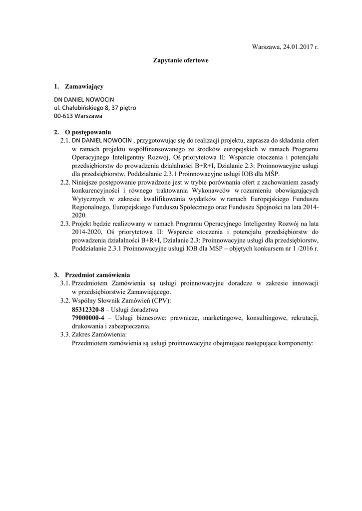 Warszawa, 24.01.2017 r. Zapytanie ofertowe 1. Zamawiający DN DANIEL NOWOCIN ul. Chałubińskiego 8, 37 piętro 00-613 Warszawa 2. O postępowaniu 2.1. DN DANIEL NOWOCIN , przygotowując się do realizacji projektu, zaprasza do składania ofert w ramach projektu współfinansowanego ze środków europejskich w ramach Programu Operacyjnego Inteligentny Rozwój, Oś priorytetowa II: Wsparcie otoczenia i potencjału przedsiębiorstw do prowadzenia działalności B+R+I, Działanie 2.3: Proinnowacyjne usługi dla przedsiębiorstw, Poddziałanie 2.3.1 Proinnowacyjne usługi IOB dla MŚP. 2.2. Niniejsze postępowanie prowadzone jest w trybie porównania ofert z zachowaniem zasady konkurencyjności i równego traktowania Wykonawców w rozumieniu obowiązujących Wytycznych w zakresie kwalifikowania wydatków w ramach Europejskiego Funduszu Regionalnego, Europejskiego Funduszu Społecznego oraz Funduszu Spójności na lata 20142020. 2.3. Projekt będzie realizowany w ramach Programu Operacyjnego Inteligentny Rozwój na lata 2014-2020, Oś priorytetowa II: Wsparcie otoczenia i potencjału przedsiębiorstw do prowadzenia działalności B+R+I, Działanie 2.3: Proinnowacyjne usługi dla przedsiębiorstw, Poddziałanie 2.3.1 Proinnowacyjne usługi IOB dla MŚP – objętych konkursem nr 1 /2016 r. 3. Przedmiot zamówienia 3.1. Przedmiotem Zamówienia są usługi proinnowacyjne doradcze w zakresie innowacji w przedsiębiorstwie Zamawiającego. 3.2. Wspólny Słownik Zamówień (CPV): 85312320-8 – Usługi doradztwa 79000000-4 – Usługi biznesowe: prawnicze, marketingowe, konsultingowe, rekrutacji, drukowania i zabezpieczania. 3.3. Zakres Zamówienia: Przedmiotem zamówienia są usługi proinnowacyjne obejmujące następujące komponenty: Nazwa zadania Usługi doradcze w zakresie innowacji doradztwo, pomoc i szkolenia w zakresie transferu wiedzy Opis zadania Kategoria Opracowanie strategii marketingowej dla wyrobu lub usługi będącej przedmiotem wdrożenia innowacji Nazwa Zadania Analiza rynku informatycznych systemów medycznych Analiza rynku konkurencyjnych systemów klasy CRM dla placówek medycznych Kompleksowe zdefiniowanie i segmentacja grup odbiorców produktu w poszczególnych rejonach kraju Opracowanie strategii komercjalizacji rozwiązania Pomoc w opracowaniu dokumentacji funkcjonalnej lub technicznej niezbędnej do wdrożenia innowacji Utworzenie dokumentacji funkcjonalnej systemu Analiza możliwości integracji produktu z systemami informatycznymi do zarządzania placówkami medycznymi Dobór technologii do wytworzenia rozwiązania Określenie wymagań infrastruktury informatycznej dla produktu Pozostałe uzasadnione doradztwo niezbędne do wdrożenia innowacji Analiza regulacji prawnych i wymogów standardów bezpieczeństwa w kontekście funkcjonalności systemu Opracowanie kompleksowego budżetu realizacji projektu Harmonogramowanie realizacji projektu Przygotowanie szczegółowego modelu finansowego dla opracowywanej lub wdrażanej innowacji Przeprowadzenie analizy opłacalności projektu Analiza alternatywnych ścieżek rozwoju poprzez wdrażanie innowacji Wariantowanie inwestycji, określenie wpływu realizacji projektu na sytuacje finansową, oszacowanie przepływów pieniężnych i zyskowności inwestycji Doradztwo, pomoc i szkolenie w pełnym wdrożeniu innowacji Asysta we wdrożeniu rozwiązania - wsparcie w zarządzaniu projektem, wsparcie w opracowaniu dokumentacji projektowej Asysta we wdrożeniu rozwiązania - wsparcie w zakresie projektowania interfejsów systemu w kontekście projektowania zorientowanego na użytkownika Monitorowanie i ocean efektów wdrożenia innowacji Asysta we wdrożeniu rozwiązania - nadzór nad pracami wytwórczymi systemu Szacowany termin realizacji 31.10.2018 Wymagane rezultaty 1. Raport zawierający podsumowanie wyników realizacji usługi doradczej. 4. Termin realizacji 4.1. Termin realizacji zamówienia – ostateczny termin realizacji przedmiotu zamówienia określa się na 31.10.2018 r. 4.2. Po zakończeniu postępowania ofertowego, Zamawiający zawrze z wyłonionym Wykonawcą Zamówienia umowę warunkową na realizację usług proinnowacyjnych. Po podpisaniu przez Zamawiającego umowy o dofinansowanie z Instytucją Pośredniczącą umowa warunkowa z Wykonawcą stanie się umową właściwą. 5. Warunki dopuszczające udział w postępowaniu oraz opis sposobu dokonywania oceny spełniania tych warunków 5.1. O udzielenie zamówienia mogą ubiegać się Wykonawcy, którzy spełniają następujące warunki: 5.1.1. Akredytacja Ministerstwa Rozwoju ośrodków innowacji świadczących usługi proinnowacyjne: Warunek ten zostanie spełniony, jeżeli Wykonawca przedstawi dokumenty potwierdzające akredytację IOB albo zgłoszenie do akredytacji IOB (potwierdzenie wpływu do Ministerstwa Rozwoju). Usługa może być świadczona przez IOB, które zostaną akredytowane przed podpisaniem umowy o dofinansowanie projektu. Zgłoszenie IOB do akredytacji musi nastąpić nie później niż w dniu potwierdzenia złożenia Wniosku o dofinansowanie, zgodnie z regulaminem konkursu Działanie 2.3.1 POIR dostępnym na stronie http://poir.parp.gov.pl/. Opis sposobu dokonywania oceny spełniania tego warunku: Zamawiający dokona oceny spełniania przez Wykonawcę wyżej wskazanego warunku udziału w postępowaniu według formuły „spełnia/nie spełnia” na podstawie analizy złożonych przez Wykonawcę dokumentów. 5.1.2. Powiązania kapitałowe lub osobowe: Zamawiający wyklucza możliwość złożenia oferty przez podmioty o których mowa w art. 6c ust. 2 ustawy z dnia 9 listopada 2000 r. o utworzeniu Polskiej Agencji Rozwoju Przedsiębiorczości (Dz.U. z 2007 r. Nr 42, poz. 275 z późn. zm.) tj. powiązane z Zamawiającym osobowo lub kapitałowo. Opis sposobu dokonywania oceny spełniania tego warunku: Zamawiający dokona oceny spełniania przez Wykonawcę wyżej wskazanego warunku udziału w postępowaniu według formuły „spełnia/nie spełnia” na po
