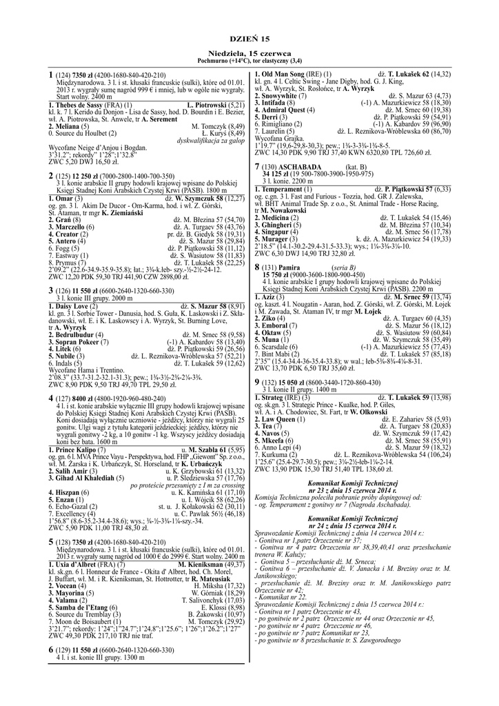 DZIEŃ 15 Niedziela, 15 czerwca Pochmurno (+14°C), tor elastyczny (3,4) 1 (124) 7350 zł (4200-1680-840-420-210) Międzynarodowa. 3 l. i st. kłusaki francuskie (sulki), które od 01.01. 2013 r. wygrały sumę nagród 999 € i mniej, lub w ogóle nie wygrały. Start wolny. 2400 m 1. Thebes de Sassy (FRA) (1) L. Piotrowski (5,21) kl. k. 7 l. Kerido du Donjon - Lisa de Sassy, hod. D. Bourdin i E. Bezier, wł. A. Piotrowska, St. Anwele, tr A. Serement 2. Meliana (5) M. Tomczyk (8,49) 0. Source du Houlbet (2) Ł. Kuryś (8,49) dyskwalifikacja za galop Wycofane Neige d’Anjou i Bogdan. 3’31.2”; rekordy” 1’28”;1’32.8” ZWC 5,20 DWJ 16,50 zł. 2 (125) 12 250 zł (7000-2800-1400-700-350) 3 l. konie arabskie II grupy hodowli krajowej wpisane do Polskiej Księgi Stadnej Koni Arabskich Czystej Krwi (PASB). 1800 m 1. Omar (3) dż. W. Szymczuk 58 (12,27) og. gn. 3 l. Akim De Ducor - Om-Karma, hod. i wł. Z. Górski, St. Ataman, tr mgr K. Ziemiański 2. Grań (8) dż. M. Březina 57 (54,70) 3. Marczello (6) dż. A. Turgaev 58 (43,76) 4. Creator (2) pr. dż. B. Giedyk 58 (19,31) 5. Antero (4) dż. S. Mazur 58 (29,84) 6. Fogg (5) dż. P. Piątkowski 58 (11,12) 7. Eastway (1) dż. S. Wasiutow 58 (11,83) 8. Prymus (7) dż. T. Lukašek 58 (22,25) 2’09.2” (22.6-34.9-35.9-35.8); łat.; 3¾-k.łeb- szy.-½-2½-24-12. ZWC 12,20 PDK 59,30 TRJ 441,90 CZW 2898,00 zł. 3 (126) 11 550 zł (6600-2640-1320-660-330) 3 l. konie III grupy. 2000 m 1. Daisy Love (2) dż. S. Mazur 58 (8,91) kl. gn. 3 l. Sorbie Tower - Danusia, hod. S. Guła, K. Laskowski i Z. Składanowski, wł. E. i K. Laskowscy i A. Wyrzyk, St. Burning Love, tr A. Wyrzyk 2. Bedrulbudur (4) dż. M. Srnec 58 (9,58) 3. Sopran Pokeer (7) (-1) A. Kabardov 58 (13,40) 4. Litek (6) dż. P. Piątkowski 59 (26,56) 5. Nubile (3) dż. L. Reznikova-Wróblewska 57 (52,21) 6. Indals (5) dż. T. Lukašek 59 (12,62) Wycofane Hama i Trentino. 2’08.3” (33.7-31.2-32.1-31.3); pew.; 1¾-3½-2¾-2¼-3¾. ZWC 8,90 PDK 9,50 TRJ 49,70 TPL 29,50 zł. 4 (127) 8400 zł (4800-1920-960-480-240) 4 l. i st. konie arabskie wyłącznie III grupy hodowli krajowej wpisane do Polskiej Księgi Stadnej Koni Arabskich Czystej Krwi (PASB). Koni dosiadają wyłącznie uczniowie - jeźdźcy, którzy nie wygrali 25 gonitw. Ulgi wagi z tytułu kategorii jeździeckiej: jeźdźcy, którzy nie wygrali gonitwy -2 kg, a 10 gonitw -1 kg. Wszyscy jeźdźcy dosiadają koni bez bata. 1600 m 1. Prince Kalipo (7) u. M. Szabla 61 (5,95) og. gn. 6 l. MVA Prince Vayu - Perspektywa, hod. FHP „Giewont” Sp. z o.o., wł. M. Żarska i K. Urbańczyk, St. Horseland, tr K. Urbańczyk 2. Salih Amir (3) u. K. Grzybowski 61 (13,32) 3. Gihad Al Khalediah (5) u. P. Śledziewska 57 (17,76) po proteście przesunięty z I m za crossing 4. Hiszpan (6) u. K. Kamińska 61 (17,10) 5. Enzan (1) u. I. Wójcik 58 (62,26) 6. Echo-Gazal (2) st. u. J. Kołakowski 62 (30,11) 7. Excellency (4) u. C. Pawlak 56½ (46,18) 1’56.8” (8.6-35.2-34.4-38.6); wys.; ¾-½-3¾-1¼-szy.-34. ZWC 5,90 PDK 11,00 TRJ 48,30 zł. 5 (128) 7350 zł (4200-1680-840-420-210) Międzynarodowa. 3 l. i st. kłusaki francuskie (sulki), które od 01.01. 2013 r. wygrały sumę nagród od 1000 € do 2999 €. Start wolny. 2400 m 1. Uxia d’Albret (FRA) (7) M. Kieniksman (49,37) kl. sk.gn. 6 l. Honneur de France - Okita d' Albret, hod. Ch. Morel, J. Buffart, wł. M. i R. Kieniksman, St. Hottrotter, tr R. Mateusiak 2. Vocean (4) H. Miksha (17,32) 3. Mayorina (5) W. Górniak (18,29) 4. Valama (2) T. Salivonchyk (17,03) 5. Samba de l’Etang (6) E. Klossi (8,98) 6. Source du Tremblay (3) B. Żakowski (10,97) 7. Moon de Boisaubert (1) M. Tomczyk (29,92) 3’21.7”; rekordy: 1’24”;1”24.7”;1’24.8”;1’25.6”; 1’26”;1’26.2”;1’27” ZWC 49,30 PDK 217,10 TRJ nie traf. 6 (129) 11 550 zł (6600-2640-1320-660-330) 4 l. i st. konie III grupy. 1300 m 1. Old Man Song (IRE) (1) dż. T. Lukašek 62 (14,32) kl. gn. 4 l. Celtic Swing - Jane Digby, hod. G. J. King, wł. A. Wyrzyk, St. Rosłońce, tr A. Wyrzyk 2. Snowywhite (7) dż. S. Mazur 63 (4,73) 3. Intifada (8) (-1) A. Mazurkiewicz 58 (18,30) 4. Admiral Quest (4) dż. M. Srnec 60 (19,38) 5. Derri (3) dż. P. Piątkowski 59 (54,91) 6. Rimigliano (2) (-1) A. Kabardov 59 (96,90) 7. Laurelin (5) dż. L. Reznikova-Wróblewska 60 (86,70) Wycofana Grajka. 1’19.7” (19,6-29,8-30,3); pew.; 1¾-3-3¾-1¾-8-5. ZWC 14,30 PDK 9,90 TRJ 37,40 KWN 6320,80 TPL 726,60 zł. 7 (130) ASCHABADA (kat. B) 34 125 zł (19 500-7800-3900-1950-975) 3 l. konie. 2200 m 1. Temperament (1) dż. P. Piątkowski 57 (6,33) og. c.gn. 3 l. Fast and Furious - Tozzia, hod. GR J. Zalewska, wł. BHT Animal Trade Sp. z o.o., St. Animal Trade - Horse Racing, tr M. Nowakowski 2. Medicina (2) dż. T. Lukašek 54 (15,46) 3. Ghingheri (5) dż. M. Březina 57 (10,34) 4. Singapur (4) dż. M. Srnec 56 (17,78) 5. Murager (3) k. dż. A. Mazurkiewicz 54 (19,33) 2’18.5” (14.1-30.2-29.4-31.5-33.3); wys.; 1¼-3¾-3¼-10. ZWC 6,30 DWJ 14,90 TRJ 32,80 zł. 8 (131) Pamira (seria B) 15 750 zł (9000-3600-1800-900-450) 4 l. konie arabskie I grupy hodowli krajowej wpisane do Polskiej Księgi Stadnej Koni Arabskich Czystej Krwi (PASB). 2200 m 1. Aziz (3) dż. M. Srnec 59 (13,74) og. kaszt. 4 l. Nougatin - Aaran, hod. Z. Górski, wł. Z. Górski, M. Łojek i M. Zawada, St. Ataman IV, tr mgr M. Łojek 2. Ziko (4) dż. A. Turgaev 60 (4,35) 3. Emboral (7) dż. S. Mazur 56 (18,12) 4. Oktaw (5) dż. S. Wasiutow 59 (60,84) 5. Muna (1) dż. W. Szymczuk 58 (35,49) 6. Scarsdale (6) (-1) A. Mazurkiewicz 55 (77,43) 7. Bint Mabi (2) dż. T. Lukašek 57 (85,18) 2’35” (15.4-34.4-36-35.4-33.8); w wal.; łeb-5¾-8¾-4¼-8-31. ZWC 13,70 PDK 6,50 TRJ 35,60 zł. 9 (132) 15 050 zł (8600-3440-1720-860-430) 3 l. konie II grupy. 1400 m 1. Strateg (IRE) (3) dż. T. Lukašek 59 (13,98) og. sk.gn. 3 l. Strategic Prince - Kualke, hod. P. Giles, wł. A. i A. Chodowiec, St. Fart, tr W. Olkowski 2. Law Queen (1) dż. E. Zahariev 58 (5,93) 3. Tea (7) dż. A. Turgae