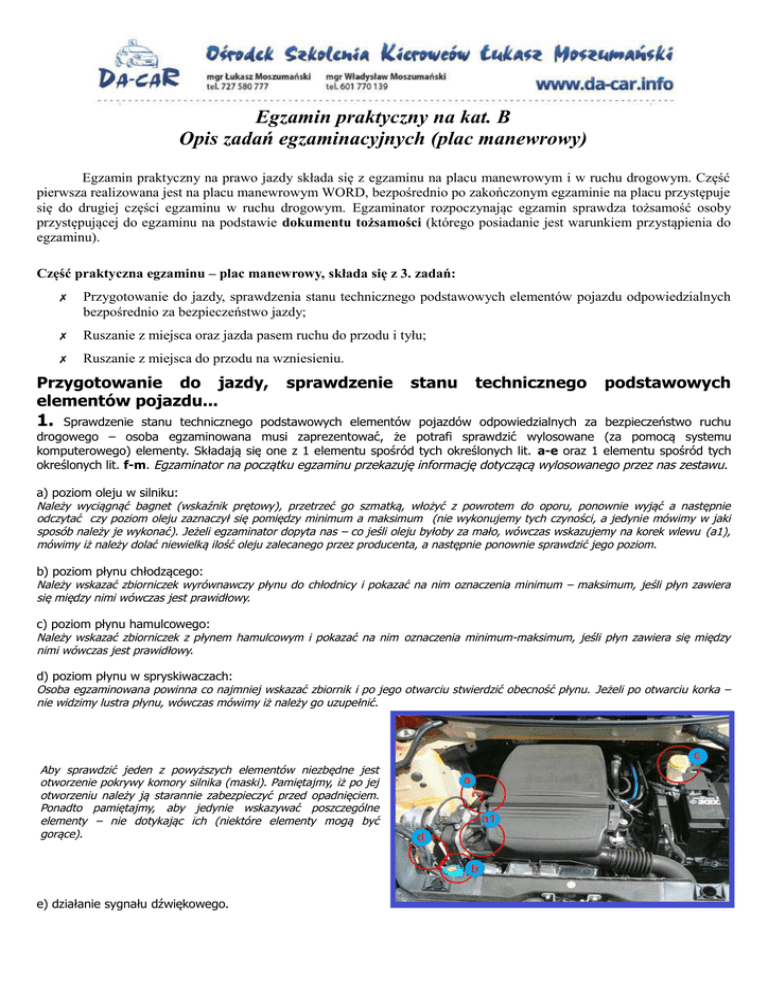 Egzamin praktyczny na kat. B Opis zadań egzaminacyjnych (plac manewrowy) Egzamin praktyczny na prawo jazdy składa się z egzaminu na placu manewrowym i w ruchu drogowym. Część pierwsza realizowana jest na placu manewrowym WORD, bezpośrednio po zakończonym egzaminie na placu przystępuje się do drugiej części egzaminu w ruchu drogowym. Egzaminator rozpoczynając egzamin sprawdza tożsamość osoby przystępującej do egzaminu na podstawie dokumentu tożsamości (którego posiadanie jest warunkiem przystąpienia do egzaminu). Część praktyczna egzaminu – plac manewrowy, składa się z 3. zadań: ✗ Przygotowanie do jazdy, sprawdzenia stanu technicznego podstawowych elementów pojazdu odpowiedzialnych bezpośrednio za bezpieczeństwo jazdy; ✗ Ruszanie z miejsca oraz jazda pasem ruchu do przodu i tyłu; ✗ Ruszanie z miejsca do przodu na wzniesieniu. Przygotowanie do jazdy, elementów pojazdu... sprawdzenie stanu technicznego podstawowych 1. Sprawdzenie stanu technicznego podstawowych elementów pojazdów odpowiedzialnych za bezpieczeństwo ruchu drogowego – osoba egzaminowana musi zaprezentować, że potrafi sprawdzić wylosowane (za pomocą systemu komputerowego) elementy. Składają się one z 1 elementu spośród tych określonych lit. a-e oraz 1 elementu spośród tych określonych lit. f-m. Egzaminator na początku egzaminu przekazuję informację dotyczącą wylosowanego przez nas zestawu. a) poziom oleju w silniku: Należy wyciągnąć bagnet (wskaźnik prętowy), przetrzeć go szmatką, włożyć z powrotem do oporu, ponownie wyjąć a następnie odczytać czy poziom oleju zaznaczył się pomiędzy minimum a maksimum (nie wykonujemy tych czyności, a jedynie mówimy w jaki sposób należy je wykonać). Jeżeli egzaminator dopyta nas – co jeśli oleju byłoby za mało, wówczas wskazujemy na korek wlewu (a1), mówimy iż należy dolać niewielką ilość oleju zalecanego przez producenta, a następnie ponownie sprawdzić jego poziom. b) poziom płynu chłodzącego: Należy wskazać zbiorniczek wyrównawczy płynu do chłodnicy i pokazać na nim oznaczenia minimum – maksimum, jeśli płyn zawiera się między nimi wówczas jest prawidłowy. c) poziom płynu hamulcowego: Należy wskazać zbiorniczek z płynem hamulcowym i pokazać na nim oznaczenia minimum-maksimum, jeśli płyn zawiera się między nimi wówczas jest prawidłowy. d) poziom płynu w spryskiwaczach: Osoba egzaminowana powinna co najmniej wskazać zbiornik i po jego otwarciu stwierdzić obecność płynu. Jeżeli po otwarciu korka – nie widzimy lustra płynu, wówczas mówimy iż należy go uzupełnić. Aby sprawdzić jeden z powyższych elementów niezbędne jest otworzenie pokrywy komory silnika (maski). Pamiętajmy, iż po jej otworzeniu należy ją starannie zabezpieczyć przed opadnięciem. Ponadto pamiętajmy, aby jedynie wskazywać poszczególne elementy – nie dotykając ich (niektóre elementy mogą być gorące). e) działanie sygnału dźwiękowego. Po sprawdzeniu jednego z powyższych, przechodzimy do sprawdzenia 2. wylosowanego elementu – czyli świateł, należy je włączyć, a następnie wyjść samochodu i sprawdzić ich działanie – wskazując ręką które światło sprawdzamy (poniższy opis dotyczy samochodu FIAT PANDA): f) działanie świateł pozycyjnych/postojowych – pokrętło na lewej manetce przekręcamy o jeden stopień, dwa białe z przodu, dwa czerwone z tyłu (działają również bez zapłonu); g) działanie świateł mijania – zapłon + pokrętło na lewej manetce przekręcamy o dwa stopnie, dwa białe z przodu (tylko z przodu); h) działanie świateł drogowych – zapłon + światła mijania, a następnie lewą manetkę "popychamy do przodu", dwa białe z przodu – te same co ww. tylko mocniejszy strumień światła; i) działanie świateł hamowania „STOP" – prosimy egzaminatora o pomoc w sprawdzeniu ich działania, następnie zapłon + wciskamy pedał hamulca, czekając aż egzaminator zweryfikuje ich działanie. Trzy czerwone lampy z tyłu, dwie po bokach i jedna zamontowana w tylnej szybie; j) działanie świateł cofania - zapłon + włączamy bieg wsteczny, jedna biała lampa z tyłu, po prawej stronie; k) działanie świateł kierunkowskazów - zapłon + lewa manetka w dół (lewy k.), po czym w góre (prawy k.) trzy migające lampki: z przodu, z boku i z tyłu; l) działanie świateł awaryjnych – czerwony przycisk na centralnej konsoli, 6 lampek migających: 2 z przodu, 2 z boku i 2 z tyłu (działają również bez zapłonu); m) działanie świateł przeciwmgłowych tylnych – zapłon + światła mijania + przycisk na centralnej konsoli, jedno mocne czerwone światło, po lewej stronie (pamiętaj, iż aby światła przeciwmgielne zadziałały, najpierw musimy włączyć światła mijania). Po wyłączaniu świateł, które sprawdzaliśmy, należy obejść samochód i sprawdzić czy wszystkie drzwi oraz pokrywa komory silnika są domknięte. Następnie wsiadamy do samochodu i przygotowywujemy się do jazdy, czyli sprawdzamy: Właściwe ustawienie fotela, lusterek i zapięcie pasów bezpieczeństwa (FliP). W momencie zapięcia pasów – kończymy wykonywanie zadania nr 1 :) Jazda pasem ruchu do przodu i do tyłu - jazda po łuku 2. Przed ruszeniem należy włączyć światła mijania oraz wykluczyć prawdopodobieństwo spowodowania zagrożenia w ruchu drogowym – należy popatrzyć się w lewo, w prawo oraz do tyłu !!!!!!!! Nie sprawdzenie sytuacji wokół pojazdu przed ruszeniem skutkuje negatywnym wynikiem wykonania zadania. Następnie należy opuścić dźwignię hamulca awaryjnego (ręcznego), delikatnie zwiększyć obroty silnika, a następnie łagodnie puszczać sprzęgło. Nie warto się spieszyć – wsiadamy do samochodu w którym nigdy wcześniej nie jechaliśmy. Po wykonaniu płynnego ruszenia jedziemy pasem ruchu do przodu i tyłu (jazda musi być płynna, tzn możemy jechać bardzo powoli, jednak koła nie mogą się zat