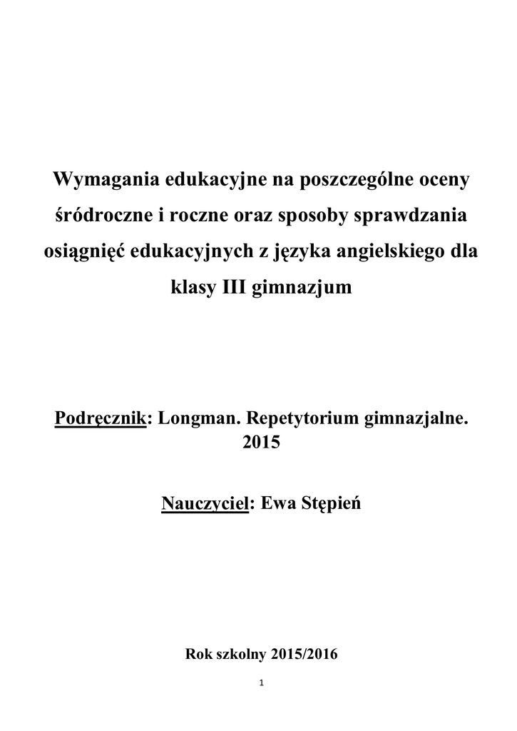 Wymagania edukacyjne na poszczególne oceny śródroczne i roczne oraz sposoby sprawdzania osiągnięć edukacyjnych z języka angielskiego dla klasy III gimnazjum Podręcznik: Longman. Repetytorium gimnazjalne. 2015 Nauczyciel: Ewa Stępień Rok szkolny 2015/2016 1 Ocena celująca Uczeń spełnia wymagania na ocenę bardzo dobrą, a ponadto posiada wiedzę i umiejętności znacznie wykraczające poza program nauczania, bierze udział w konkursach przedmiotowych i osiąga w nich sukcesy Ocena bardzo dobra: · Zna i stosuje wszystkie poznane wyrazy oraz zwroty z następujących tematów: - - · części ciała dane osobowe wygląd zewnętrzny ubrania cechy charakteru uczucia i emocje części domu meble i wyposażenie położenie życie na wsi i w mieście rodzaje domów przedmioty szkolne typy szkół miejsca w szkole przybory szkolne pracownicy szkoły i uczniowie oceny i egzaminy życie szkolne zawody miejsca pracy praca i pieniądze ludzie w pracy aspekty w pracy poszukiwanie pracy, brak pracy rodzina etapy życia czynności codzienne czas wolny - - małżeństwo i związki święta i uroczystości żywność i napoje ilość i opakowania przy stole posiłki przygotowanie potraw w restauracji rodzaje sklepów w sklepie towary kupowanie ubrań pieniądze składanie reklamacji usługi reklama środki transportu i miejsca podróżowanie zakwaterowanie ekwipunek wakacje wskazywanie drogi muzyka literatura sztuki plastyczne teatr film środki masowego przekazu dyscypliny sportu - - sporty ekstremalne sprzęt sportowy ludzie w sporcie miejsce współzawodnictwo kontuzje, choroby i objawy narządy wewnętrzne służba zdrowia leczenie zdrowy tryb życia uzależnienia technika komputery dziedziny nauki i naukowcy nauki ścisłe i przyrodnicze praca naukowca krajobraz kierunki świata pory roku pogoda zwierzęta części ciała zwierząt rośliny klęski żywiołowe zagrożenia i ochrona środowiska Poprawnie stosuje poznane struktury gramatyczne w zadaniach językowych i własnych wypowiedziach. - - czas Present Simple czas Present Continuous liczba mnoga rzeczowników konstrukcja there is/are przyimki określające położenie zakończenia przymiotników, przymiotniki złożone czasowniki modalne going to, will 2 tworzenie przymiotników o znaczeniu negatywnym formy czasownikowe z bezokolicznikiem i formą gerund czas Present Perfect tworzenie nazw zawodów zaimki zwrotne i wzajemne czas Past Simple tworzenie form czasu przeszłego rzeczowniki policzalne i niepoliczalne - · · - określniki ilości zdania z dwoma dopełnieniami zaimki one/ones, other, another zaimki wskazujące, osobowe i dzierżawcze czas Past Continuous formy odczasownikowe z końcówką –ing zaimki zaczynające się od –some, -any, no, -every zdania przydawkowe i zdania okolicznikowe celu czas Past Perfect liczebniki główne tworzenie liczebników porządkowych - zdania warunkowe tryb rozkazujący tworzenie przymiotników pytania pośrednie strona bierna tworzenie rzeczowników odprzymiotnikowych i odczasownikowych przedimki stopniowanie przymiotników tworzenie przymiotników odrzeczownikowych mowa zależna Rozumie szczegółowo teksty i komunikaty słowne w zakresie omawianych tematów. Poprawnie rozwiązuje zadania na czytanie i słuchanie: prawda/fałsz, dobieranie, wielokrotny wybór. używa szerokiego zakresu słownictwa i struktur, aby: - podać swoje dane osobowe - w uporządkowany sposób opisać osobę: wygląd zewnętrzny, osobowość i charakter - wypowiedzieć się na temat ubioru i wyglądu - opisać swoje uczucia i uczucia innych - wyrazić opinię na temat charakterystyki swojego znaku zodiaku - szczegółowo opisać emocje osób przedstawionych na ilustracjach - w uporządkowany sposób opisać pokój, dom/mieszkanie, szczegółowo określając położenie przedmiotów i mebli - szczegółowo opisać swój dom i okolicę, ulubione pomieszczenia w domu, swój pokój, opowiedzieć o sąsiadach, udzielić wyczerpujących odpowiedzi na pytania dodatkowe - wypowiedzieć się na temat współdzielenia pokoju lub mieszkania - opisać swój wymarzony pokój, odpowiadając na pytania dodatkowe - szczegółowo opowiedzieć o ulubionych przedmiotach, zwyczajach panujących w szkole, odrabianiu lekcji, spóźnianiu się i nieobecnościach - opisać swój pierwszy dzień w szkole, odpowiadając na pytania dodatkowe - opowiedzieć o swoich mocnych i słabych stronach, ulubionych zawodach i wymarzonej pracy - wybiera ofertę pracy i wyczerpująco uzasadnia swój wybór, podaje przyczyny odrzucenia pozostałych opcji - szczegółowo opisać swoje obowiązki domowe i obowiązki innych domowników - szczegółowo opisać swoje hobby i zainteresowania i udzielić wyczerpujących odpowiedzi na pytania - wyrazić i uzasadnić opinię na temat zdrowego i niezdrowego odżywiania się - szczegółowo opisać potrawy i produkty przedstawione na fotografii, wyrazić opinię na ich temat i opisać swoje ulubione jedzenie oraz udzielić wyczerpujących odpowiedzi na towarzyszące im pytania - opowiedzieć o swoich ulubionych sklepach i centrum handlowym, które chciałby zwiedzić oraz o najgorszym doświadczeniu dotyczącym zakupów - wyrazić i uzasadnić opinię na temat reklam 3 - - · · · · · · · · · · · opisać szczegółowo swoje zwyczaje związane z zakupami opowiedzieć o ulubionym sposobie podróżowania i opisać wymarzone wakacje opowiedzieć o swoich ostatnich wakacjach oraz o różnych problemach w trakcie podróży opowiedzieć o ulubionym sposobie podróżowania opowiedzieć o ulubionych książkach, czasopismach, rodzajach muzyki oraz fikcyjnych postaciach z książki/filmu szczegółowo opisać cechy wybranych programów telewizyjnych opowiedzieć o ulubionych dyscyplinach sportowych, sportach, które uprawia, chciałby uprawiać i lubi oglądać, zawodach, w których brał udział oraz sprzęcie sportowym, który chciałby dostać wypowiedzieć się na temat pracy w służbie zdrowia opowiedzieć o
