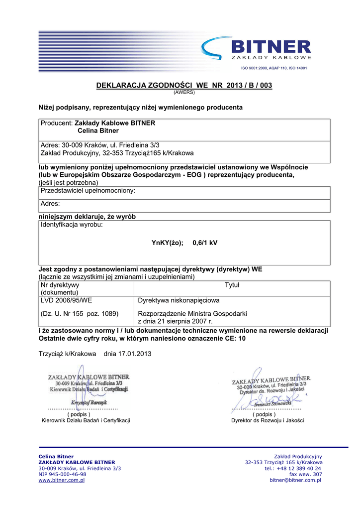 DEKLARACJA ZGODNOŚCI WE NR 2013 / B / 003 (AWERS) Niżej podpisany, reprezentujący niżej wymienionego producenta Producent: Zakłady Kablowe BITNER Celina Bitner Adres: 30-009 Kraków, ul. Friedleina 3/3 Zakład Produkcyjny, 32-353 Trzyciąż165 k/Krakowa lub wymieniony poniżej upełnomocniony przedstawiciel ustanowiony we Wspólnocie (lub w Europejskim Obszarze Gospodarczym - EOG ) reprezentujący producenta, (jeśli jest potrzebna) Przedstawiciel upełnomocniony: Adres: niniejszym deklaruje, że wyrób Identyfikacja wyrobu: YnKY(żo); 0,6/1 kV Jest zgodny z postanowieniami następującej dyrektywy (dyrektyw) WE (łącznie ze wszystkimi jej zmianami i uzupełnieniami) Nr dyrektywy Tytuł (dokumentu) LVD 2006/95/WE Dyrektywa niskonapięciowa (Dz. U. Nr 155 poz. 1089) Rozporządzenie Ministra Gospodarki z dnia 21 sierpnia 2007 r. i że zastosowano normy i / lub dokumentacje techniczne wymienione na rewersie deklaracji Ostatnie dwie cyfry roku, w którym naniesiono oznaczenie CE: 10 Trzyciąż k/Krakowa dnia 17.01.2013 ...................................... ( podpis ) Kierownik Działu Badań i Certyfikacji Celina Bitner ZAKŁADY KABLOWE BITNER 30-009 Kraków, ul. Friedleina 3/3 NIP 945-000-46-98 www.bitner.com.pl ...................................... ( podpis ) Dyrektor ds Rozwoju i Jakości Zakład Produkcyjny 32-353 Trzyciąż 165 k/Krakowa tel.: +48 12 389 40 24 fax wew. 307 [email protected] DEKLARACJA ZGODNOŚCI WE NR 2013 / B / 003 (REWERS) Normy i / lub dokumentacje techniczne lub ich części zastosowane do wyrobu, którego dotyczy niniejsza deklaracja: - normy zharmonizowane: Numer Wydanie Tytuł PN-HD 603 S1:2006 Kable elektroenergetyczne na napięcie znamionowe 0,6/1 kV. PN-HD 605 S2:2008 Kable elektroenergetyczne - Dodatkowe metody badania (oryg) PN-EN 60228:2007 Żyły przewodów i kabli PN-EN 60332-1-2:2010 Badania palności kabli i przewodów elektrycznych oraz światłowodowych. Część 1-2: Sprawdzanie odporności pojedynczego izolowanego przewodu lub kabla na pionowe rozprzestrzenianie się płomienia. Metoda badania płomieniem mieszankowym 1 kW Badania palności kabli i przewodów elektrycznych oraz światłowodowych -- Część 3-24: Sprawdzenie odporności na pionowe rozprzestrzenianie się płomienia wzdłuż pionowo zamontowanych wiązek kabli lub przewodów -Kategoria C (oryg) PN-EN 60332-3-24:2009 Część (1) 2 dla przekrojów żył ≥ 16mm : PN-EN 60332-3-23:2009 Badania palności kabli i przewodów elektrycznych oraz światłowodowych -- Część 3-23: Sprawdzenie odporności na pionowe rozprzestrzenianie się płomienia wzdłuż pionowo zamontowanych wiązek kabli lub przewodów -Kategoria B (oryg) - inne normy i / lub dokumentacje techniczne: Numer ZN-CB-21:2005 Wydanie Tytuł Część (1) Kable elektroenergetyczne o izolacji z polwinitu lub polietylenu usieciowanego, ekranowane i nieekranowane, na napięcie 0,6/1kV - inne rozwiązania techniczne, szczegóły, które zostały włączone do dokumentacji technicznej lub techniczno konstrukcyjnej: ............................................................................................................................................................. Inne dokumenty lub informacje wymagane przez dyrektywę ( -y ) WE : - zintegrowany system zarządzania jakością i środowiskiem ISO 9001:2008 i ISO 14001:2004 ............................................................................................................................................................. ............................................................................................................................................................. (1) Należy wypełnić w przypadku powoływania się na części lub rozdziały normy lub dokumentacji technicznej.