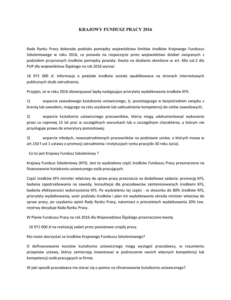KRAJOWY FUNDUSZ PRACY 2016 Rada Rynku Pracy dokonała podziału pomiędzy województwa limitów środków Krajowego Funduszu Szkoleniowego w roku 2016, co pozwala na rozpoczęcie przez województwo działań związanych z podziałem przyznanych środków pomiędzy powiaty. Kwota na działania określone w art. 69a ust.2 dla PUP dla województwa Śląskiego na rok 2016 wynosi 16 971 000 zł. Informacja o podziale środków została opublikowana na stronach internetowych publicznych służb zatrudnienia. Przyjęto, że w roku 2016 obowiązywać będą następujące priorytety wydatkowania środków KFS: 1) wsparcie zawodowego kształcenia ustawicznego, tj. pozostającego w bezpośrednim związku z branżą lub zawodem, mającego na celu uzyskanie lub uaktualnienie kompetencji do celów zawodowych; 2) wsparcie kształcenia ustawicznego pracowników, którzy mogą udokumentować wykonanie przez co najmniej 15 lat prac w szczególnych warunkach lub o szczególnym charakterze, a którym nie przysługuje prawo do emerytury pomostowej; 3) wsparcie młodych, nowozatrudnionych pracowników na podstawie umów, o których mowa w art.150 f ust 1 ustawy o promocji zatrudnienia i instytucjach rynku pracy(do 30 roku życia). Co to jest Krajowy Fundusz Szkoleniowy ? Krajowy Fundusz Szkoleniowy (KFS). Jest to wydzielona część środków Funduszu Pracy przeznaczona na finansowanie kształcenia ustawicznego osób pracujących. Część środków KFS minister właściwy do spraw pracy przeznacza na dodatkowe zadania: promocję KFS, badania zapotrzebowania na zawody, konsultacje dla pracodawców zainteresowanych środkami KFS, badania efektywności wykorzystania KFS. Po wydzieleniu tej części - w stosunku do 80% środków KFS, priorytety wydatkowania, wzór podziału środków i plan ich wydatkowania określa minister właściwy do spraw pracy, po uzyskaniu opinii Rady Rynku Pracy, natomiast o priorytetach wydatkowania 20% tzw. rezerwy decyduje Rada Rynku Pracy. W Planie Funduszu Pracy na rok 2016 dla Województwa Śląskiego przeznaczono kwotę 16 971 000 zł na realizację zadań przez powiatowe urzędy pracy. Kto może skorzystać ze środków Krajowego Funduszu Szkoleniowego? O dofinansowanie kosztów kształcenia ustawicznego mogą wystąpić pracodawcy, w rozumieniu przepisów ustawy, którzy zamierzają inwestować w podnoszenie swoich własnych kompetencji lub kompetencji osób pracujących w firmie. W jaki sposób pracodawca ma starać się o pomoc na sfinansowanie kształcenia ustawicznego? Pracodawca planujący zorganizowanie szkolenia musi złożyć do powiatowego urzędu pracy właściwego ze względu na siedzibę pracodawcy albo miejsce prowadzenia działalności wniosek o dofinansowanie kosztów kształcenia ustawicznego (art.69b ust. 1 ustawy o promocji zatrudnienia). Wniosek może być złożony w formie papierowej lub elektronicznej. Powiatowy urząd pracy powinien opracować formularz wniosku dla pracodawcy o dofinansowanie kształcenia ustawicznego ze środków KFS i udostępnić go na swojej stronie internetowej. Proponowany przez Ministerstwo wzór wniosku o dofinansowanie stanowi załącznik do niniejszych wytycznych (do ew. wykorzystania). Szczegółowy sposób i tryb przyznawania środków na kształcenie ustawiczne pracowników i pracodawców ze środków KFS określa rozporządzenie MPiPS w sprawie przyznawania środków z Krajowego Funduszu Szkoleniowego z dnia 14 maja 2014 roku.(Dz. U. poz.639). Jak uzyskać dofinansowanie: Wystarczy złożyć wniosek do właściwego urzędu pracy. Wszystkich zainteresowanych pozyskaniem dofinansowania zapraszamy do kontaktu z : [email protected] lub pod numerem telefonu 514 074 506. Napiszemy dla Państwa wniosek, możemy także przeprowadzić szkolenie.