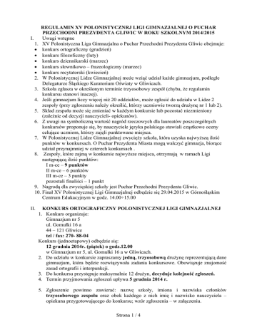 REGULAMIN XV POLONISTYCZNRJ LIGI GIMNAZJALNEJ O PUCHAR PRZECHODNI PREZYDENTA GLIWIC W ROKU SZKOLNYM 2014/2015 I. Uwagi wstępne 1. XV Polonistyczna Liga Gimnazjalna o Puchar Przechodni Prezydenta Gliwic obejmuje: • konkurs ortograficzny (grudzień) • konkurs filozoficzny (luty) • konkurs dziennikarski (marzec) • konkurs słownikowo – frazeologiczny (marzec) • konkurs recytatorski (kwiecień) 2. W Polonistycznej Lidze Gimnazjalnej może wziąć udział każde gimnazjum, podległe Delegaturze Śląskiego Kuratorium Oświaty w Gliwicach. 3. Szkoła zgłasza w określonym terminie trzyosobowy zespół (chyba, że regulamin konkursu stanowi inaczej). 4. Jeśli gimnazjum liczy więcej niż 20 oddziałów, może zgłosić do udziału w Lidze 2 zespoły (przy zgłoszeniu należy określić, którzy uczniowie tworzą drużynę nr 1 lub 2). 5. Skład zespołu może się zmieniać w każdym konkursie lub pozostać niezmieniony (zależnie od decyzji nauczycieli- opiekunów). 6. Z uwagi na symboliczną wartość nagród rzeczowych dla laureatów poszczególnych konkursów proponuje się, by nauczyciele języka polskiego stawiali cząstkowe oceny celujące uczniom, którzy zajęli punktowane miejsca. 7. W Polonistycznej Lidze Gimnazjalnej zwycięży szkoła, która uzyska najwyższą ilość punktów w konkursach. O Puchar Prezydenta Miasta mogą walczyć gimnazja, biorące udział przynajmniej w czterech konkursach . 8. Zespoły, które zajmą w konkursie najwyższe miejsca, otrzymają w ramach Ligi następującą ilość punktów: I m-ce – 9 punktów II m-ce – 6 punktów III m-ce – 3 punkty pozostali finaliści – 1 punkt 9. Nagrodą dla zwycięskiej szkoły jest Puchar Przechodni Prezydenta Gliwic. 10. Finał XV Polonistycznej Ligi Gimnazjalnej odbędzie się 29.04.2015 w Górnośląskim Centrum Edukacyjnym w godz. 14.00÷15.00 II. KONKURS ORTOGRAFICZNY POLONISTYCZNEJ LIGI GIMNAZJALNEJ 1. Konkurs organizuje: Gimnazjum nr 5 ul. Gomułki 16 a 44 – 121 Gliwice tel / fax: 270- 88-04 Konkurs (jednoetapowy) odbędzie się: 12 grudnia 2014r. (piątek) o godz.12.00 w Gimnazjum nr 5, ul. Gomułki 16 a w Gliwicach. 2. Do udziału w konkursie zapraszamy jedną, trzyosobową drużynę reprezentującą dane gimnazjum, która będzie rozwiązywała zadania konkursowe. Obowiązuje znajomość zasad ortografii i interpunkcji. 3. Do konkursu przystępuje maksymalnie 12 drużyn, decyduje kolejność zgłoszeń. 4. Termin przyjmowania zgłoszeń upływa 5 grudnia 2014 r. 5. Zgłoszenie powinno zawierać: nazwę szkoły, imiona i nazwiska członków trzyosobowego zespołu oraz obok każdego z nich imię i nazwisko nauczyciela – opiekuna przygotowującego do konkursu; wzór zgłoszenia – w załączeniu. Strona 1 / 4 6. Zgłoszenia proszę przesyłać mailem: [email protected] 7. Zadania konkursowe oceniane będą na podstawie reguł ortograficznych podanych w „Nowym słowniku ortograficznym” pod red. Edwarda Polańskiego, wydanym przez PWN; nie ma tematu przewodniego konkursu. 8. Organizatorzy konkursu: Beata Karkowska, Joanna Cichocka, Adam Barwicki. Zadania konkursowe oceniane będą na podstawie reguł ortograficznych podanych w „Nowym słowniku ortograficznym” pod red. Edwarda Polańskiego, wydanym przez PWN; nie ma tematu przewodniego konkursu. III. 1. 2. 3. 4. 5. KONURS FILOZOFICZNY Konkurs odbędzie się w Górnosląckim Centrum Edukacyjnym 25.02.2015 godz 13.00 ÷15.00 Organizatorzy: Barbara Szczepaniak, Aleksandra Biernacka-Świerc Uczestnicy konkursu rozwiązują przygotowany test dotyczący ogólnej wiedzy na temat filozofii oraz odpowiadają na pytania sprawdzające zrozumienie podanego eseju filozoficznego (czytanie ze zrozumieniem). W konkursie biorą udział zespoły trzyosobowe zgłoszone przez szkoły Zgłoszenia przyjmowane do 23.02.2015 na adres: (listownie)Górnośląskie Centrum Edukacyjne ul. Okrzei 20 44-100 Gliwice (lub e-mail) [email protected] IV. KONKURS SŁOWNIKOWO – FRAZEOLOGICZNY 1. Konkurs odbędzie się: • 4.03.2015r. godz 1300 2. Organizator. Gimnazjum nr 3 im. Noblistów Polskich ul. Jasnogórska 15-17 44-100 Gliwice tel./fax 032 231 25 61 e – mail [email protected] 3. Temat konkursu: "Obraz liczbą malowany. Matematyka i sztuki plastyczne w słownictwie i frazeologii" obejmuje słownictwo i frazeologię dotyczące tej problematyki 4. Miejsce konkursu: Gimnazjum nr 3 im. Noblistów Polskich ul. Jasnogórska 15-17 44-100 Gliwice 5. Konkurs jest jednoetapowy: Organizatorami konkursu są poloniści Gimnazjum nr 3: A. Cira, I. Przybysławska-Pałka, E. Wilewska-Sosna, A. Seredyńska-Spieszko BIBLIOGRAFIA • Bąba S., Liberek J., Słownik frazeologiczny współczesnej polszczyzny, Warszawa 1995. • Dąbrówka A., Geller E., Turczyn R., Słownik synonimów, Warszawa 1997. • Kajetanowicz H., Licz się ze słowami. Ćwiczenia leksykalne i frazeologiczne, Gdańsk 1998. • Kłosińska A., Słownik frazeologiczny, Warszawa 2005. • Kopaliński W., Słownik mitów i tradycji kultury. Strona 2 / 4 • • • • Nowa księga przysłów i wyrażeń przysłowiowych, red. Krzyżanowski J., Warszawa 1972. Nowy Słownik poprawnej polszczyzny, red. Markowski A., Warszawa 2002. Polański E., Iwanowicz M., Słownictwo i frazeologia w szkole, Łódź 1999. Skorupka S., Słownik frazeologiczny języka polskiego, Warszawa 1989. V. KONKURS DZIENNIKARSKI 1. Uczestnicy konkursu redagują teksty o charakterze publicystycznym (esej, reportaż, wywiad, recenzja, felieton). 2. Każdy artykuł powinien być zapisany czcionką Times New Roman, rozmiar 12, ilość stron- maksymalnie 3 (A4). 3. Każda szkoła przekazuje jury 3 prace napisane przez 3 uczniów. 4. Prace należy podpisać pseudonimem i dołączyć do nich zaklejoną kopertę z wypełnioną tabelą: IMIĘ, NAUCZYCIELPSEUDONIM NAZWISKO KLASA SZKOŁA -OPIEKUN UCZNIA 5. Konkurs organizuje, przy współpracy z „Nowinami Gliwickimi”, Publiczne Gimnazjum w Rudzińcu ul Gliwicka 5 44-160 Rudziniec tel: 032 230-31-9