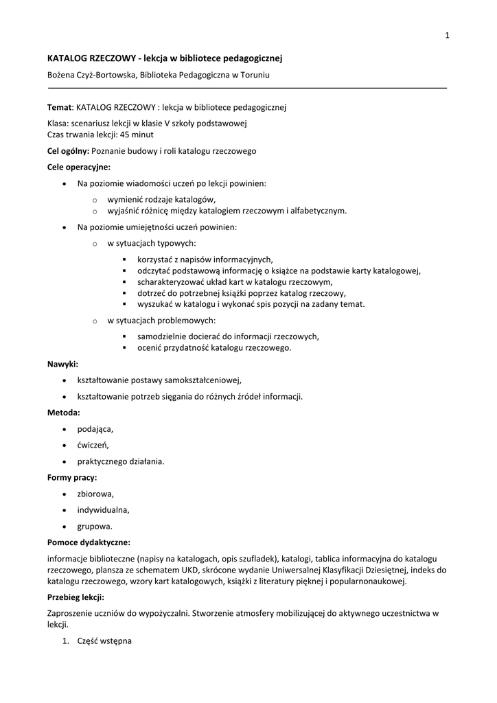 1 KATALOG RZECZOWY - lekcja w bibliotece pedagogicznej Bożena Czyż-Bortowska, Biblioteka Pedagogiczna w Toruniu Temat: KATALOG RZECZOWY : lekcja w bibliotece pedagogicznej Klasa: scenariusz lekcji w klasie V szkoły podstawowej Czas trwania lekcji: 45 minut Cel ogólny: Poznanie budowy i roli katalogu rzeczowego Cele operacyjne: • Na poziomie wiadomości uczeń po lekcji powinien: o o • wymienić rodzaje katalogów, wyjaśnić różnicę między katalogiem rzeczowym i alfabetycznym. Na poziomie umiejętności uczeń powinien: o w sytuacjach typowych: o korzystać z napisów informacyjnych, odczytać podstawową informację o książce na podstawie karty katalogowej, scharakteryzować układ kart w katalogu rzeczowym, dotrzeć do potrzebnej książki poprzez katalog rzeczowy, wyszukać w katalogu i wykonać spis pozycji na zadany temat. w sytuacjach problemowych: samodzielnie docierać do informacji rzeczowych, ocenić przydatność katalogu rzeczowego. Nawyki: • kształtowanie postawy samokształceniowej, • kształtowanie potrzeb sięgania do różnych źródeł informacji. Metoda: • podająca, • ćwiczeń, • praktycznego działania. Formy pracy: • zbiorowa, • indywidualna, • grupowa. Pomoce dydaktyczne: informacje biblioteczne (napisy na katalogach, opis szufladek), katalogi, tablica informacyjna do katalogu rzeczowego, plansza ze schematem UKD, skrócone wydanie Uniwersalnej Klasyfikacji Dziesiętnej, indeks do katalogu rzeczowego, wzory kart katalogowych, książki z literatury pięknej i popularnonaukowej. Przebieg lekcji: Zaproszenie uczniów do wypożyczalni. Stworzenie atmosfery mobilizującej do aktywnego uczestnictwa w lekcji. 1. Część wstępna 2 Swobodna rozmowa na temat różnych sposobów poszukiwania książek w bibliotece szkolnej i w bibliotekach publicznych ( książkę podaje bibliotekarz, wybór książki z półki, wybór książki poprzez katalogi). Uczniowie odpowiadają na pytania: o Znaczenie słowa "katalog" ? - spis książek ułożony w określonym porządku ze wskazaniem miejsca na półce. o Czym jest katalog alfabetyczny ? - spis książek ułożony alfabetycznie według haseł autorskich lub tytułowych, jeśli dzieła nie mają oznaczonego autora. o Kiedy z niego korzystamy ? - jeśli znany jest autor lub tytuł pracy zbiorowej. o Jakie wiadomości zawiera karta katalogowa ? - zawiera najważniejsze informacje o książce. o Jaką rolę pełni sygnatura ? - jest znakiem miejsca książki na półce. 2. Część zasadnicza: Na lekcji uczniowie poznają budowę i funkcję katalogu rzeczowego. Nauczą się kiedy i jak z niego korzystać. Nauczyciel informuje uczniów: - Czytelnik sięga do katalogu rzeczowego, grupującego książki według ich treści, jeśli potrzebuje książki z określonej dziedziny wiedzy na określony temat, a nie wie lub nie pamięta, kto taką książkę napisał i nie zna jej tytułu. W bibliotekach można zetknąć się z różnymi rodzajami katalogów rzeczowych, np.: o działowy literatury pięknej ( ułożony wg działów literatury pięknej oznaczonych symbolami literowymi - w bibliotece szkolnej), o przedmiotowy (ułożony alfabetycznie według tematów - haseł przedmiotowych przypomina encyklopedię ogólną), o systematyczny (układ wielostopniowy, prowadzi od pojęć ogólnych do coraz bardziej szczegółowych). W bibliotekach pedagogicznych i szkolnych stosuje się katalog rzeczowy systematyczny oparty na Uniwersalnej Klasyfikacji Dziesiętnej. Kolejnym etapem działań nauczyciela jest pokaz planszy i omówienie tablicy informacyjnej przedstawiających podział piśmiennictwa według UKD: o Co to jest UKD ? - System uniwersalny obejmujący całość wiedzy ludzkiej. Podstawową cechą jest podział dziesiętny, z którego wynika nieograniczona rozbudowa systemu w pionie. Sztuczny podział całości na 1p działów narzuca tę samą metodę postępowania na wszystkich szczeblach podziału (ilustracją tej części wykładu jest plansza ze schematem UKD). o Struktura UKD Całą wiedzę podzielono na 1p działów głównych (pierwszy stopień rozbudowy) : 1. Zagadnienia ogólne 2. Filozofia 3. Religia. Teologia 3 4. Nauki społeczne. Prawo Administracja 5. Dział wolny 6. Matematyka. Nauki przyrodnicze 7. Nauki stosowane. Medycyna. Technika. Rolnictwo 8. Sztuka. Architektura. Rzemiosło artystyczna. Fotografia. Muzyka. Teatr. Gry. Sport 9. Języki. Lingwistyka. Literatura piękna 1p. Geografia. Biografie. Historia. Każdy z tych działów może być podzielony na działy podrzędne drugiego stopnia rozbudowy, np. Matematyka 5 5p Ogólne zagadnienia nauk matematycznych i przyrodniczych 51 Matematyka 52 Astronomia. Geodezja. Kartografia. Chronologia 53 Fizyka 54 Chemia teoretyczna. Krystalografia. Mineralogia 55 Geologia i nauki pokrewne. Meteorologia 56 Paleontologia 57 Nauki biologiczne 58 Botanika 59 Zoologia Można też wprowadzać podziały podrzędne trzeciego lub nawet czwartego stopnia rozbudowy, oznaczone symbolami trzy- lub czterocyfrowymi, np. 51 Matematyka 51p Matematyka ogólnie. Podstawy. Logika 511 Arytmetyka. Teoria liczb .1 Arytmetyka elementarna .2 Elementarna teoria liczb W UKD zastosowano szeroko rozbudowany system symboli wspólnych. Przy klasyfikacji bibliotekarz posługuje się tablicami opatrzonymi indeksem przedmiotowym (nauczyciel pokazuje skrócone tablice UKD ). Alfabetycznie ułożony indeks ułatwia dotarcie do właściwych symboli cyfrowych. Okazanie książek z kilkoma symbolami klasyfikacyjnymi uświadomi uczniom fakt, że jedna książka może być zaszeregowana do kilku działów. ĆWICZENIA PRAKTYCZNE: Uczniowie otrzymują schemat tablicy informacyjnej do katalogu i wykonują następujące polecenia: • wskaż skrzynki katalogowe odpowiadające działom głównym z tablicy informacyjnej UKD, • wskaż skrzynki katalogowe z działem 5, a potem odszukaj szufladkę z poddziałem 51, • porównaj schemat podziału UKD na planszy z układem kart katalogowych w skrzynce
